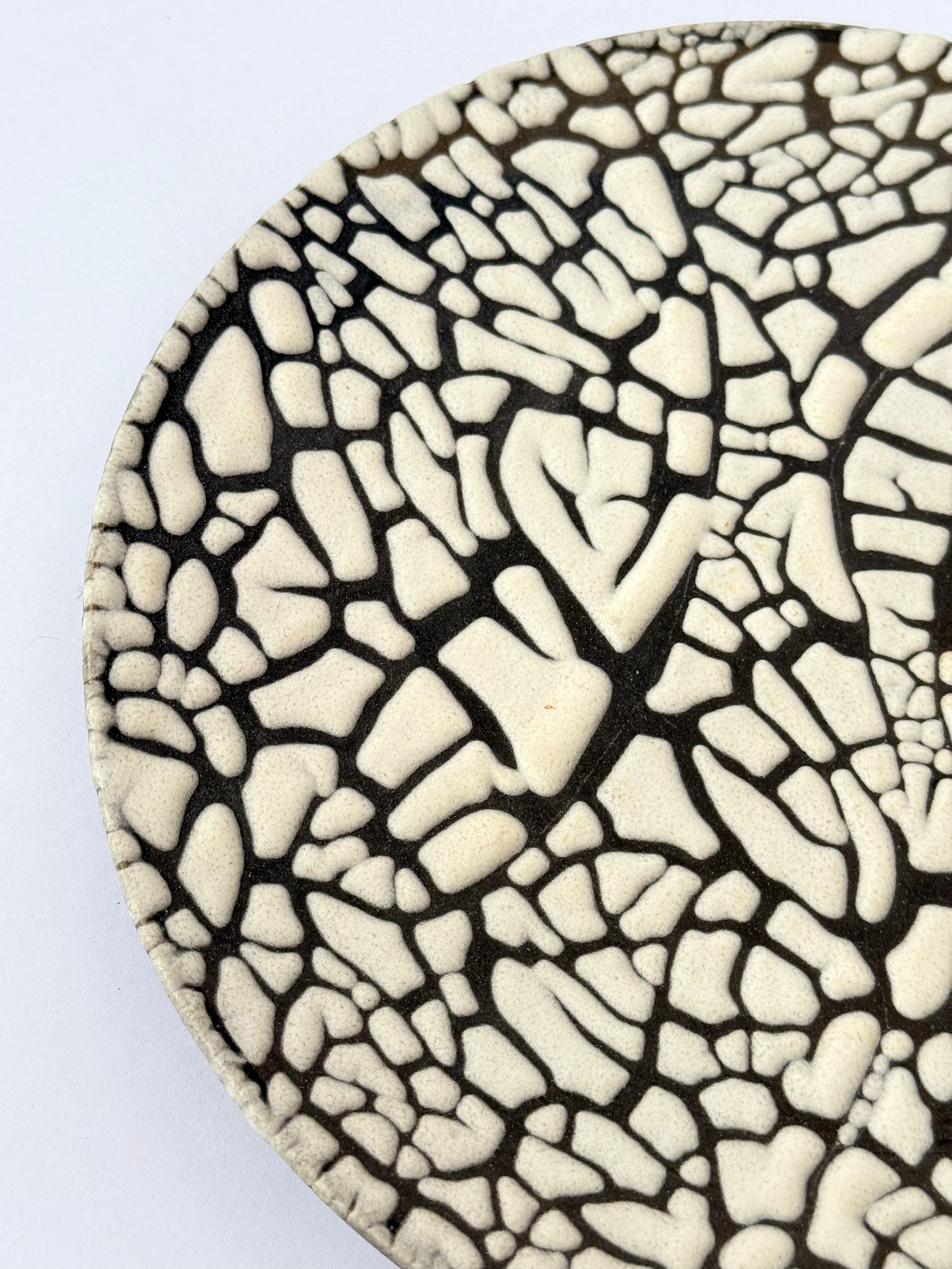 Kirk Belding platter in Stoney black crackle, combining rustic texture with refined artisanal design. Ideal for serving or as a striking decorative centerpiece.