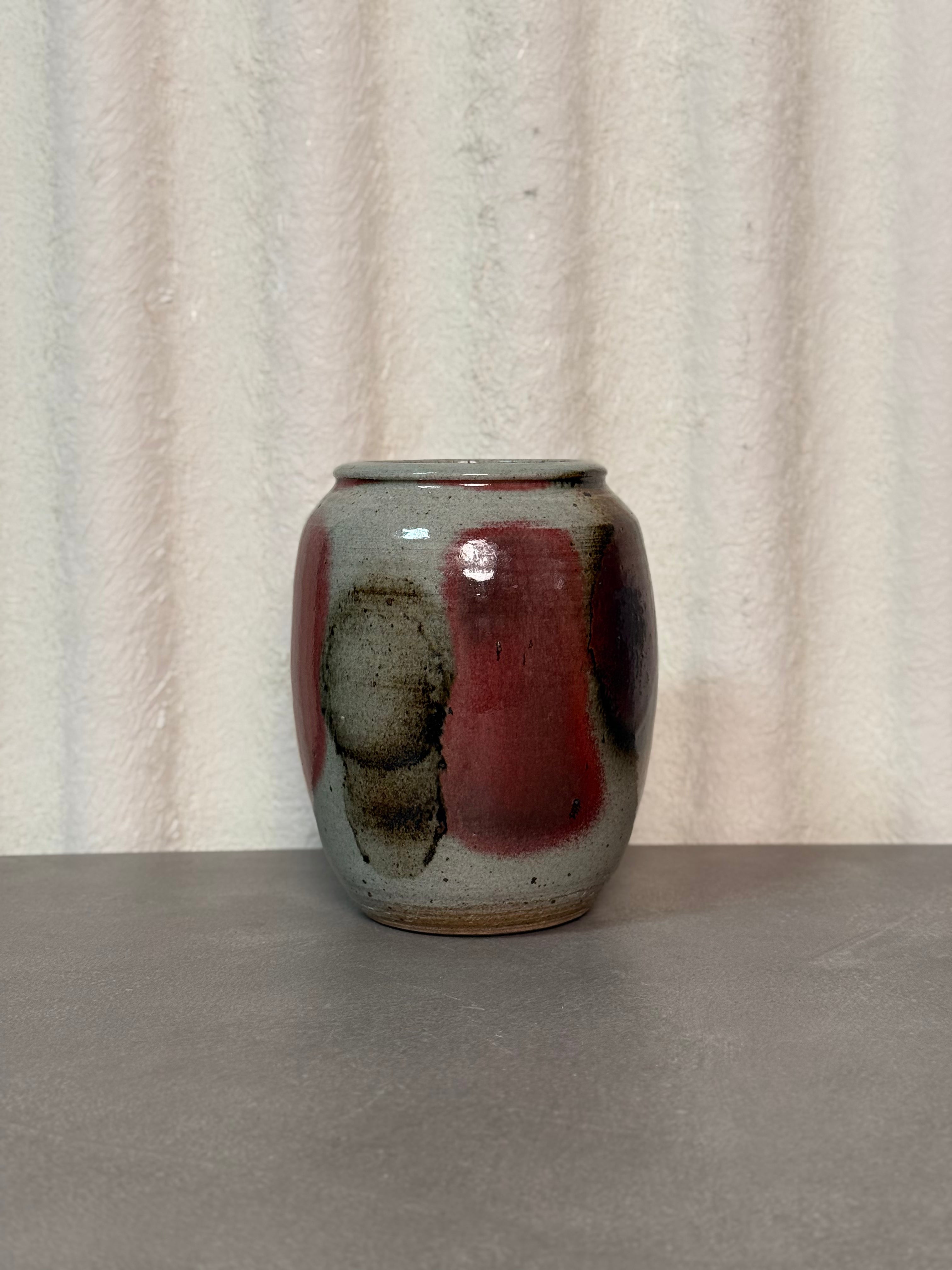 A signed studio pottery vase featuring a striking abstract glaze in earthy tones of brown, green, and deep red. The high-gloss finish enhances the fluid, painterly design, giving it a bold modernist character. Hand-thrown and uniquely glazed, this collectible piece showcases the individuality and craftsmanship of studio ceramics.