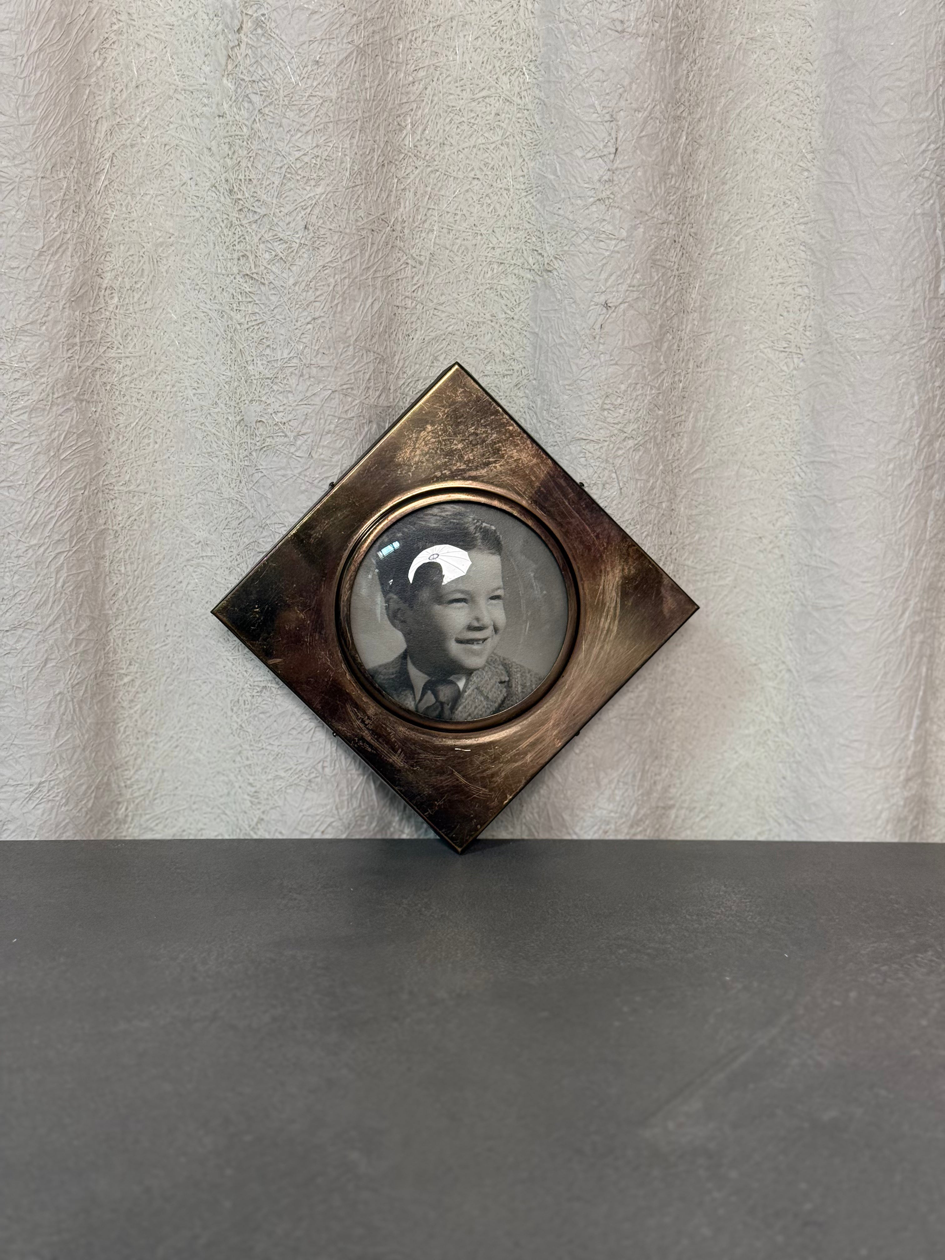 Antique brass photo frame with a round opening, perfect for displaying vintage portraits or cherished family photographs. Its aged patina adds warmth and character, making it an ideal piece for classic décor.