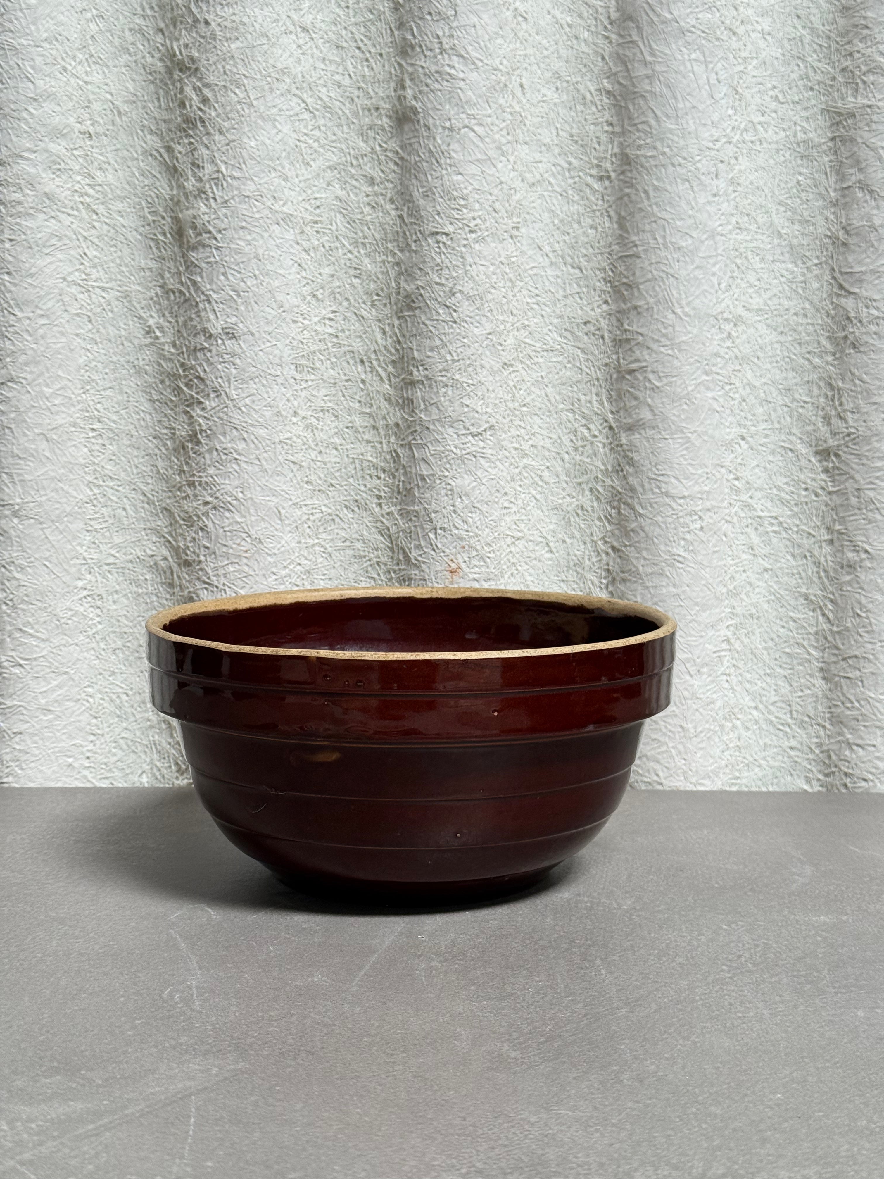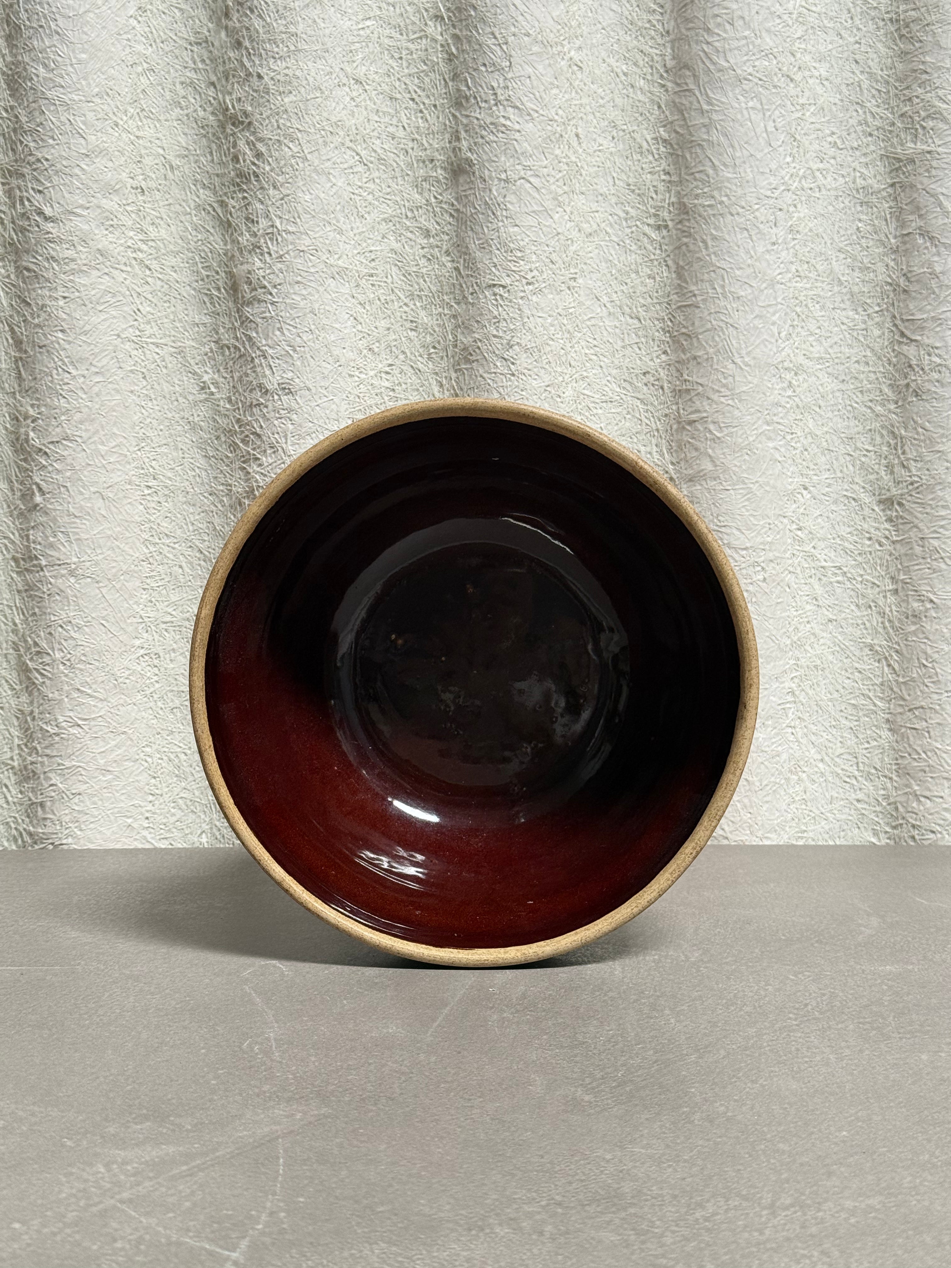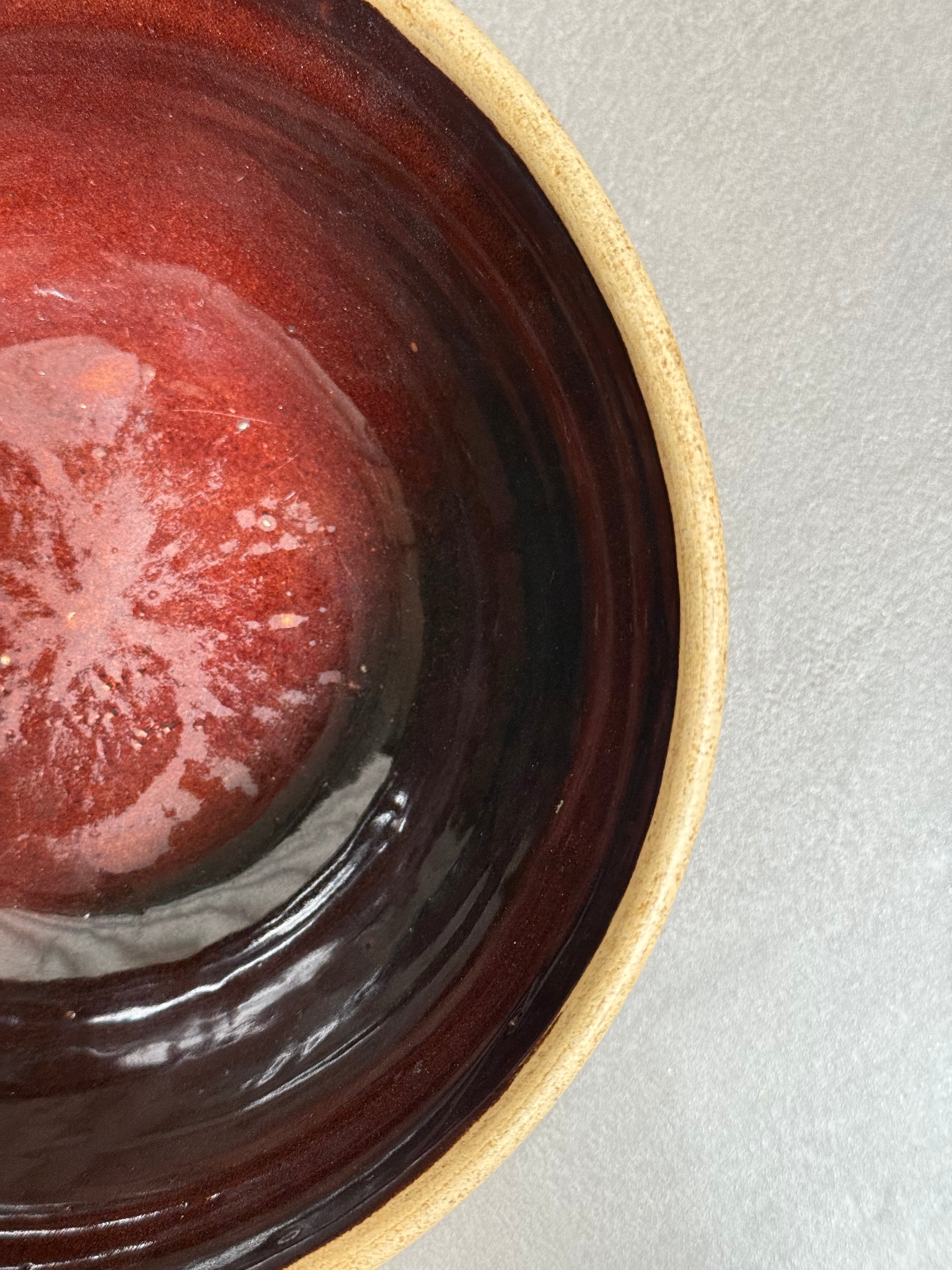 A generously sized hand-thrown stoneware mixing bowl, finished in a rich, glossy burgundy glaze with a contrasting raw stoneware rim. The wide opening and sturdy base make it ideal for food preparation, serving, or as a decorative centerpiece. Subtle throwing rings add texture and visual depth to the design.