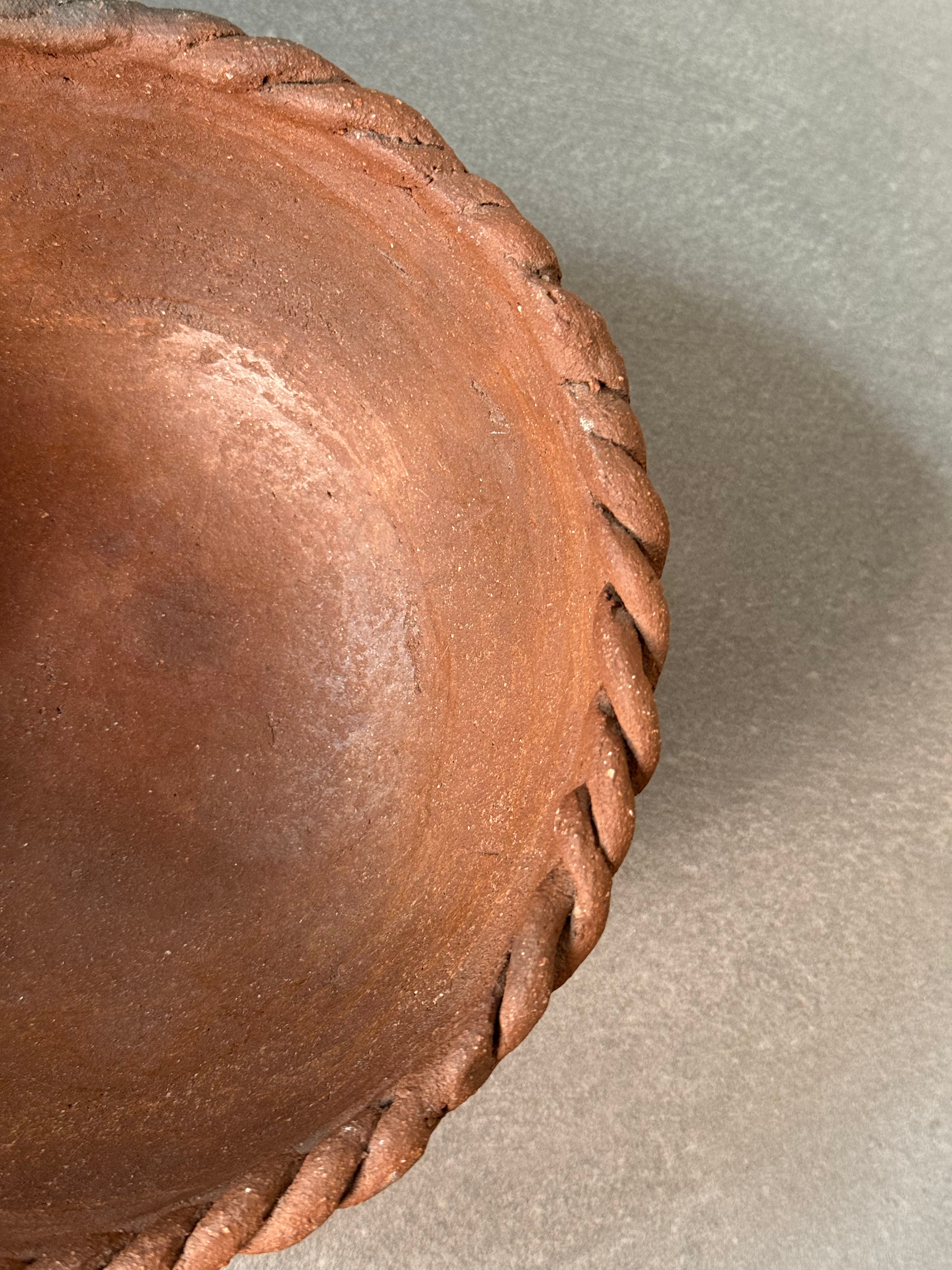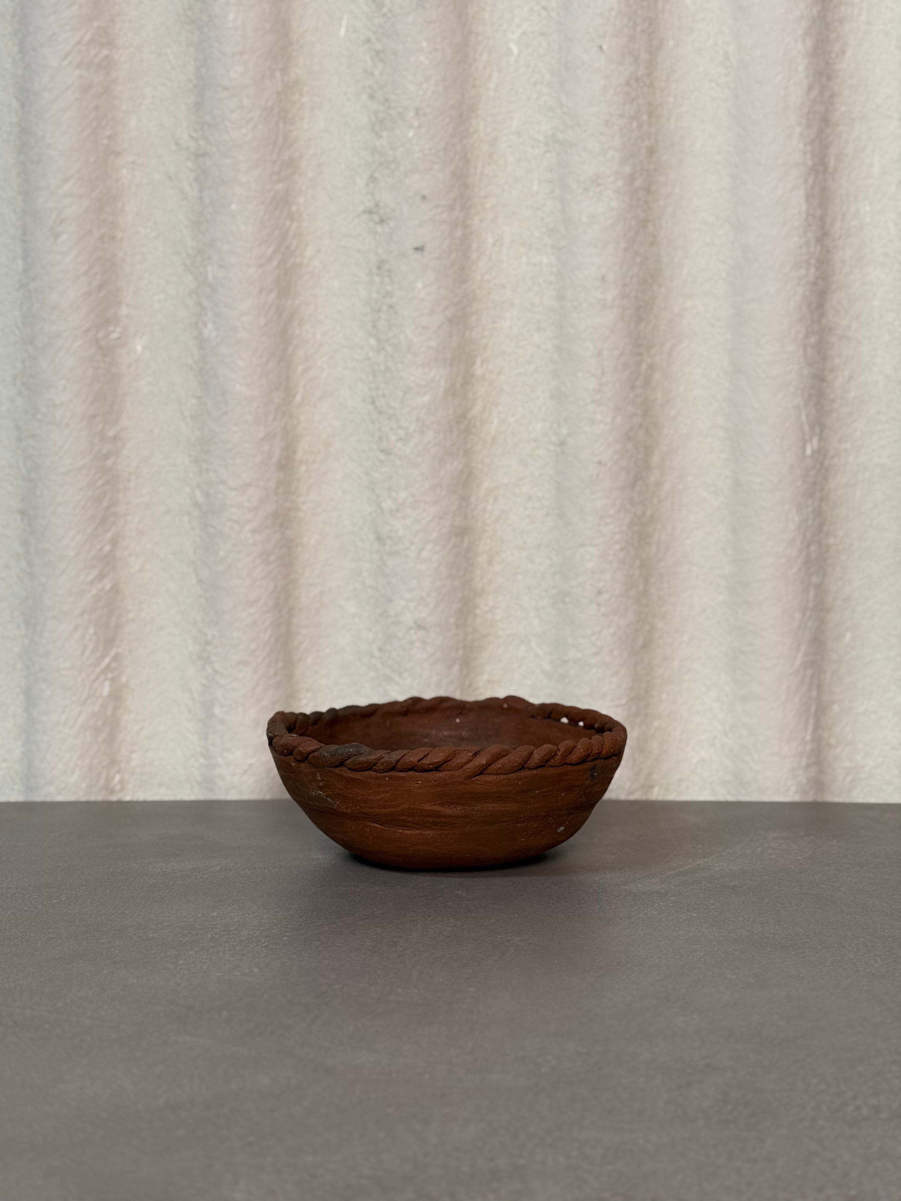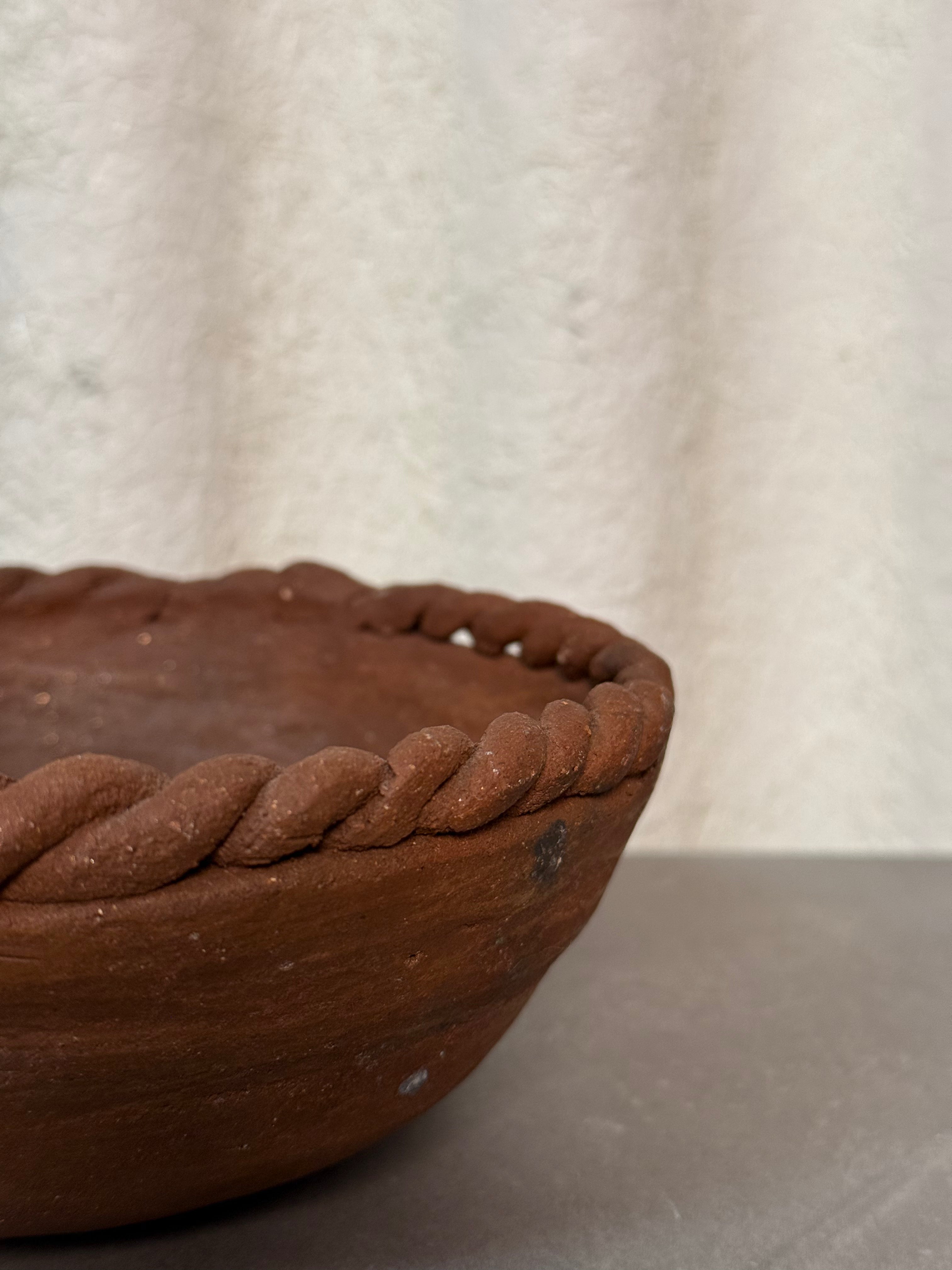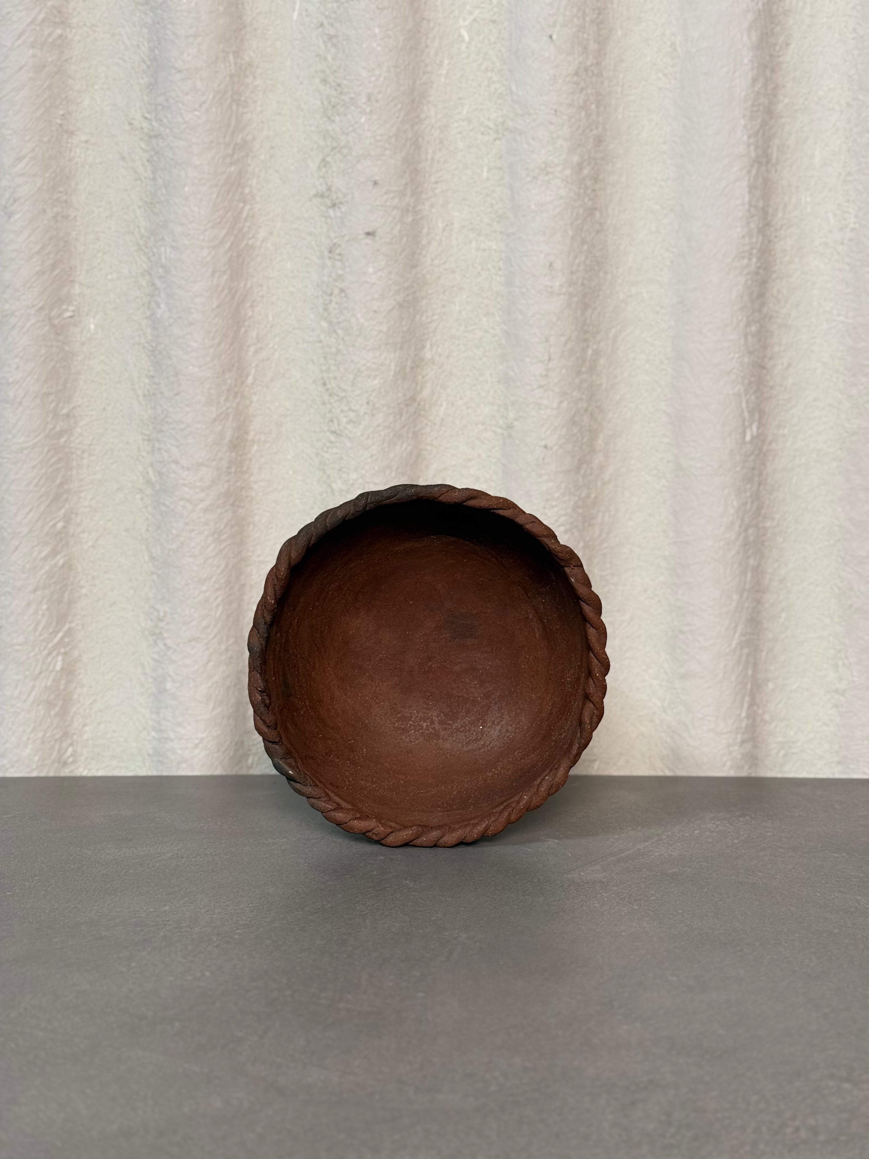 Hand-formed clay bowl featuring a twisted braid rim detail. A simple, earthy vessel that reflects traditional pottery craftsmanship.