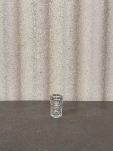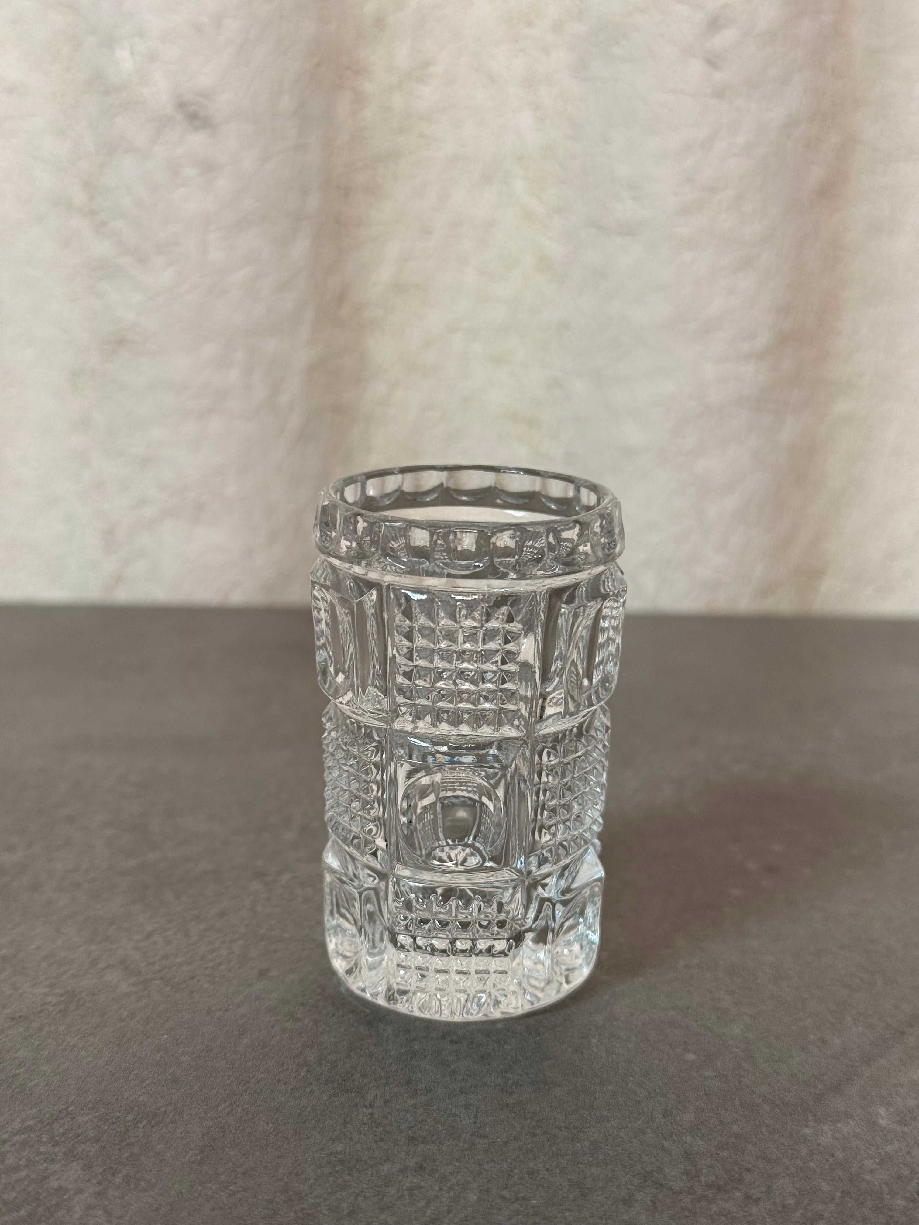 Crystal toothpick holder with intricate faceted design, clear cut glass construction. Compact and decorative, perfect for dining table settings or vintage glassware collections.