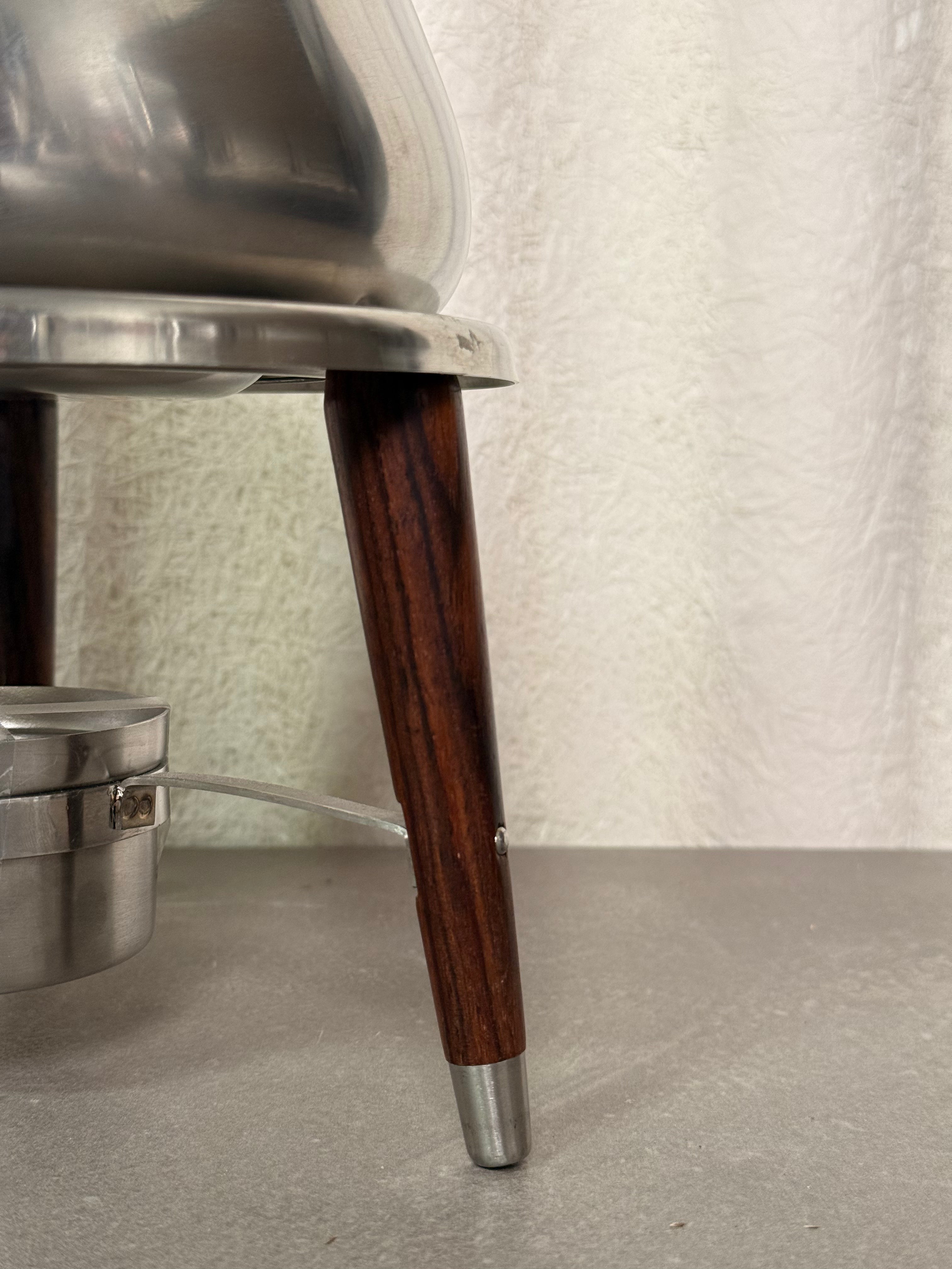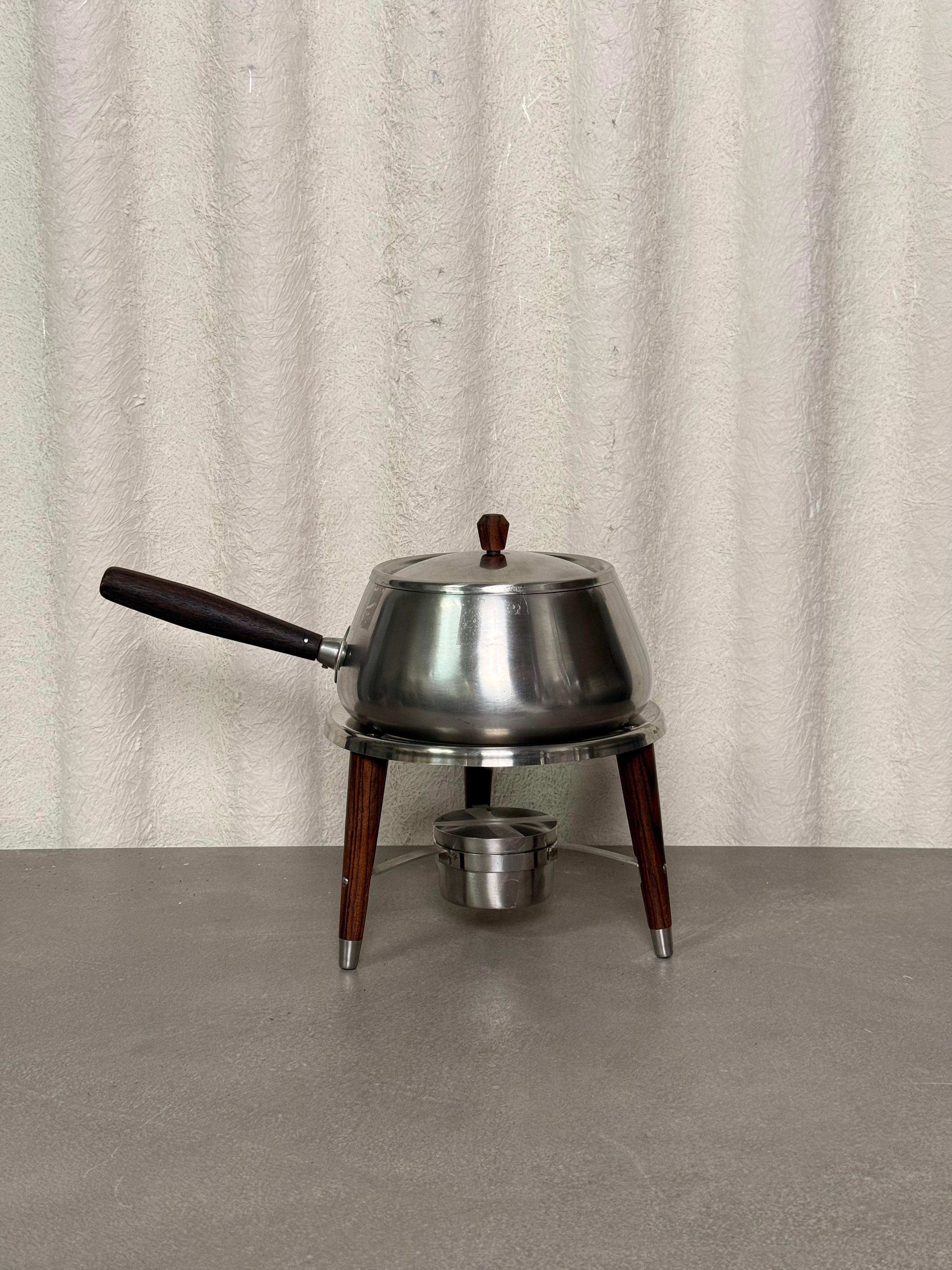 Classic silver metal fondue pot with a handle and fuel stand perfect for melting cheese, chocolate, or sauces. Ideal for entertaining, this elegant piece adds a touch of sophistication to dinner parties or casual gatherings, combining functionality with timeless style for any tabletop setting.
