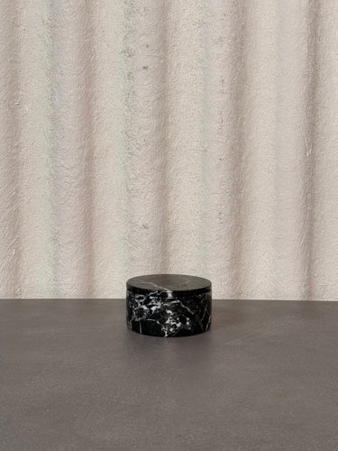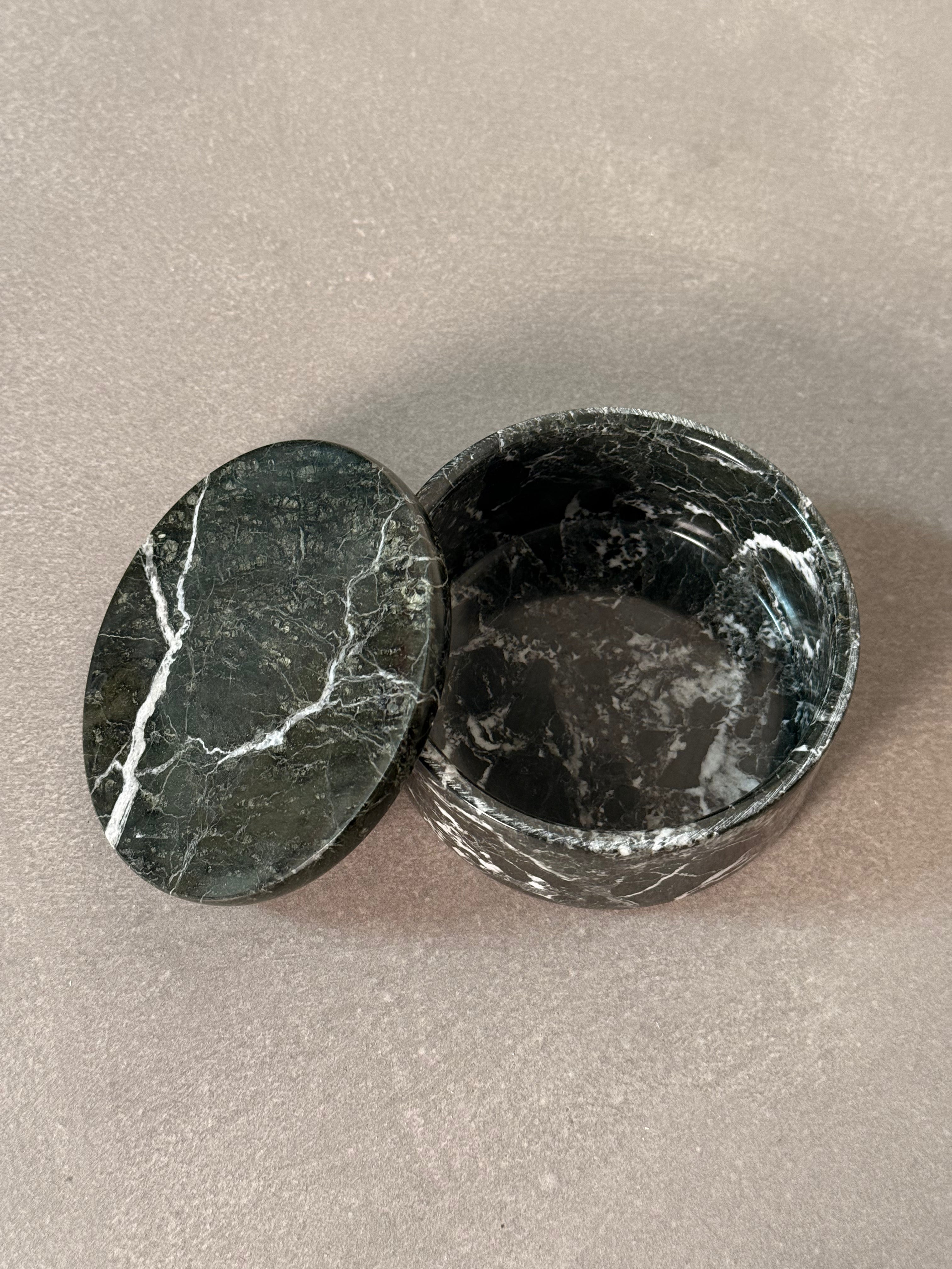 A sleek and heavy round storage box crafted from polished granite with striking white veining. Functional yet decorative, it’s ideal for storing jewelry, keepsakes, or small desk items while adding a touch of natural elegance to any space.
