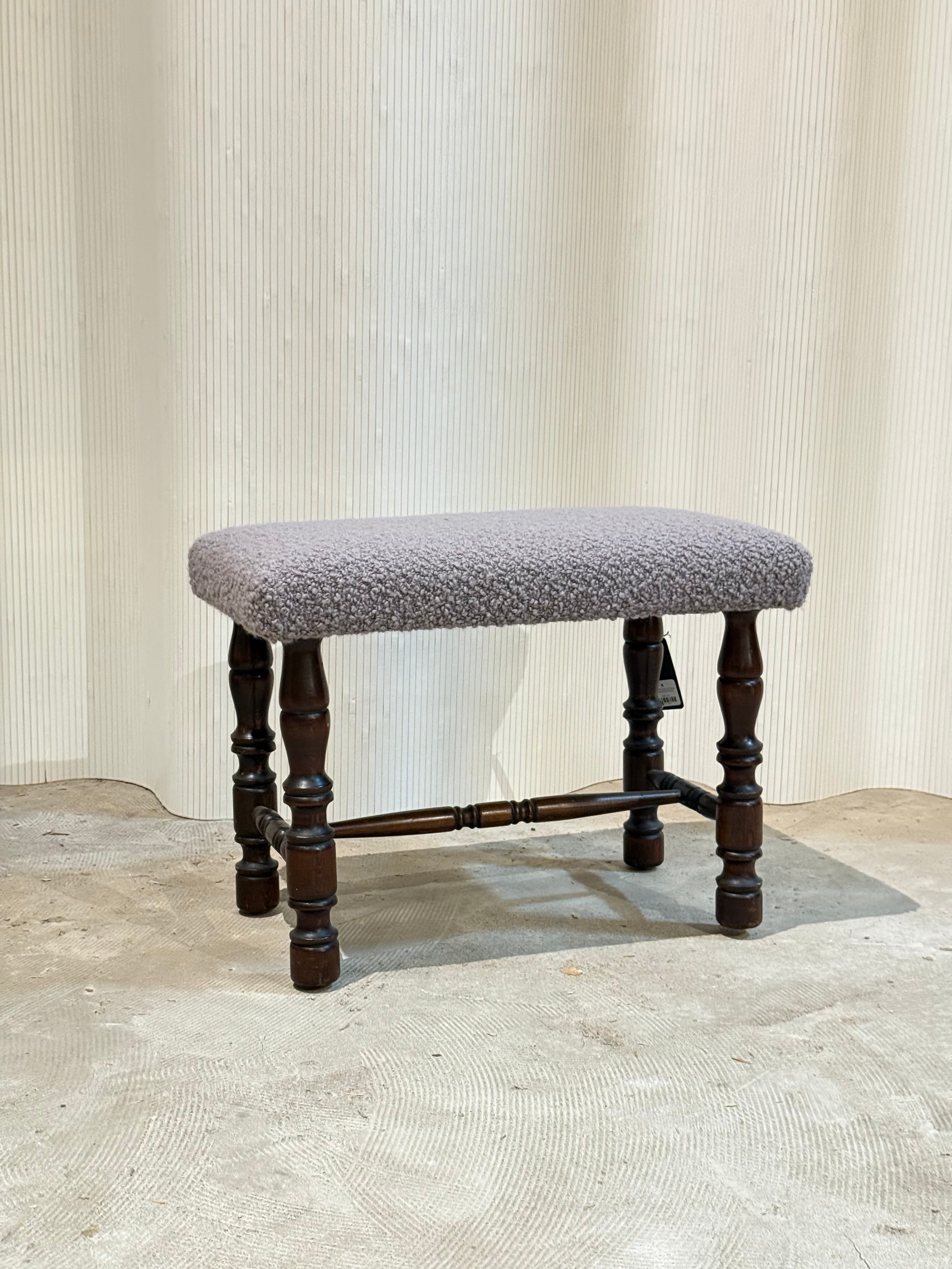 The Gray Boucle Antique Stool features vintage design and new, high-quality upholstery.
