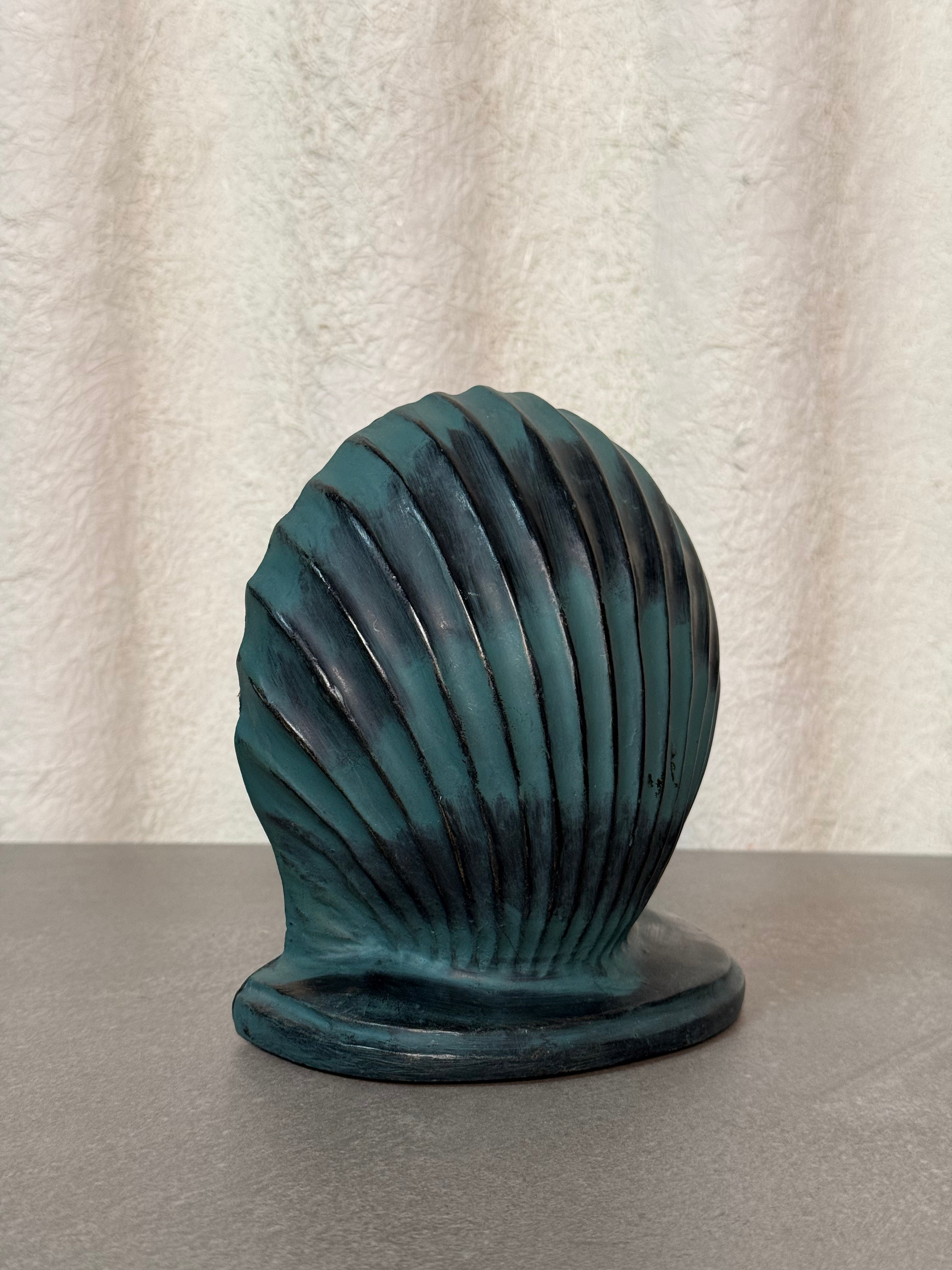 These vintage ceramic bookends feature a bold seashell design in a deep green glaze with subtle black accents that highlight the ridged details. Their weighty ceramic build ensures sturdy support while doubling as decorative art pieces.