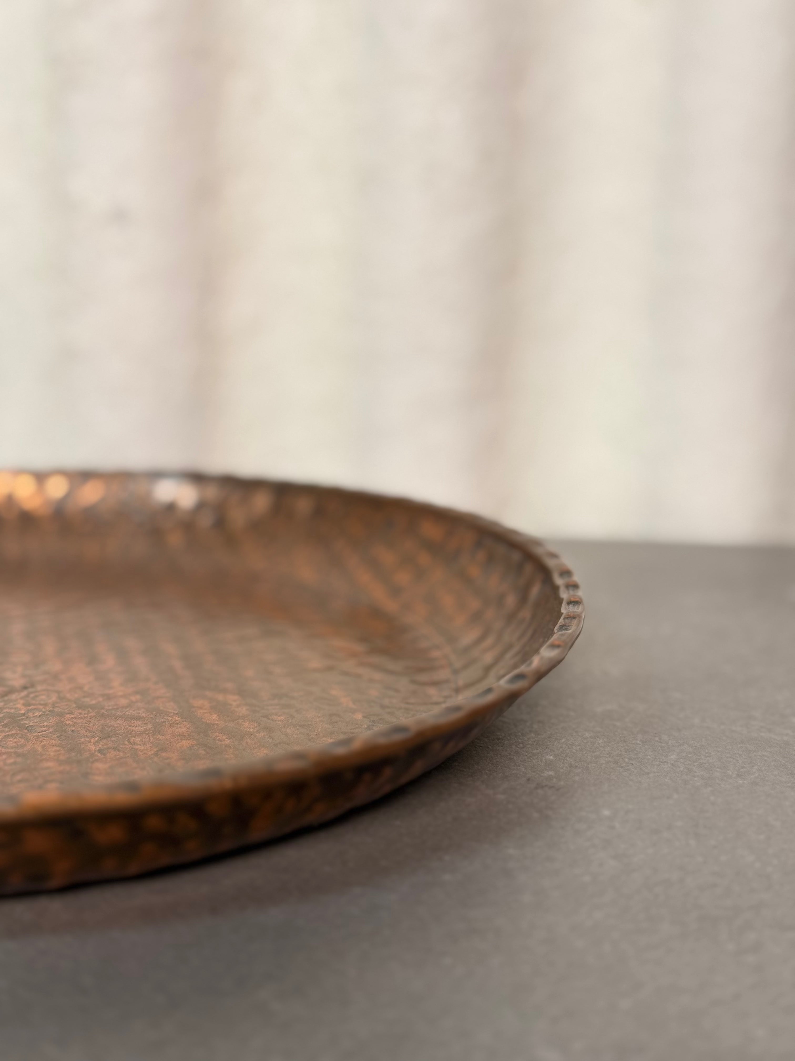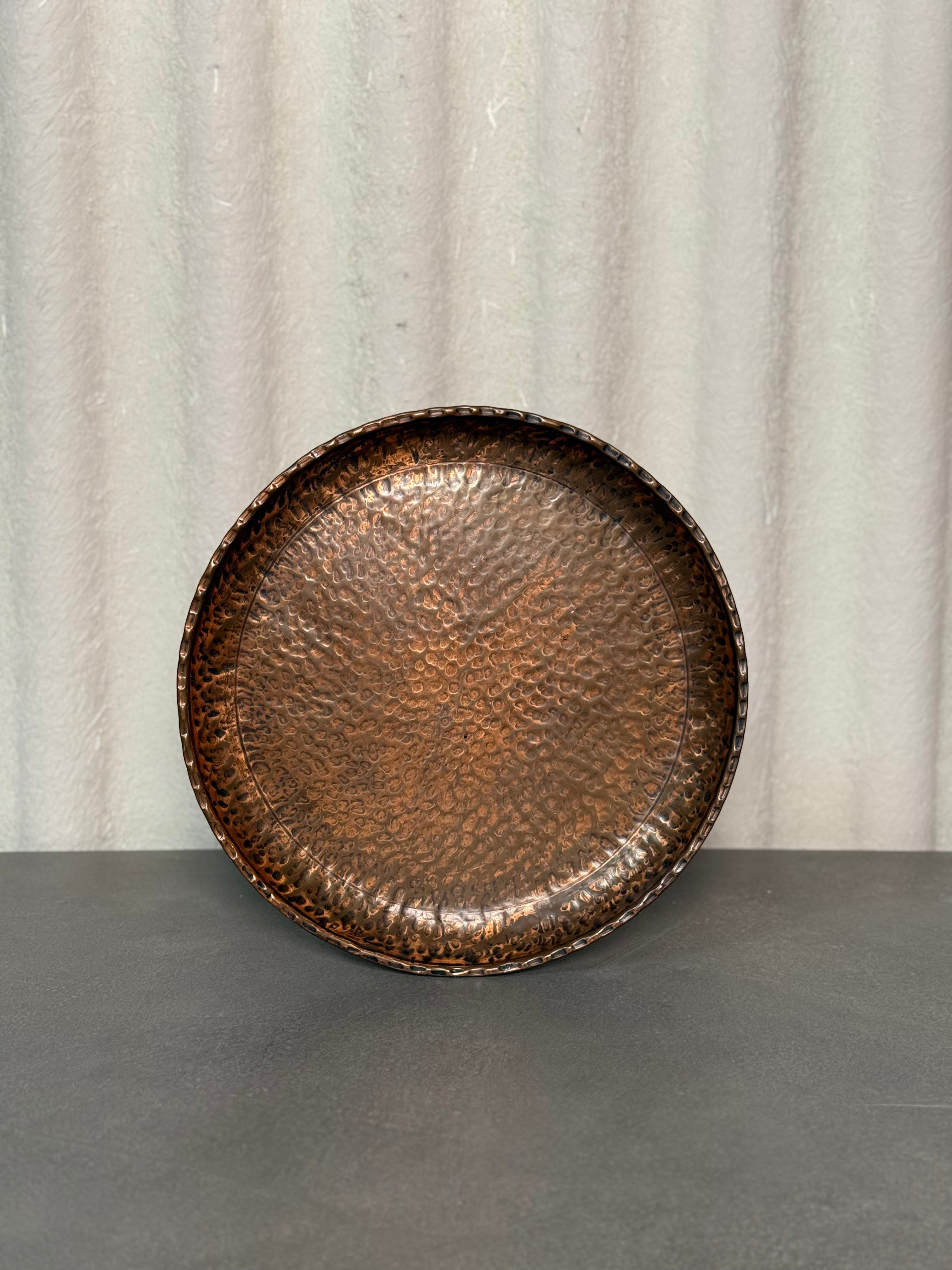 Beautifully hand-crafted vintage hammered copper tray with a warm patina and detailed texture. Perfect as a serving tray, centerpiece, or decorative wall display, this piece brings timeless character to any home. Sturdy, collectible, and full of artisanal charm.