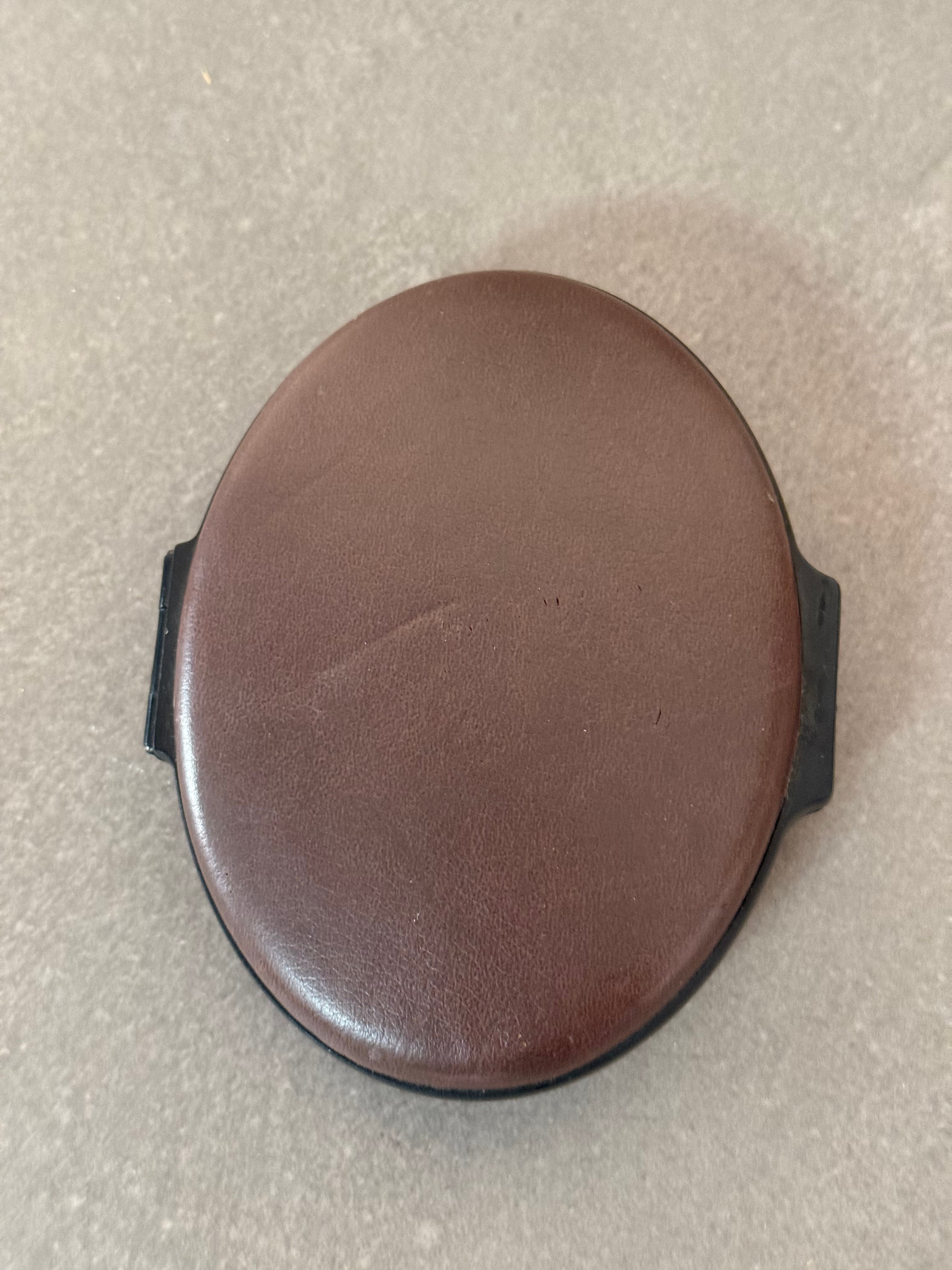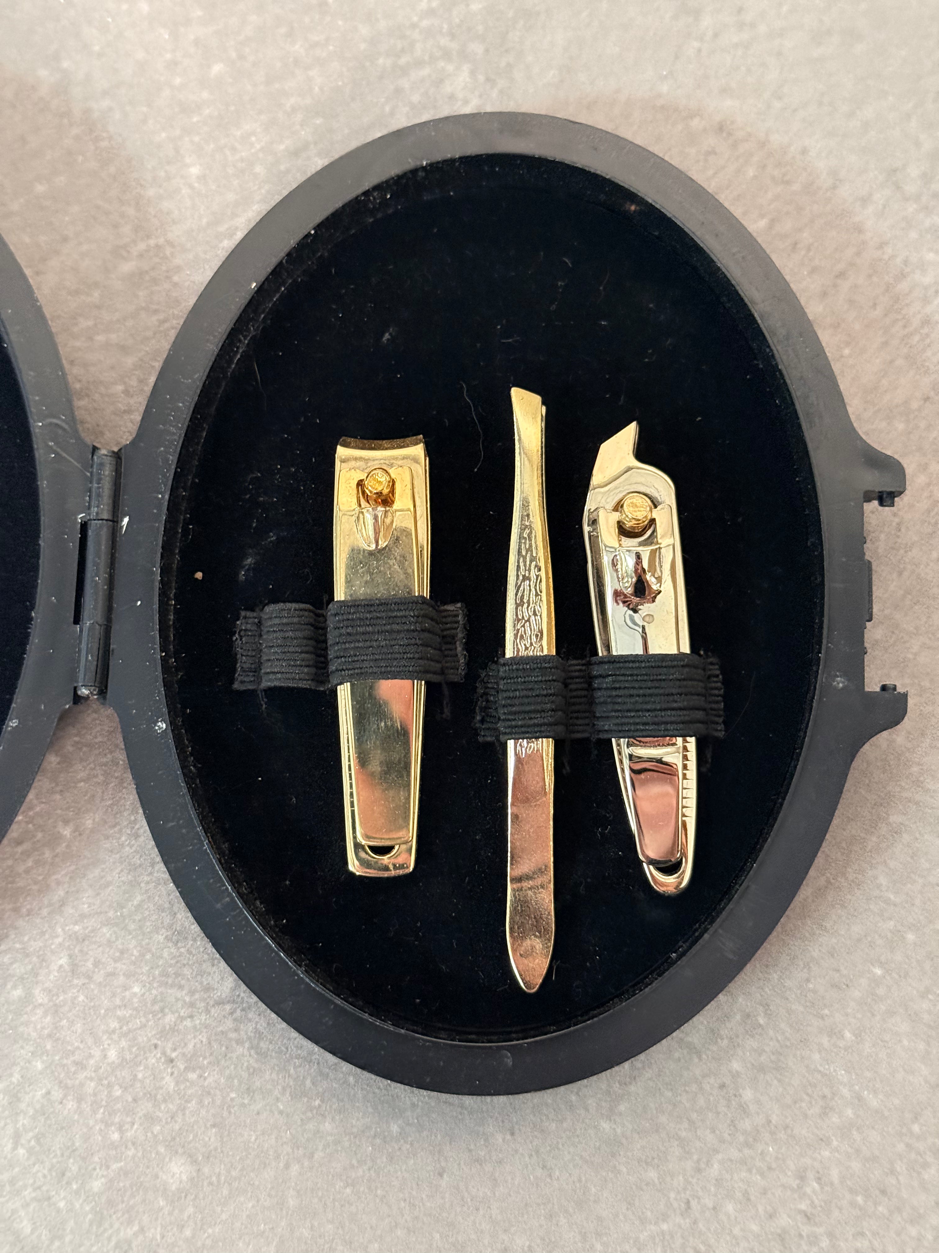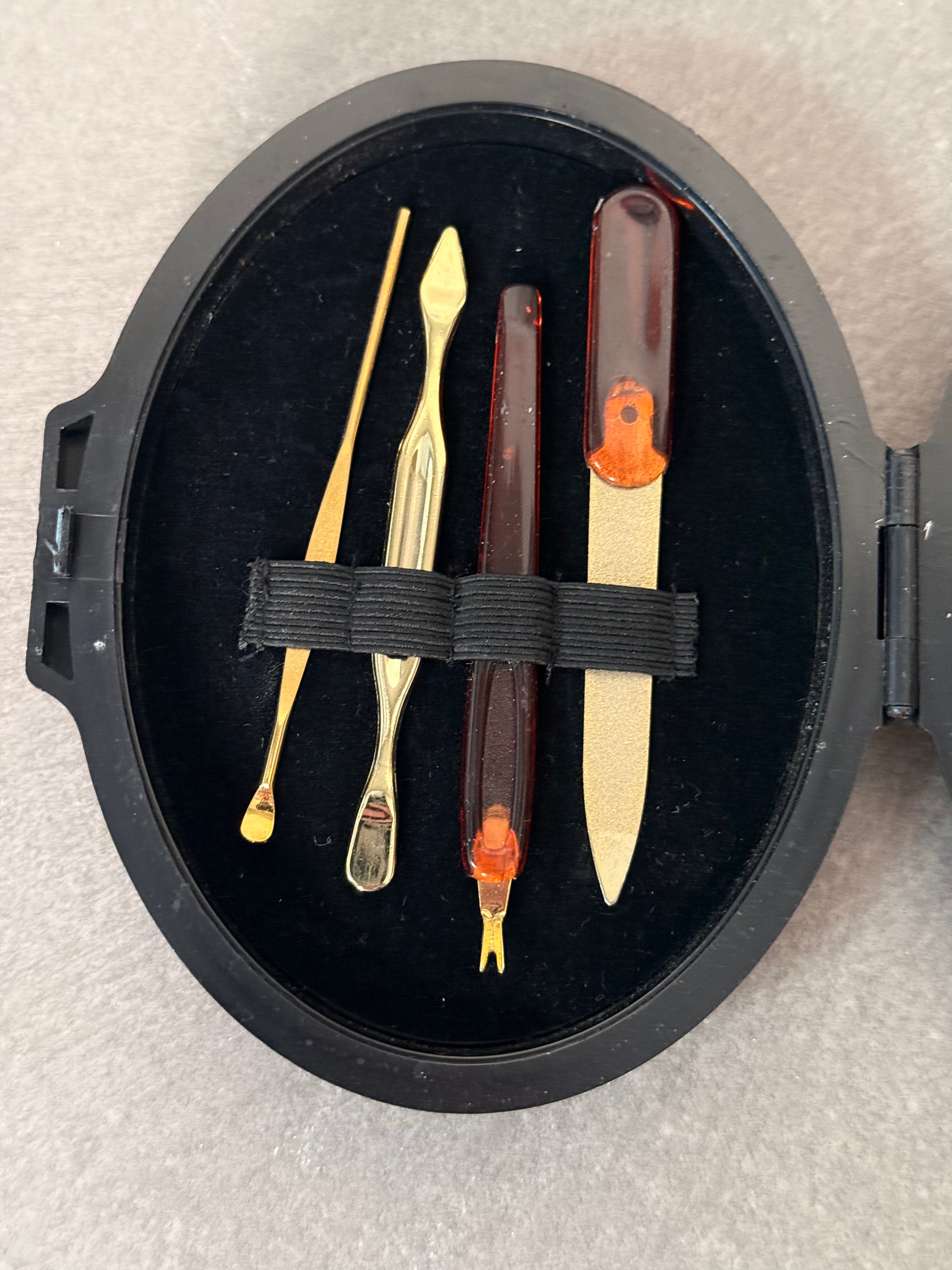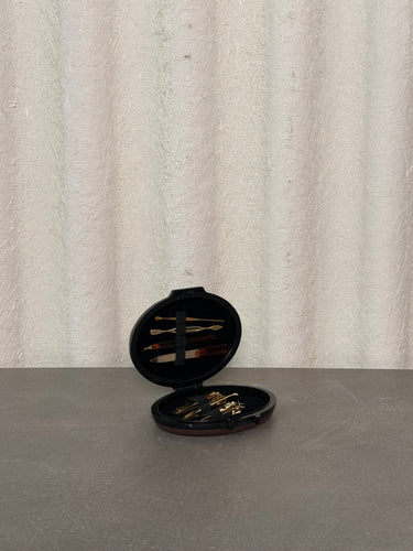 Classic vintage manicure set in an oval leather case with velvet lining. Includes gold-tone grooming tools and tortoiseshell-style handles secured by elastic bands. A refined collectible accessory with timeless craftsmanship and travel-ready elegance.