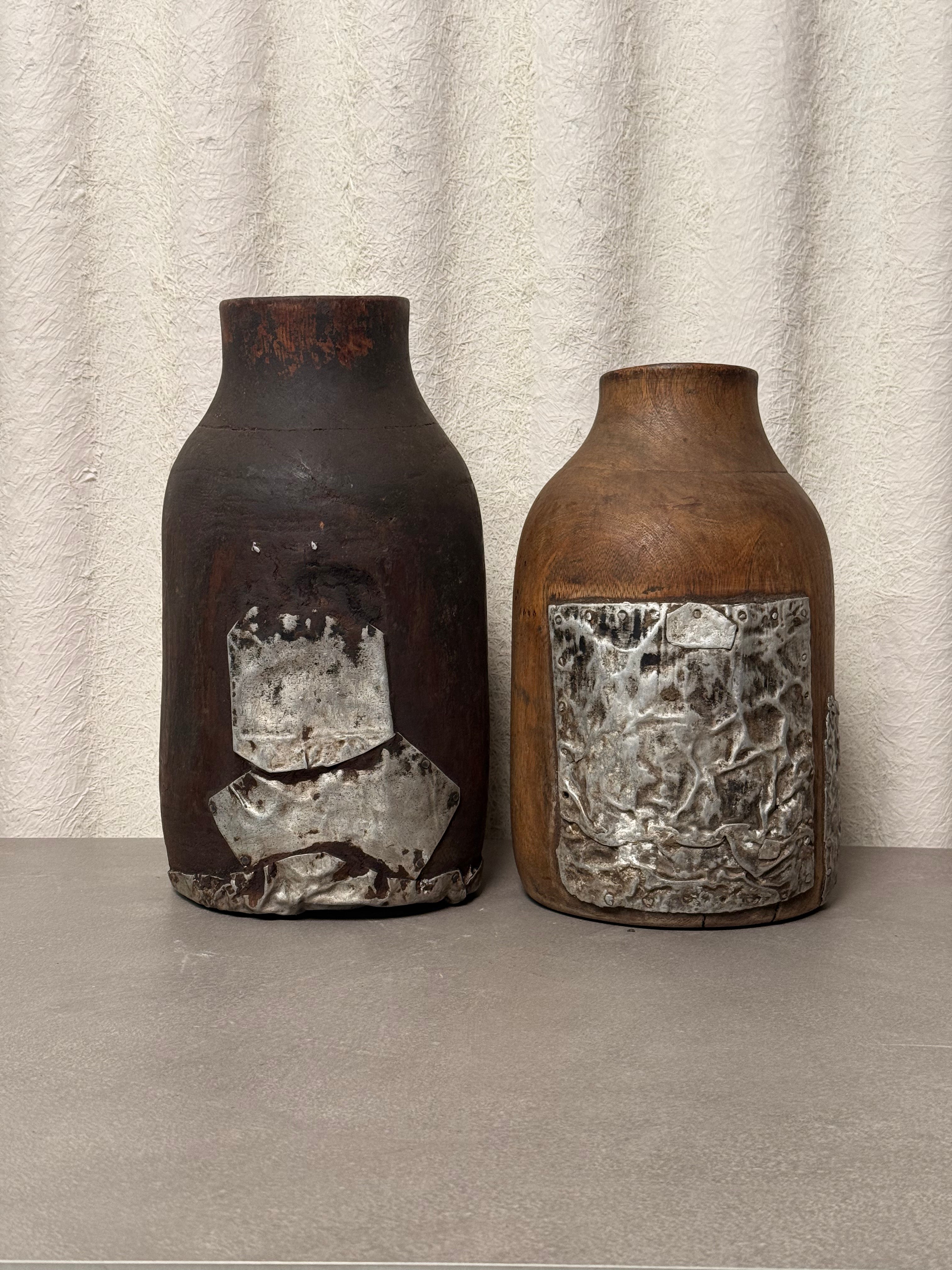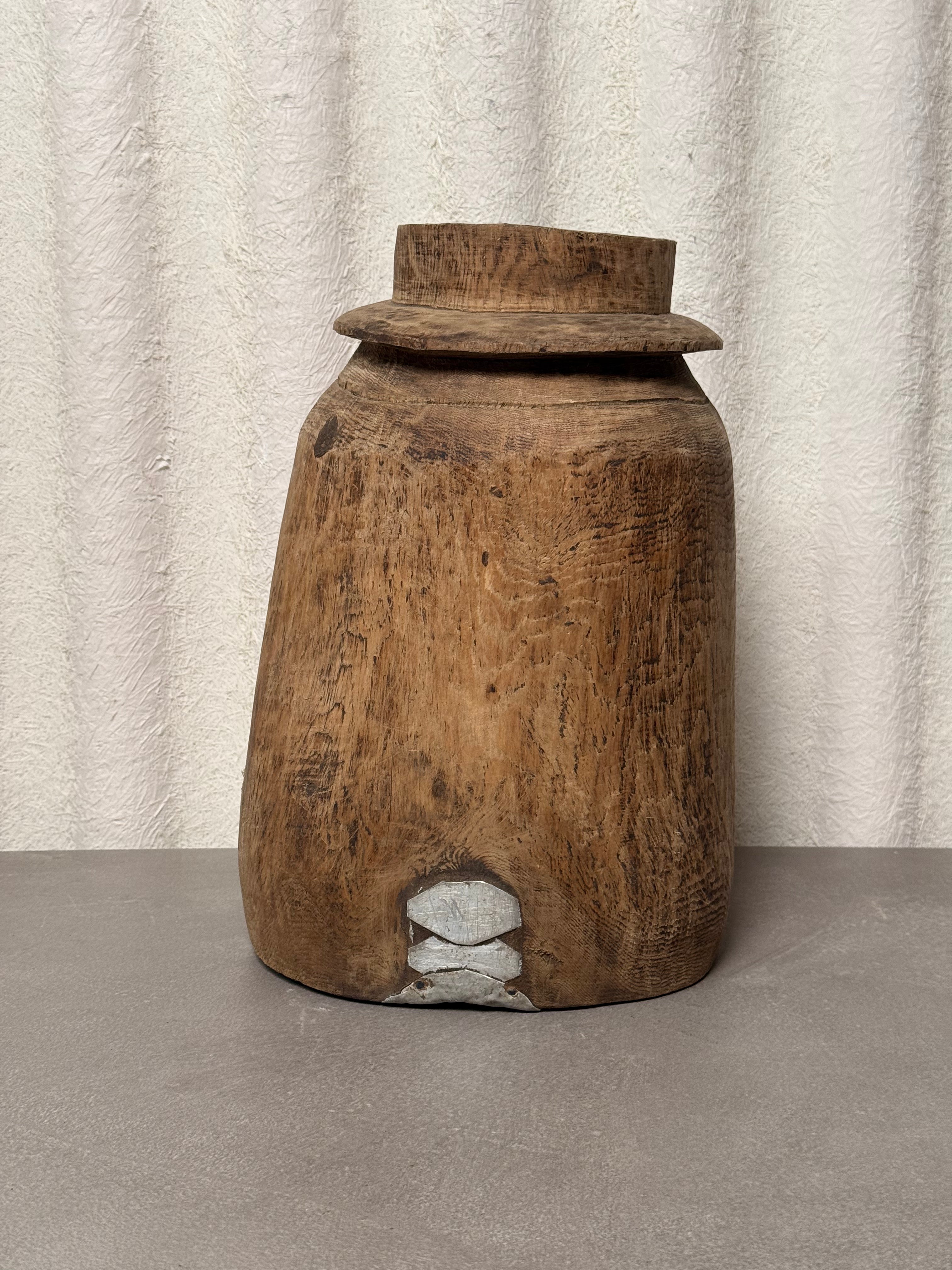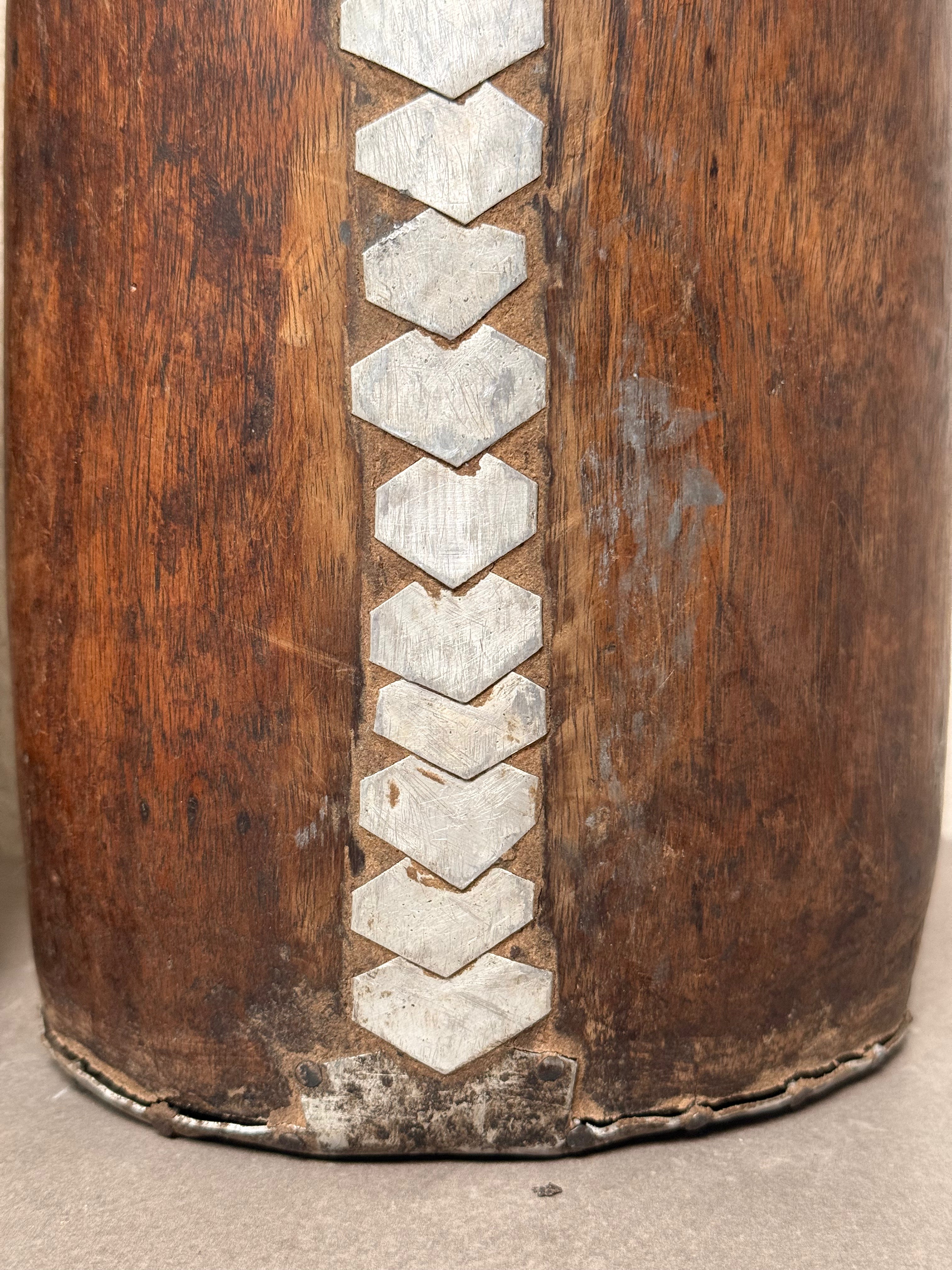 Authentic vintage Tutsi wooden pot originating from East Africa, hand-carved from solid hardwood. The vessel features a tall, tapered silhouette with subtle contouring and a richly aged surface. Decorative metal insets applied in linear patterns accent the exterior, adding contrast and reinforcing the sculptural form.
