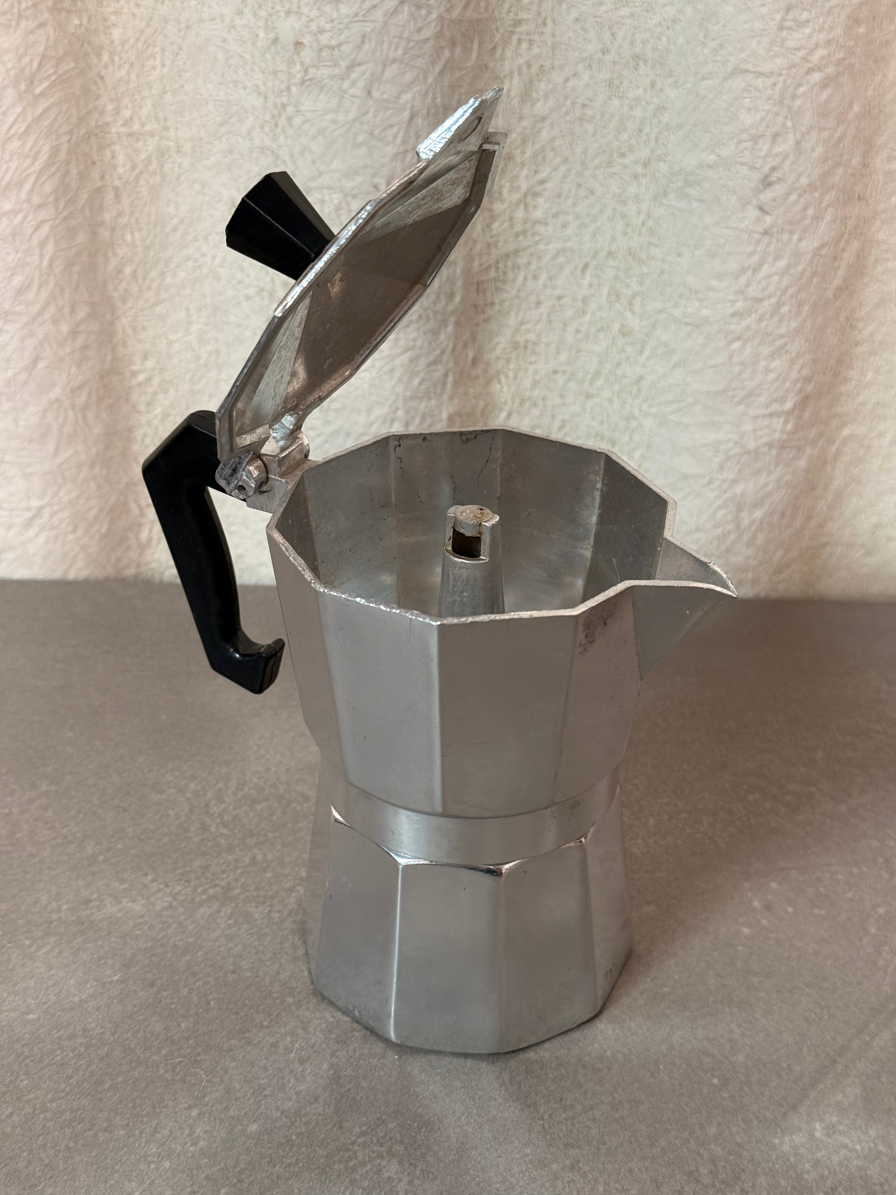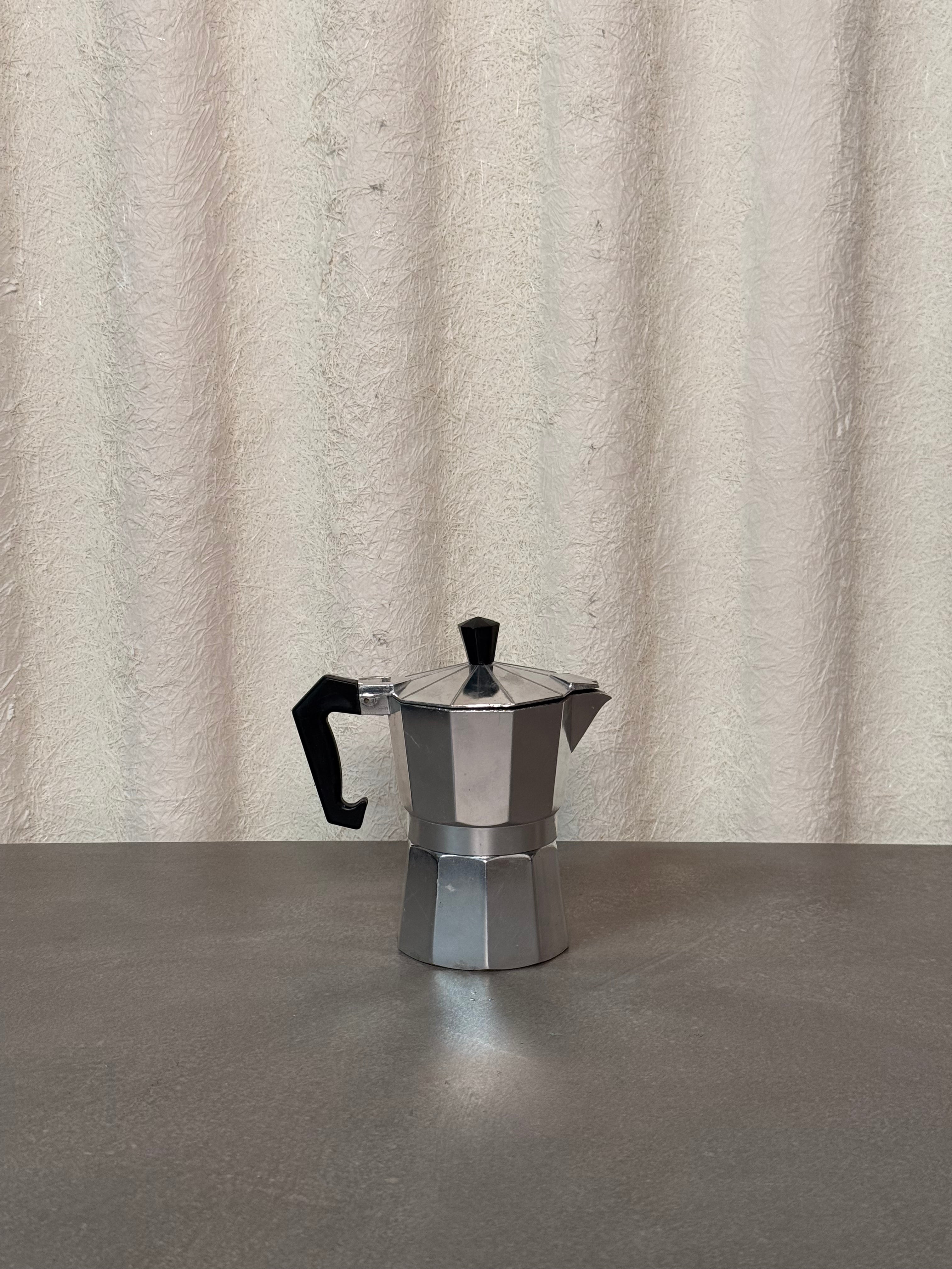 This is a classic stovetop espresso maker, also known as a moka pot. Made of aluminum with a black handle and knob, it features the traditional octagonal shape designed for brewing rich, strong espresso on the stovetop.