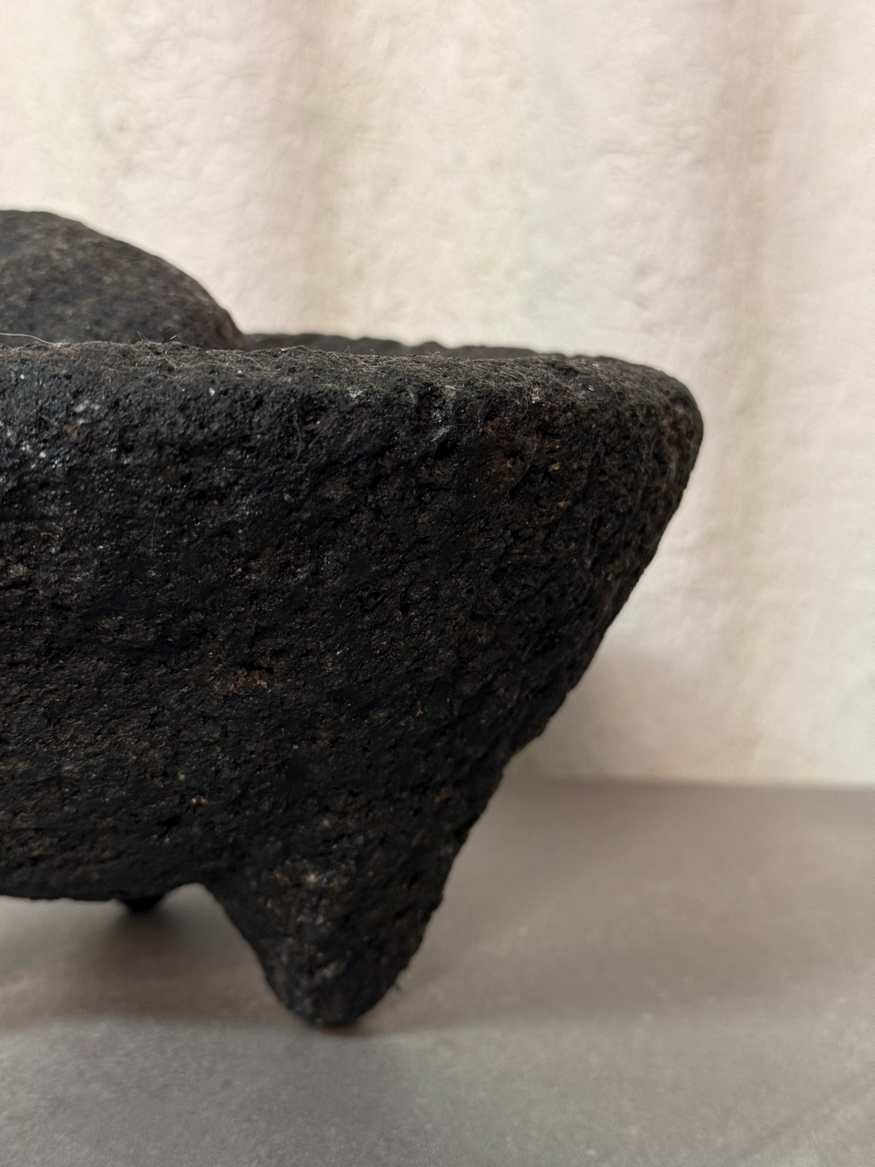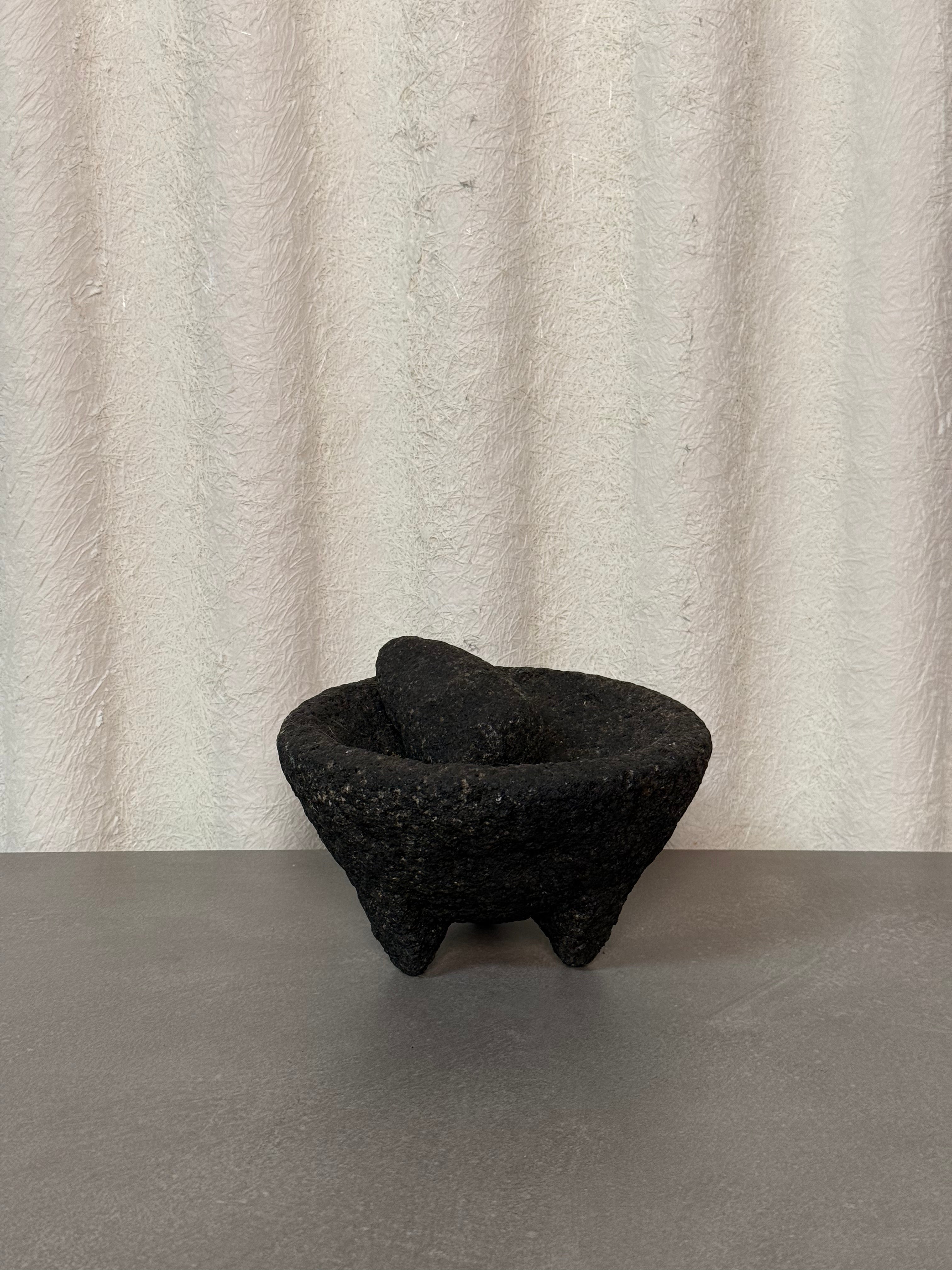 Traditional volcanic rock mortar and pestle. A classic kitchen tool used for grinding spices, herbs, and making authentic salsas, guacamole, and sauces. This heavy-duty stoneware piece is both functional and decorative, perfect for cooking enthusiasts or collectors of traditional culinary items.