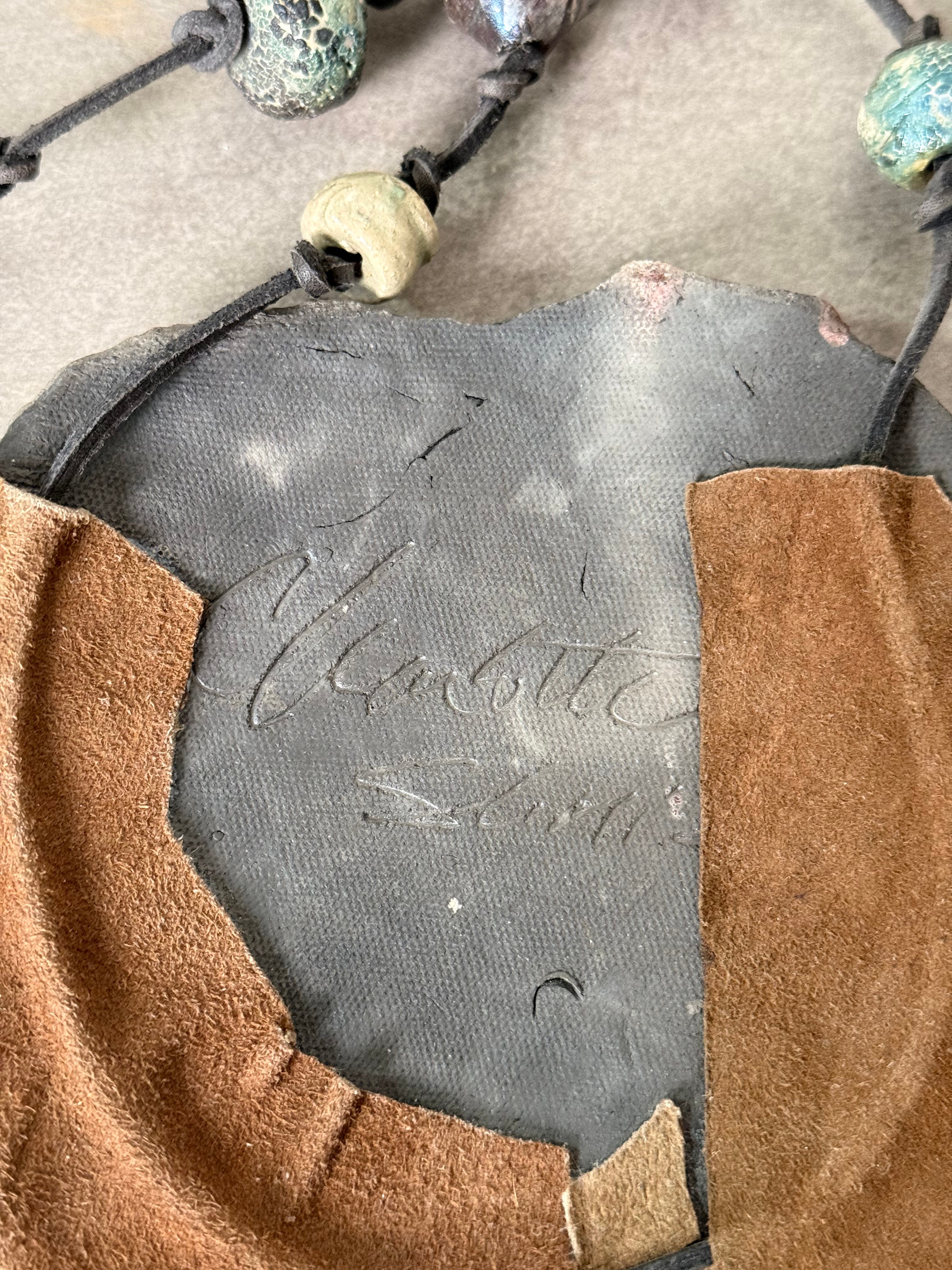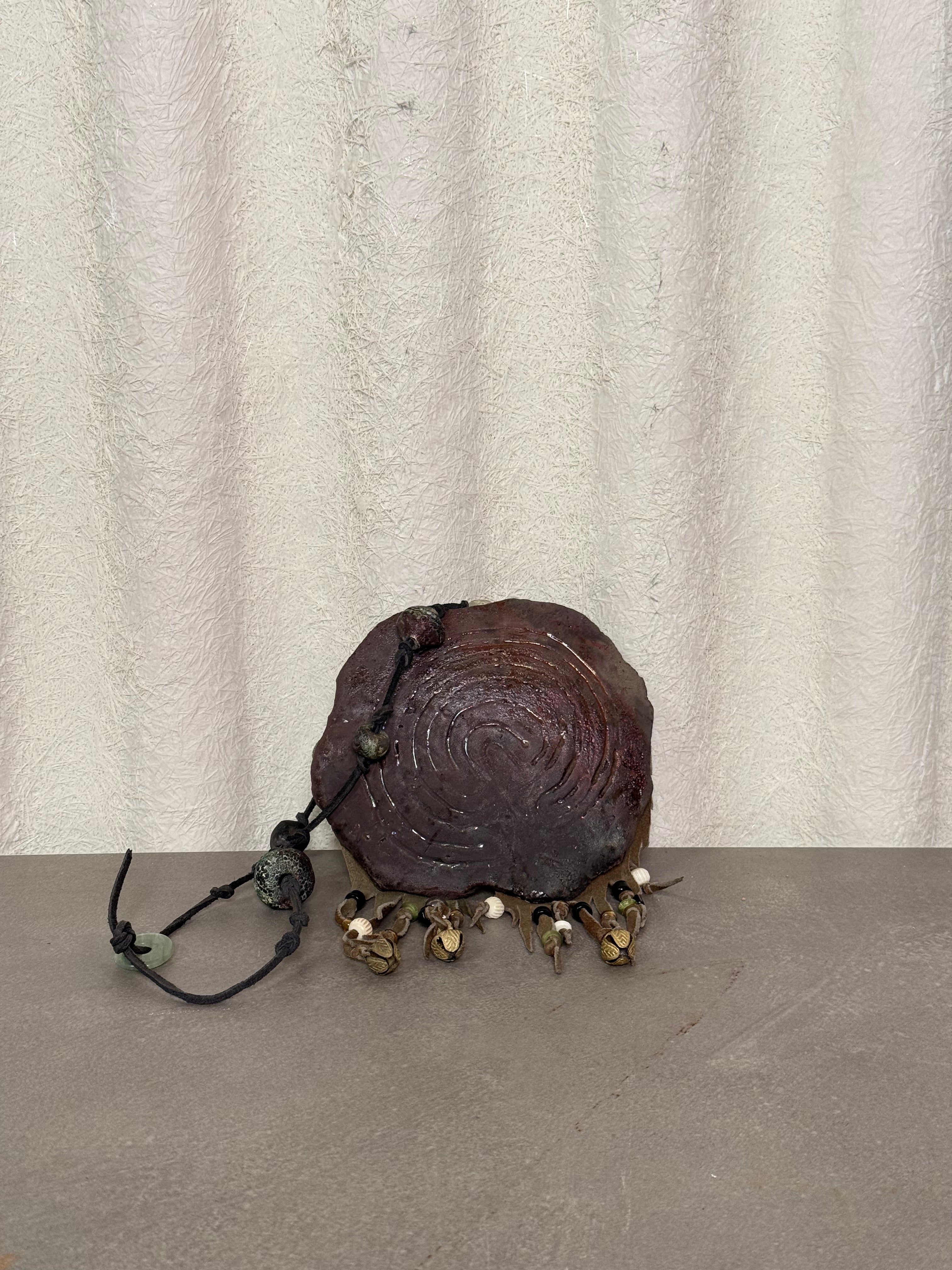 Native textured plate with a decorative rope detail and hanging elements for a striking artisanal look. This piece adds cultural charm and visual interest to any wall.