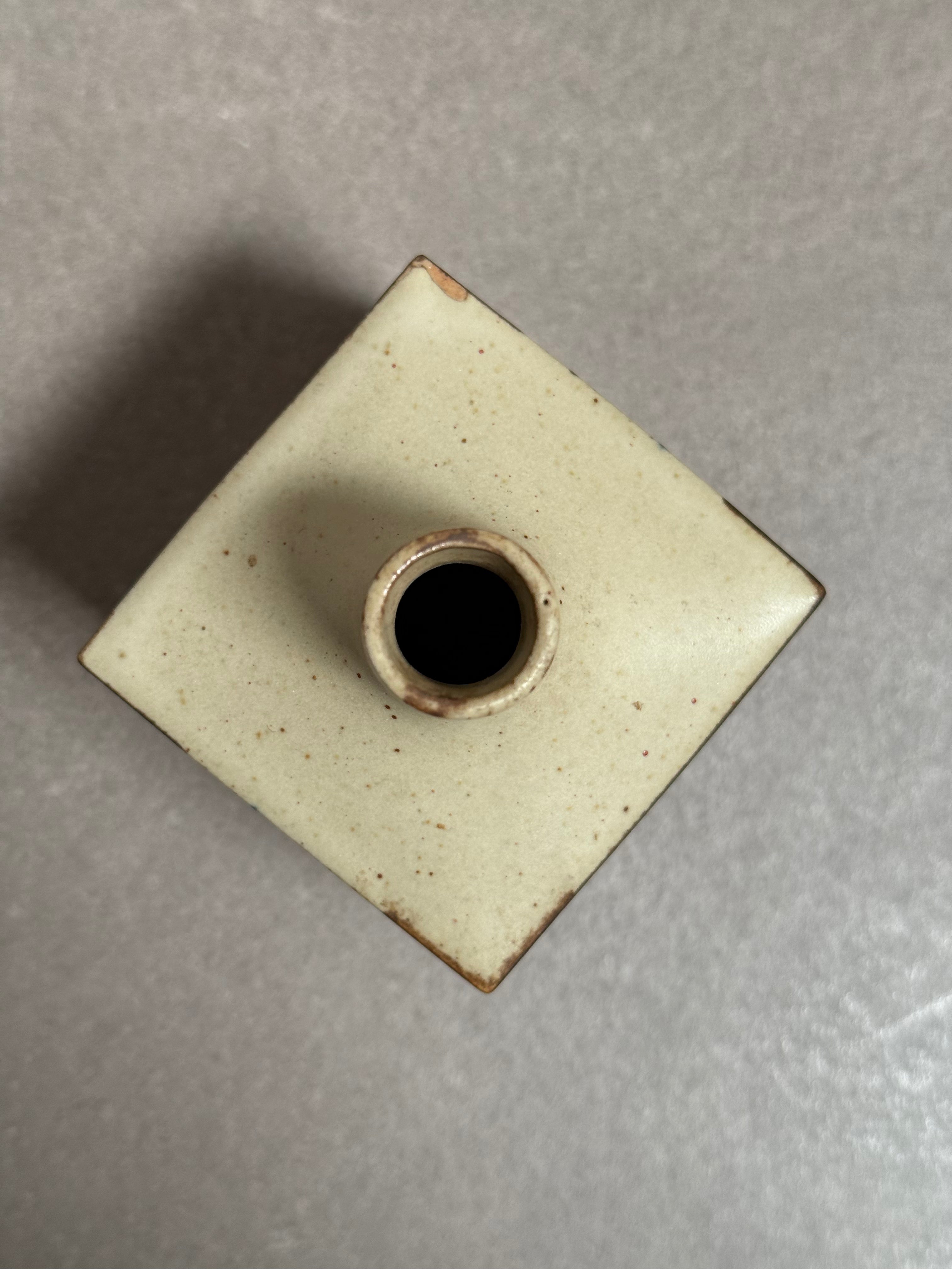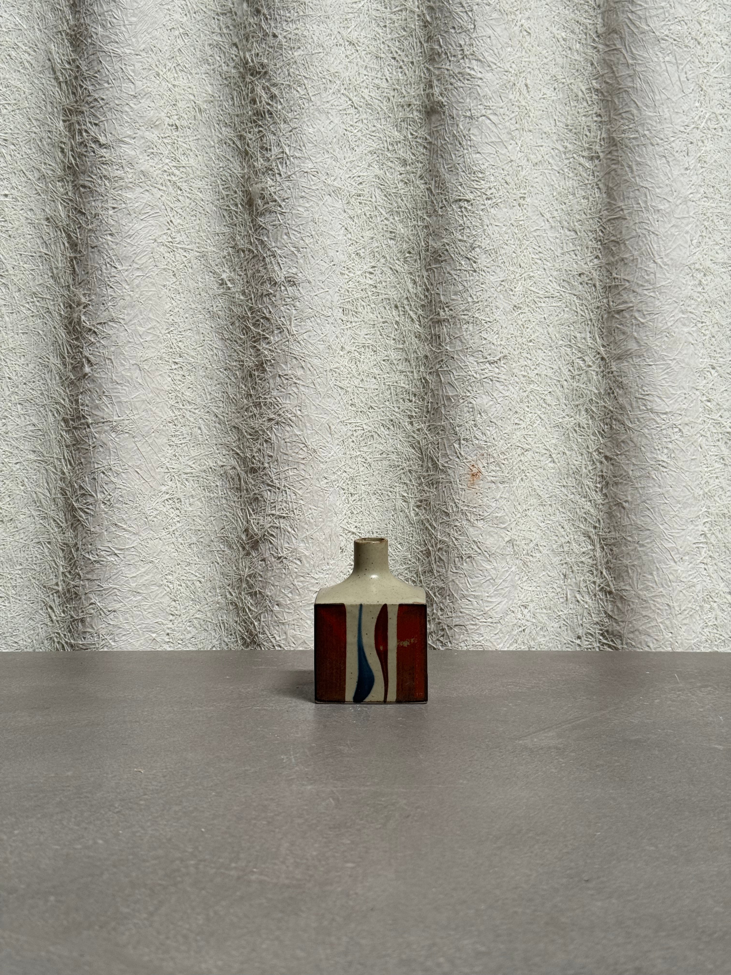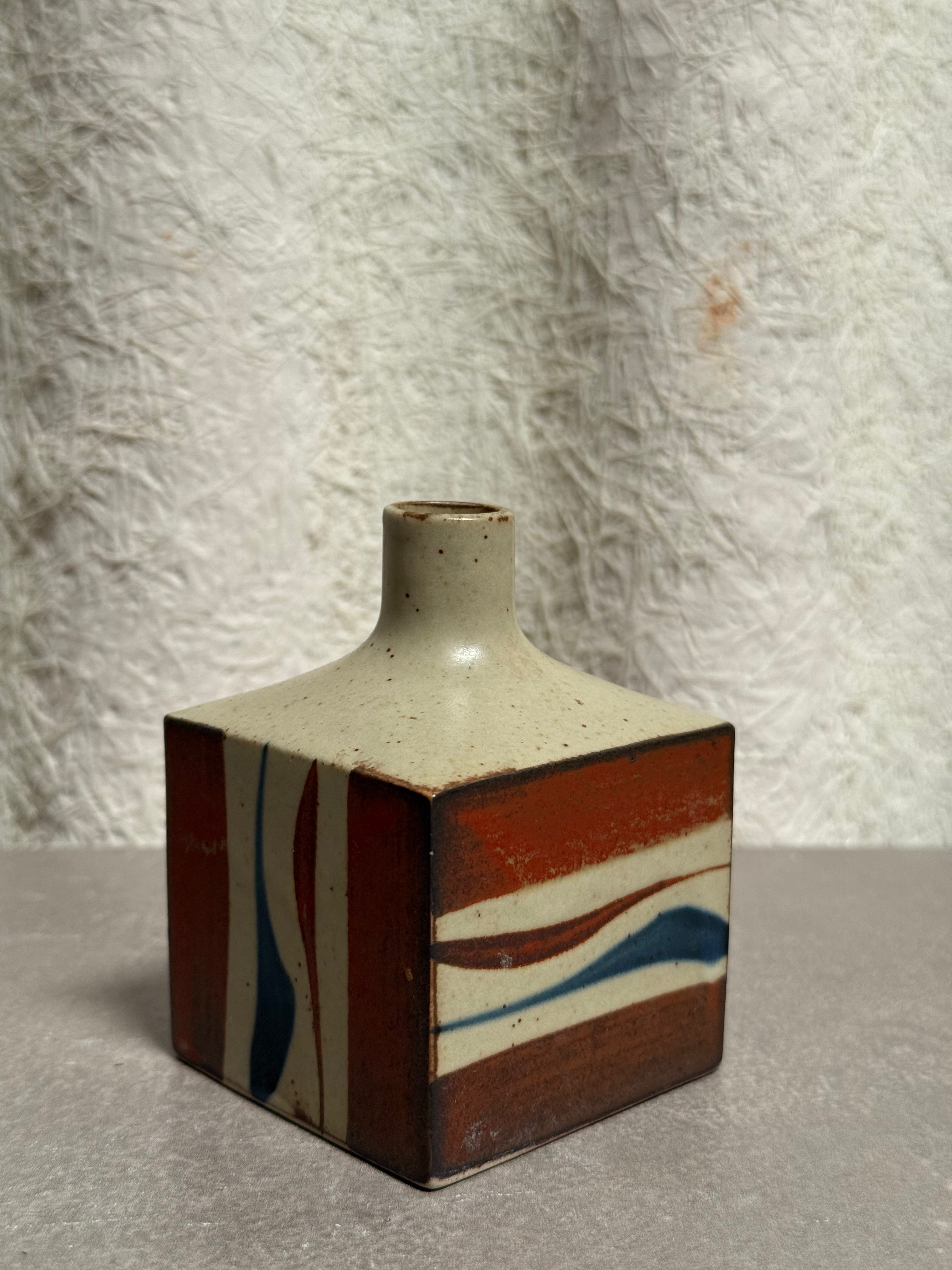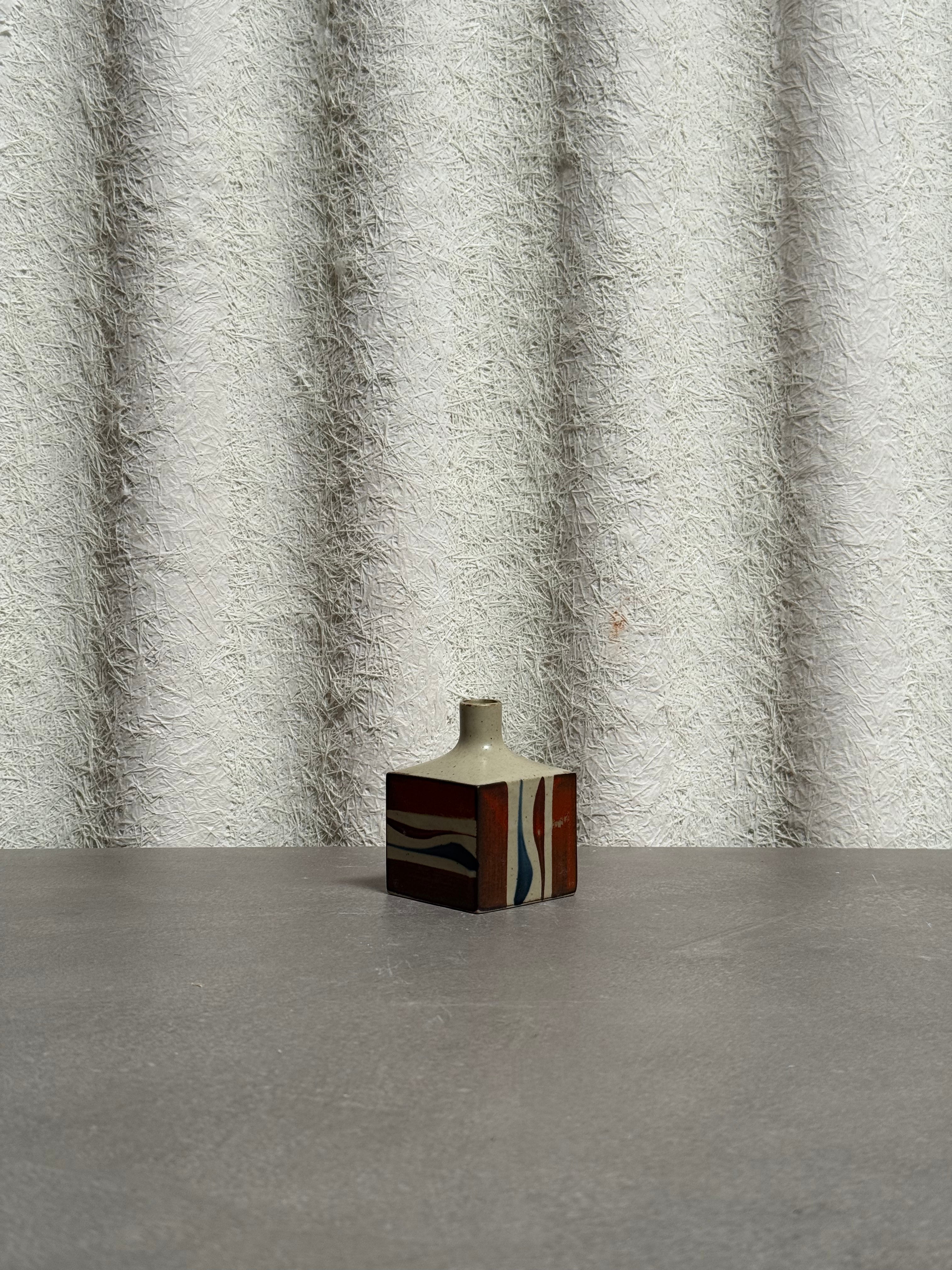 A charming vintage budvase by Otagiri, featuring a distinctive square form and hand-painted abstract bands in earthy reds, deep blue, and cream. Its petite size and playful lines make it perfect for a single bloom or as a standout accent on a shelf. A collectible piece of mid-century Japanese design — subtle, sculptural, and full of character.