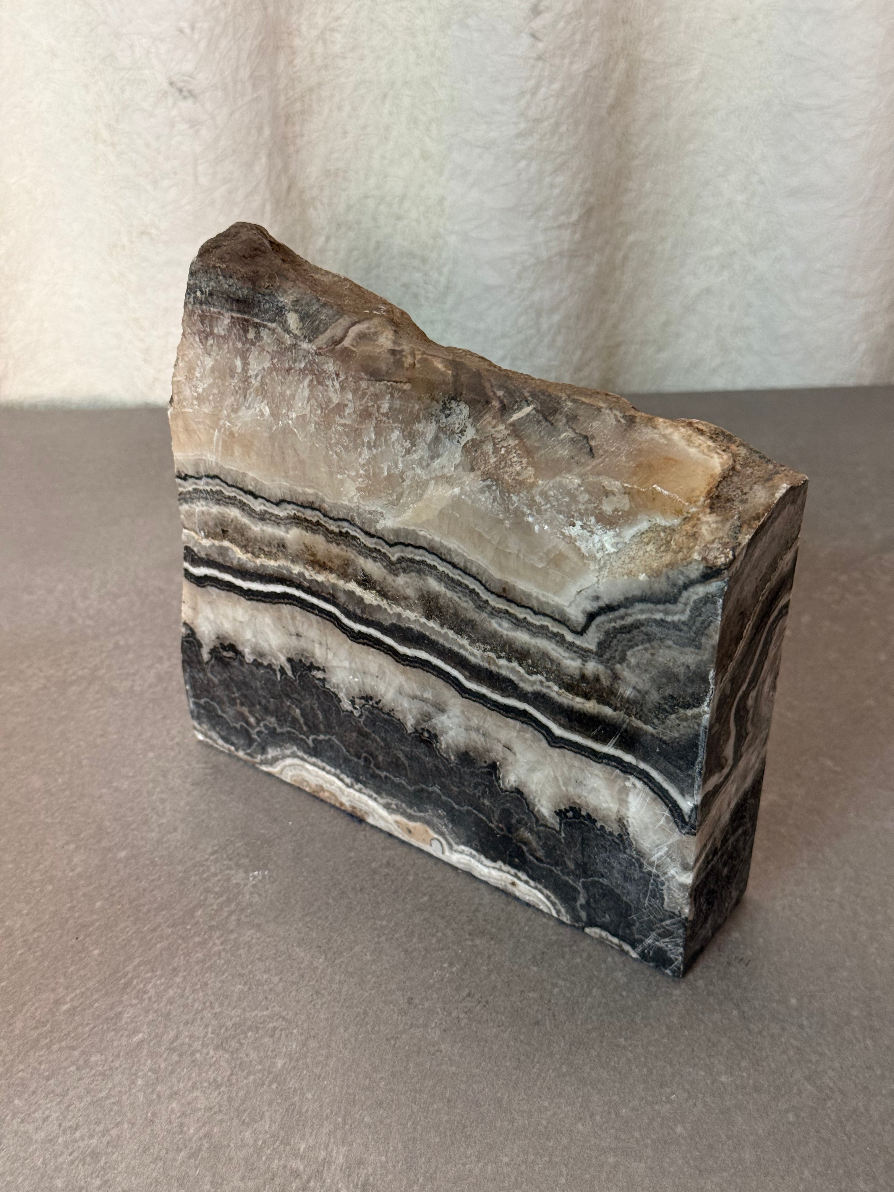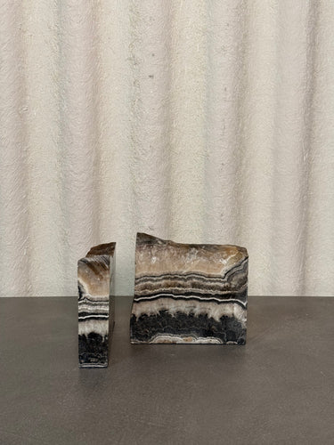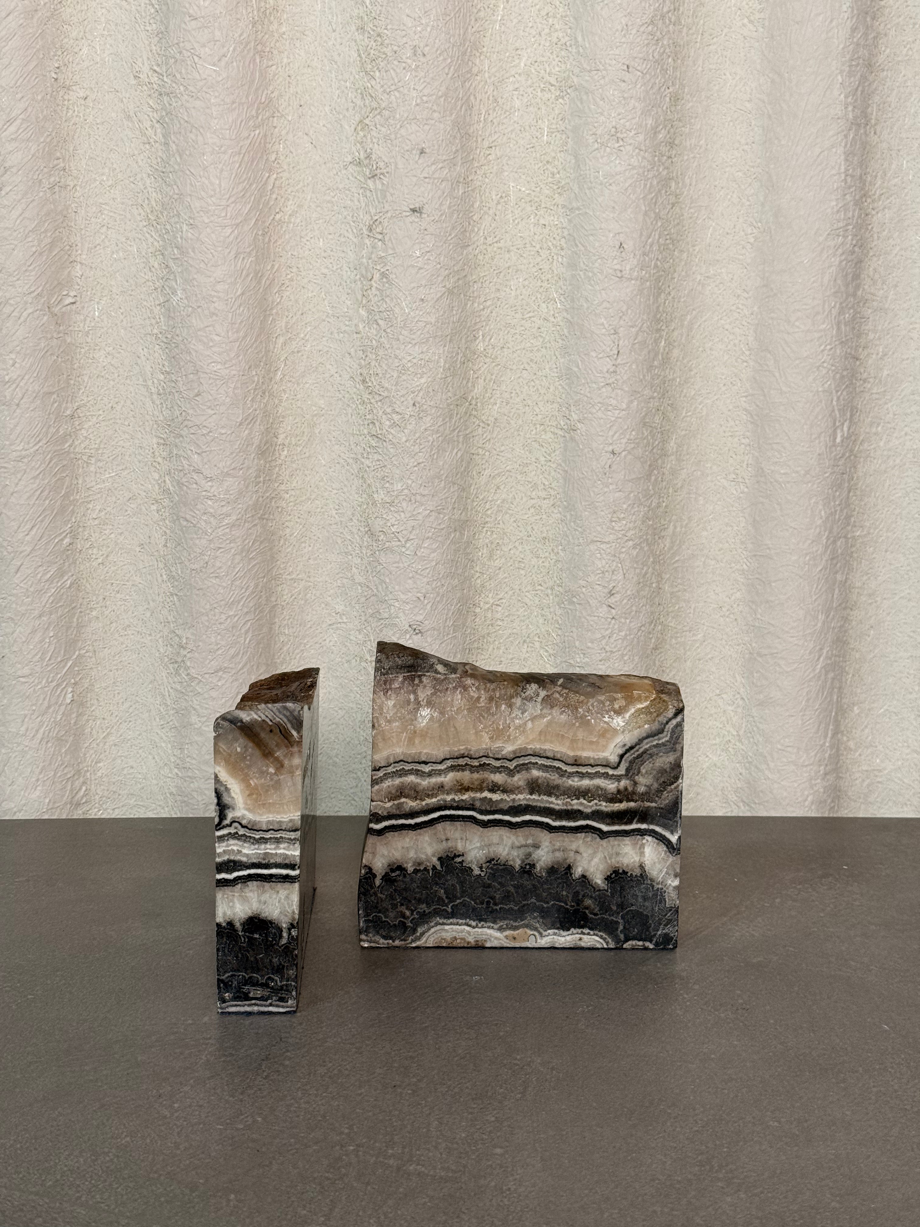 Set of heavy natural stone bookends with striking layers of black, gray, and cream veining. Each piece showcases raw, organic beauty, perfect for adding a touch of earthy elegance to bookshelves, desks, or office décor.