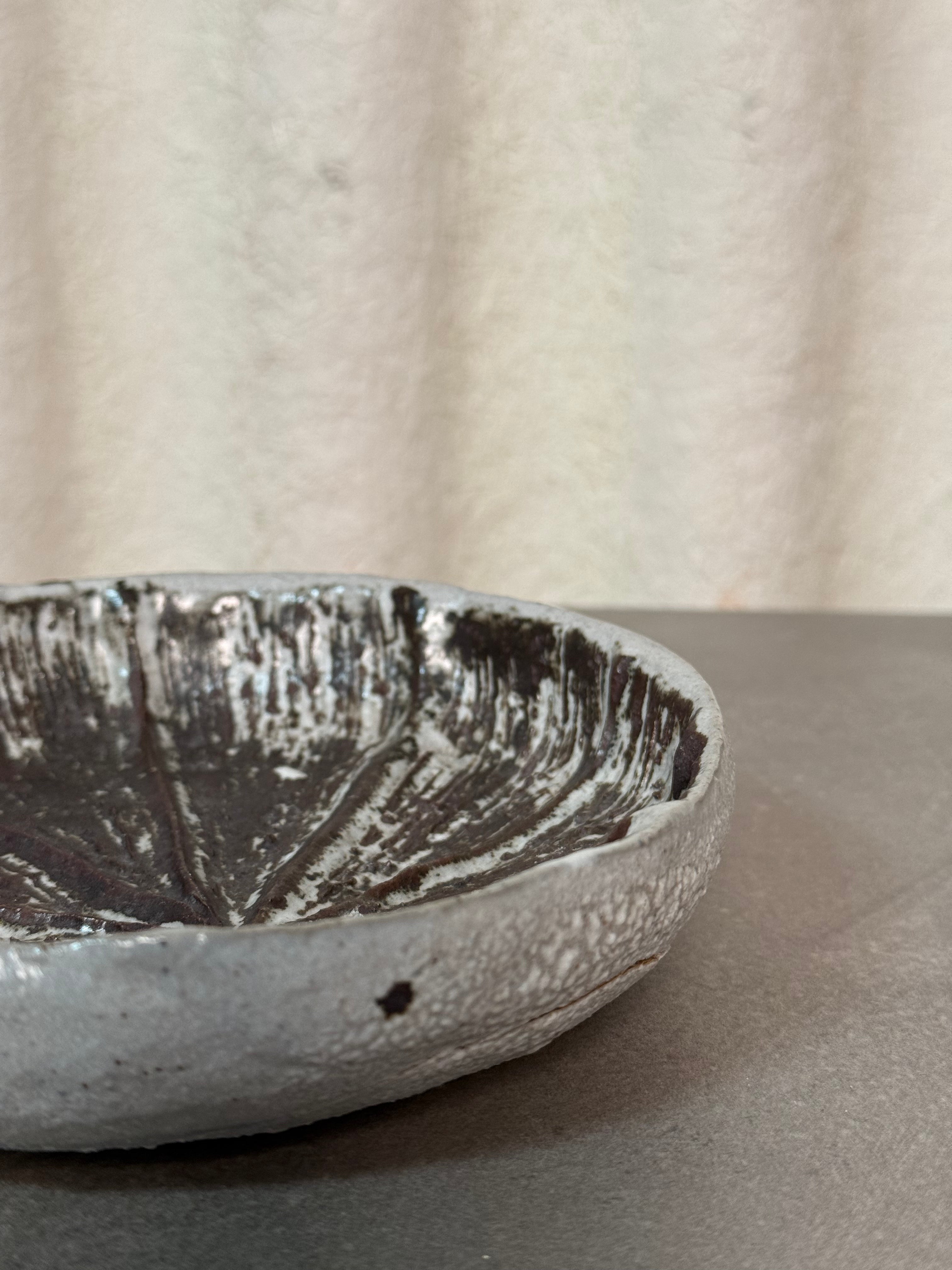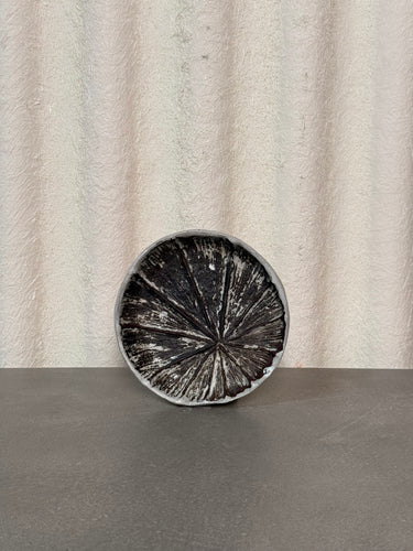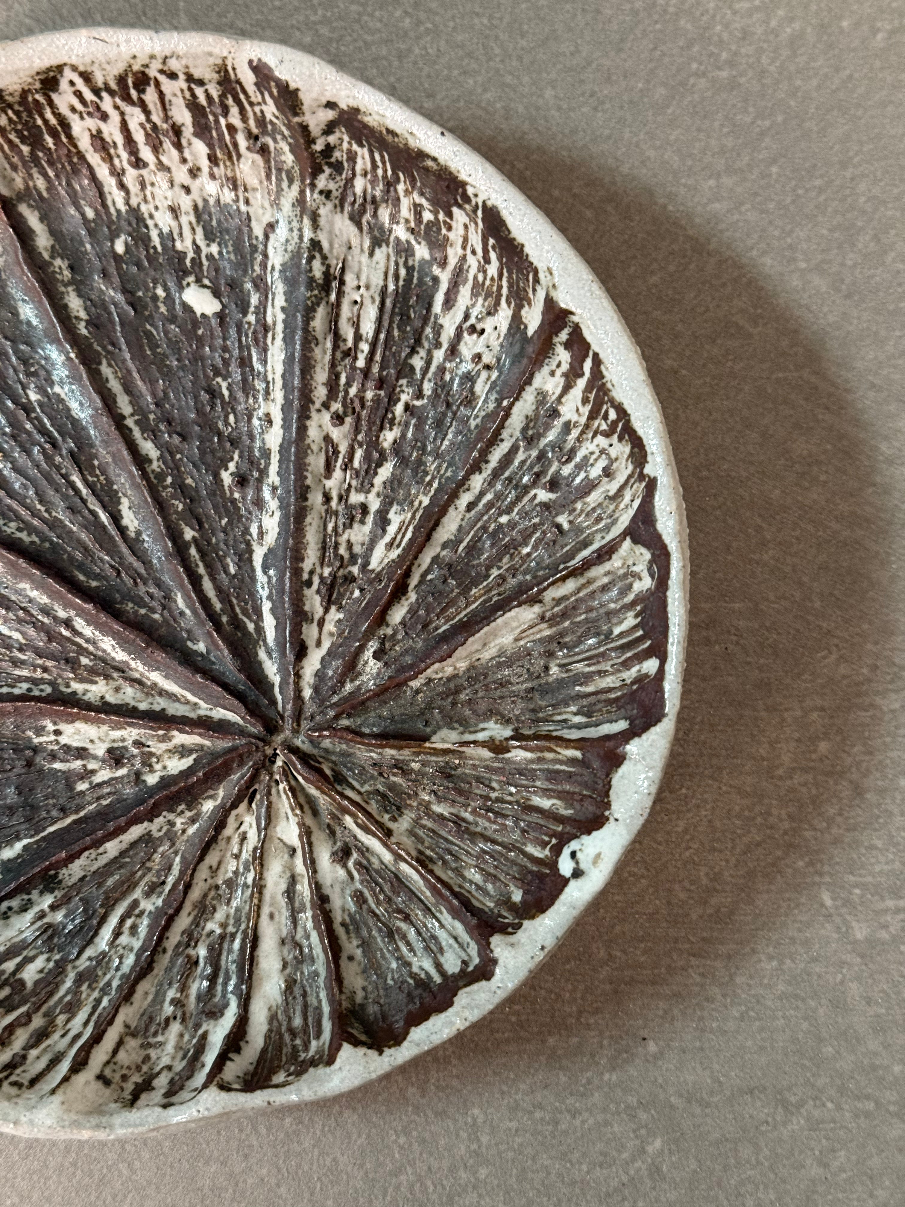 Textured ceramic dish with a radiating leaf-like design, combining organic form and functional style. Works as an ashtray, catchall, or decorative accent.