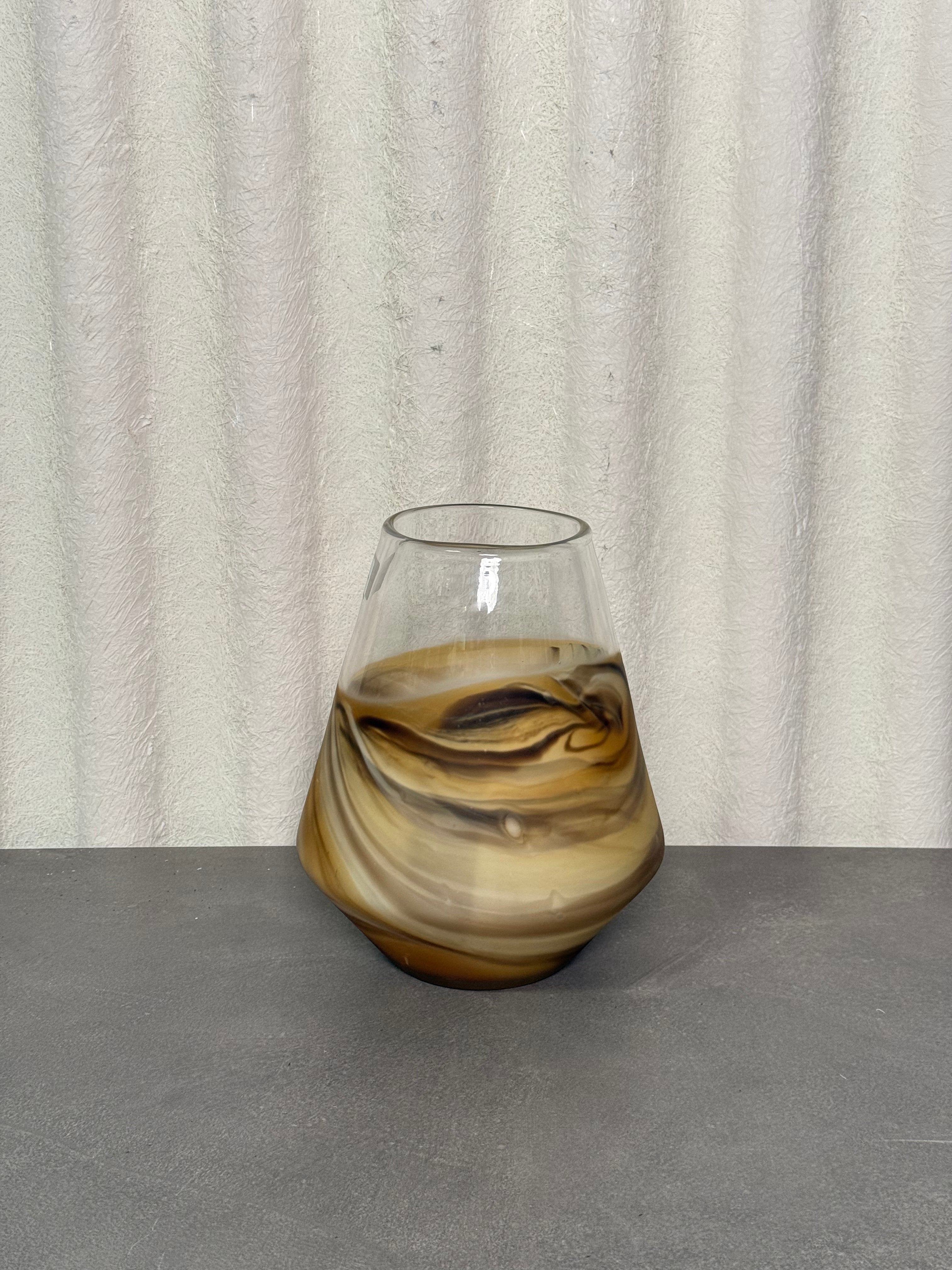 A beautifully hand-blown glass vase featuring swirling caramel, smoke, and cream tones that mimic natural sandstone formations. The semi-translucent body creates a soft, layered effect. Its tapered silhouette enhances the fluid motion of the marbled pattern, giving it a sculptural presence.