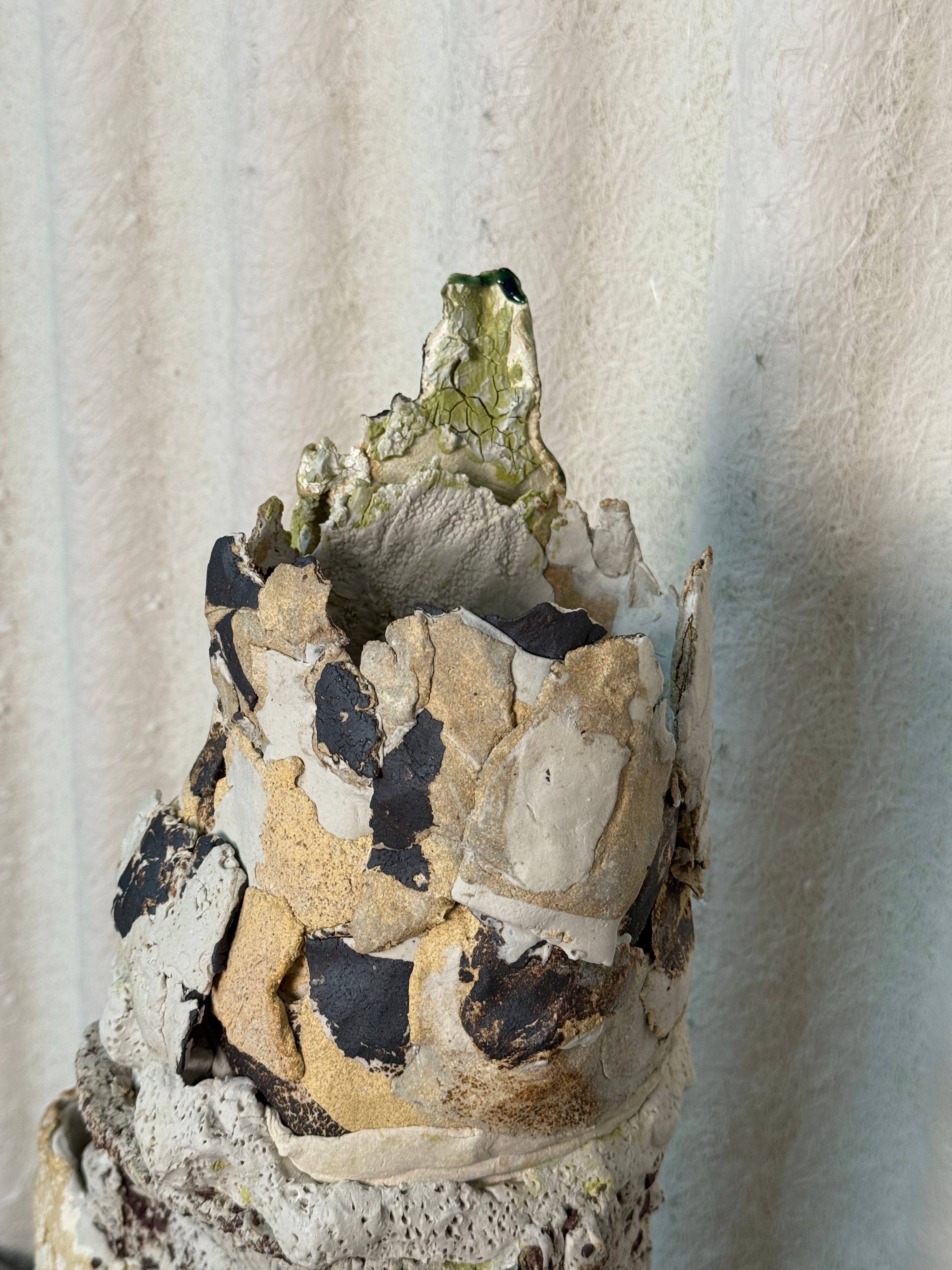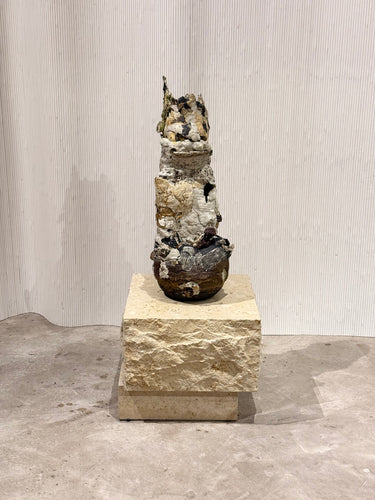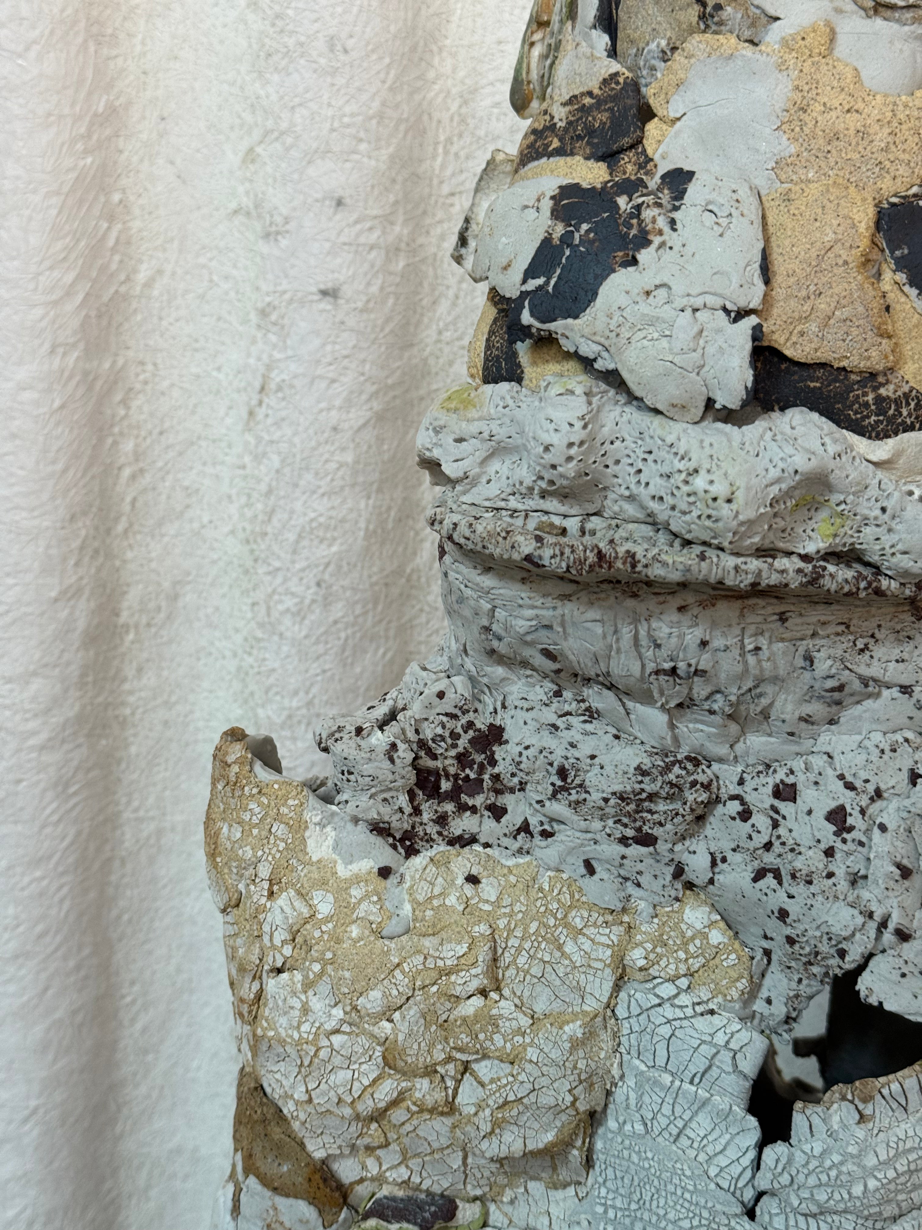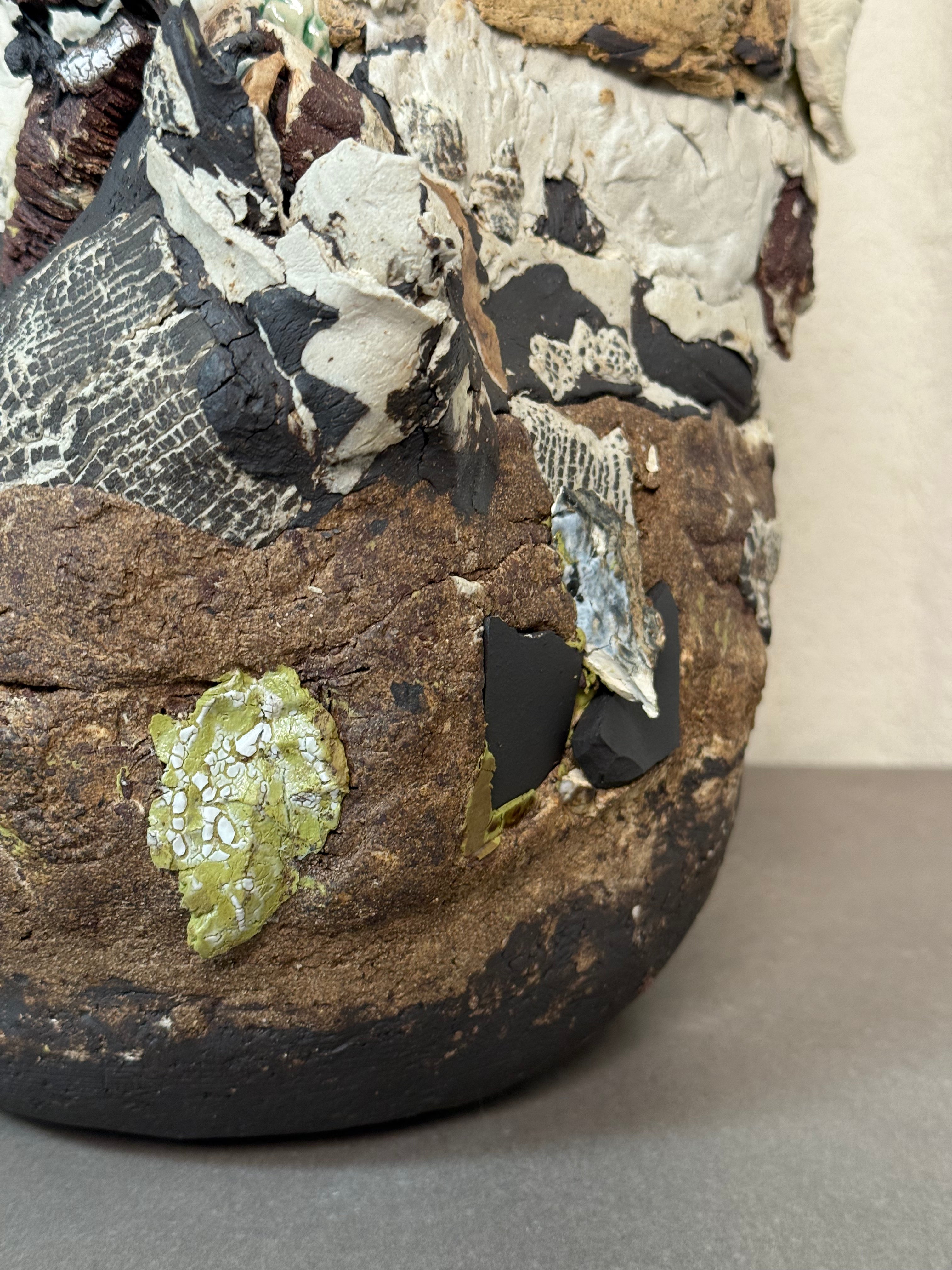 A dramatic vintage sculptural vase with textured layers, bold earth tones, and organic abstract detailing. A one-of-a-kind statement piece for artful interiors.