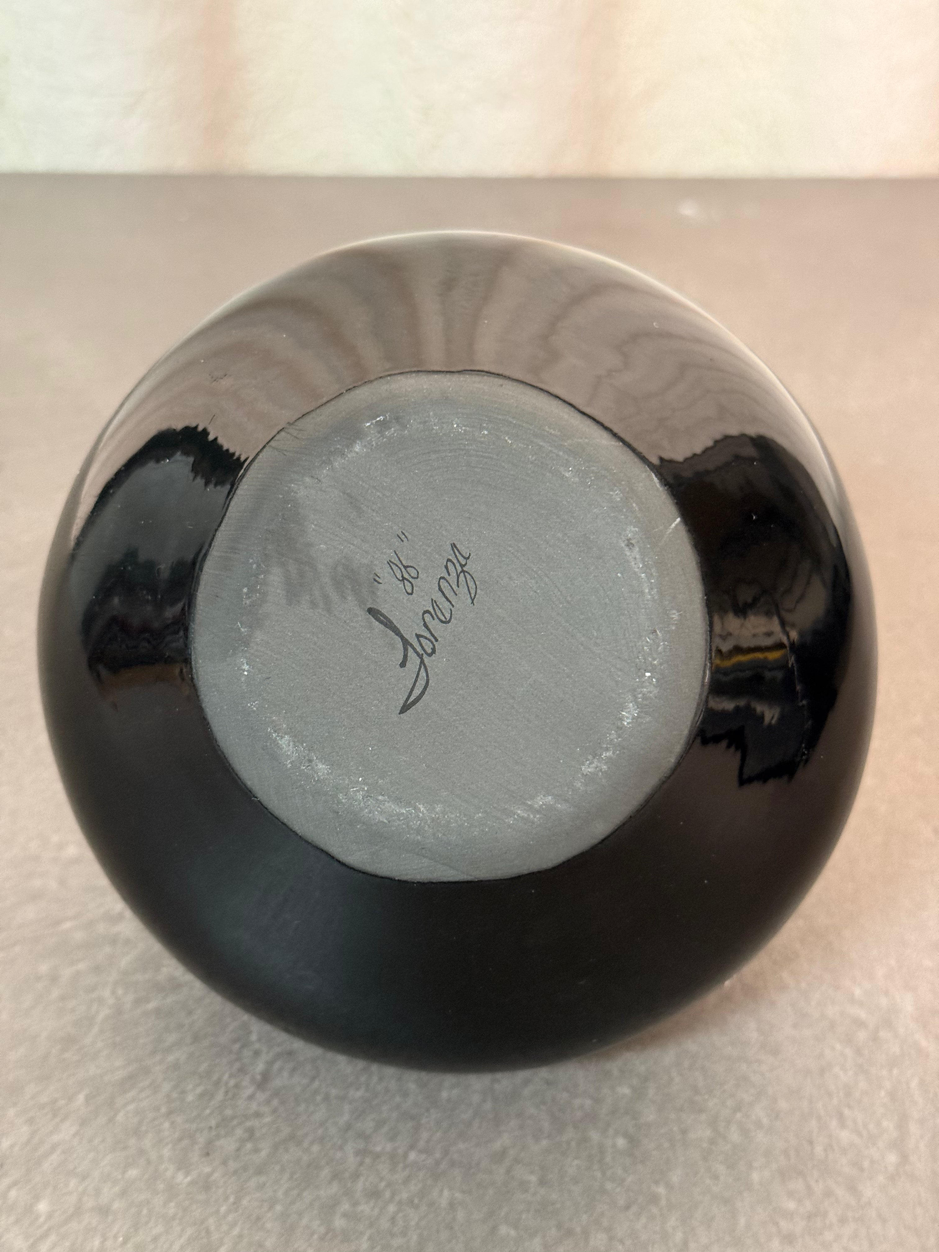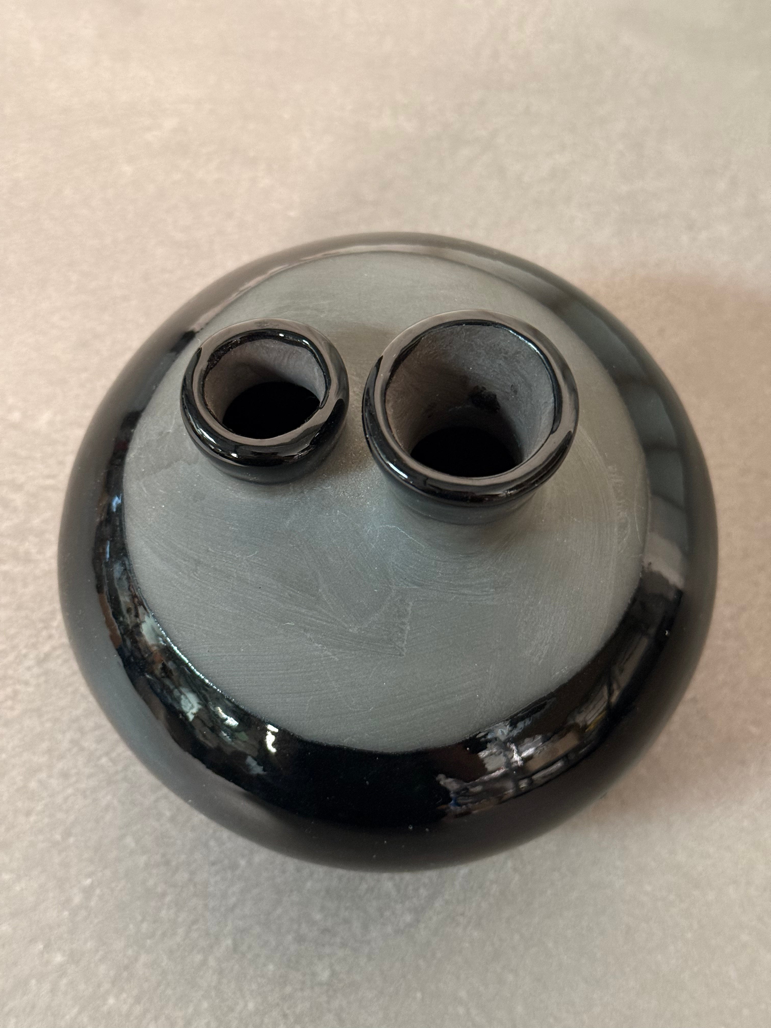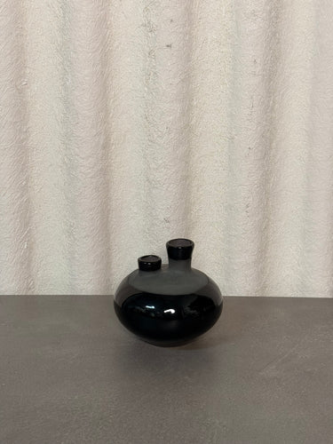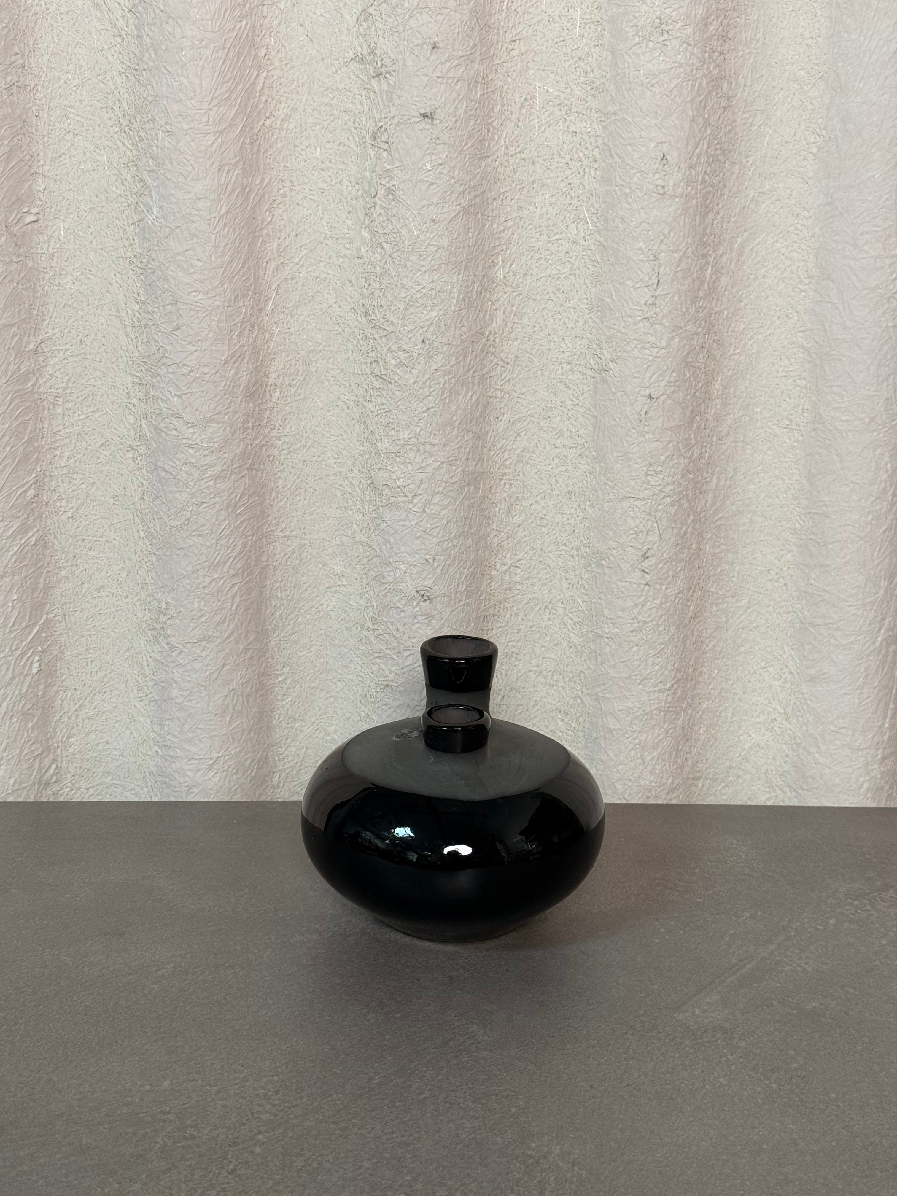 Sleek black pottery vase, featuring a glossy dark glaze with a smooth matte neck. This handcrafted piece highlights the artistry of studio ceramics. Signed by the artist.