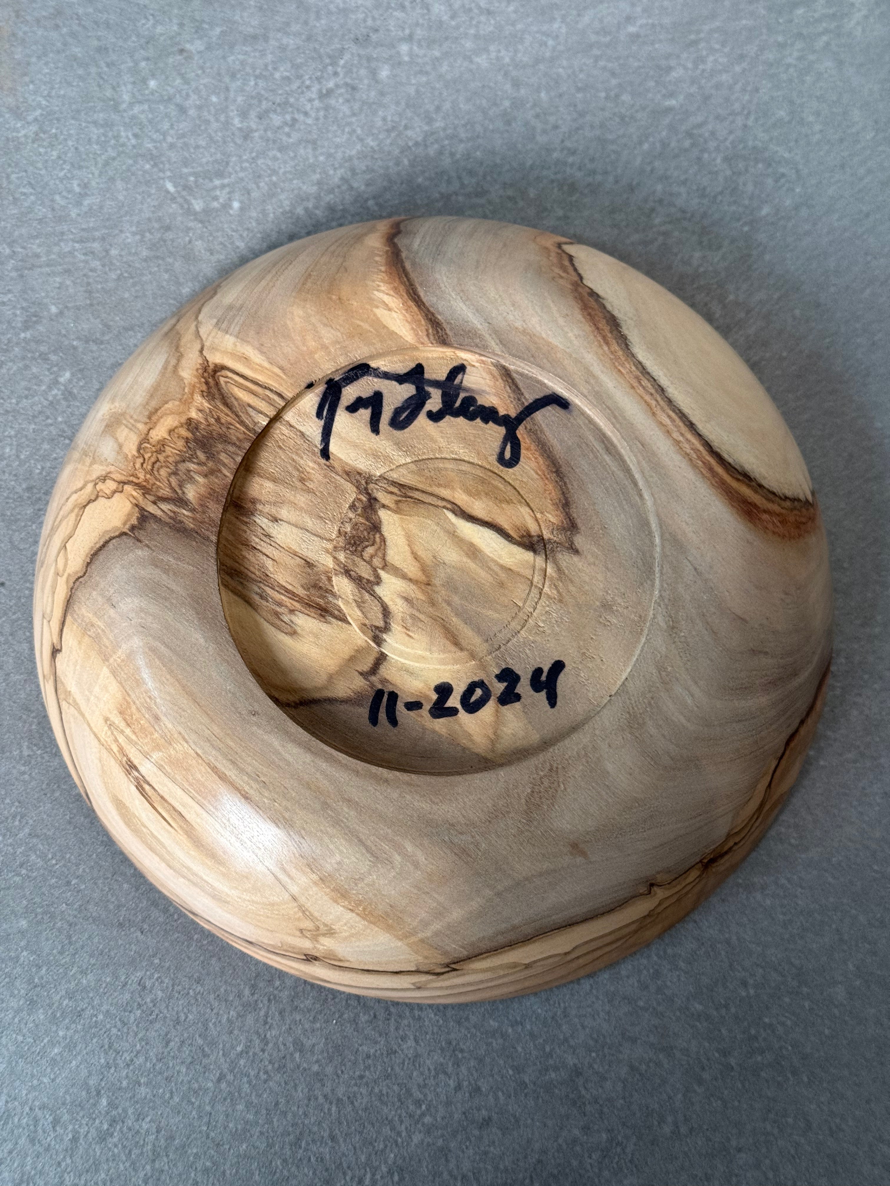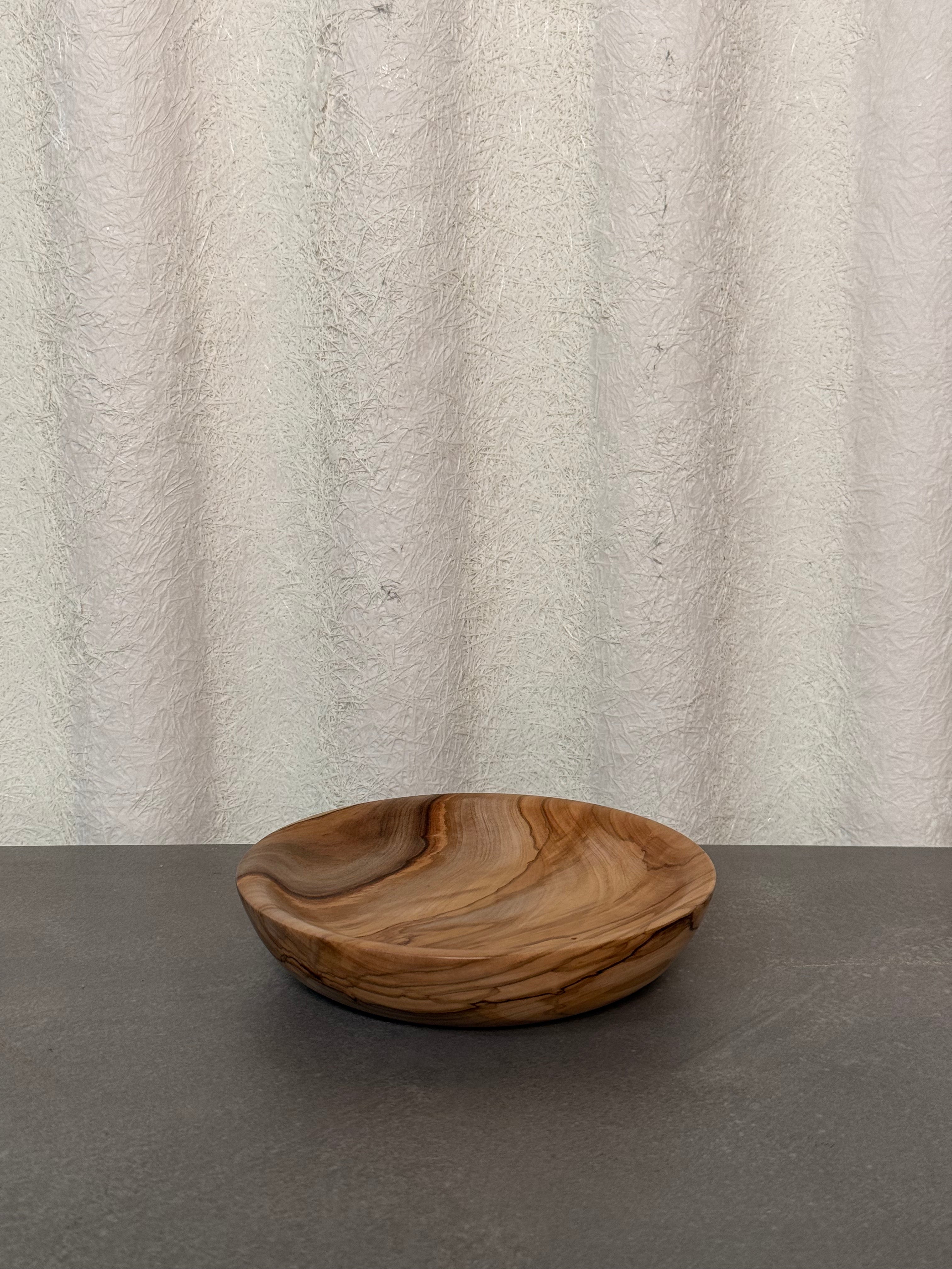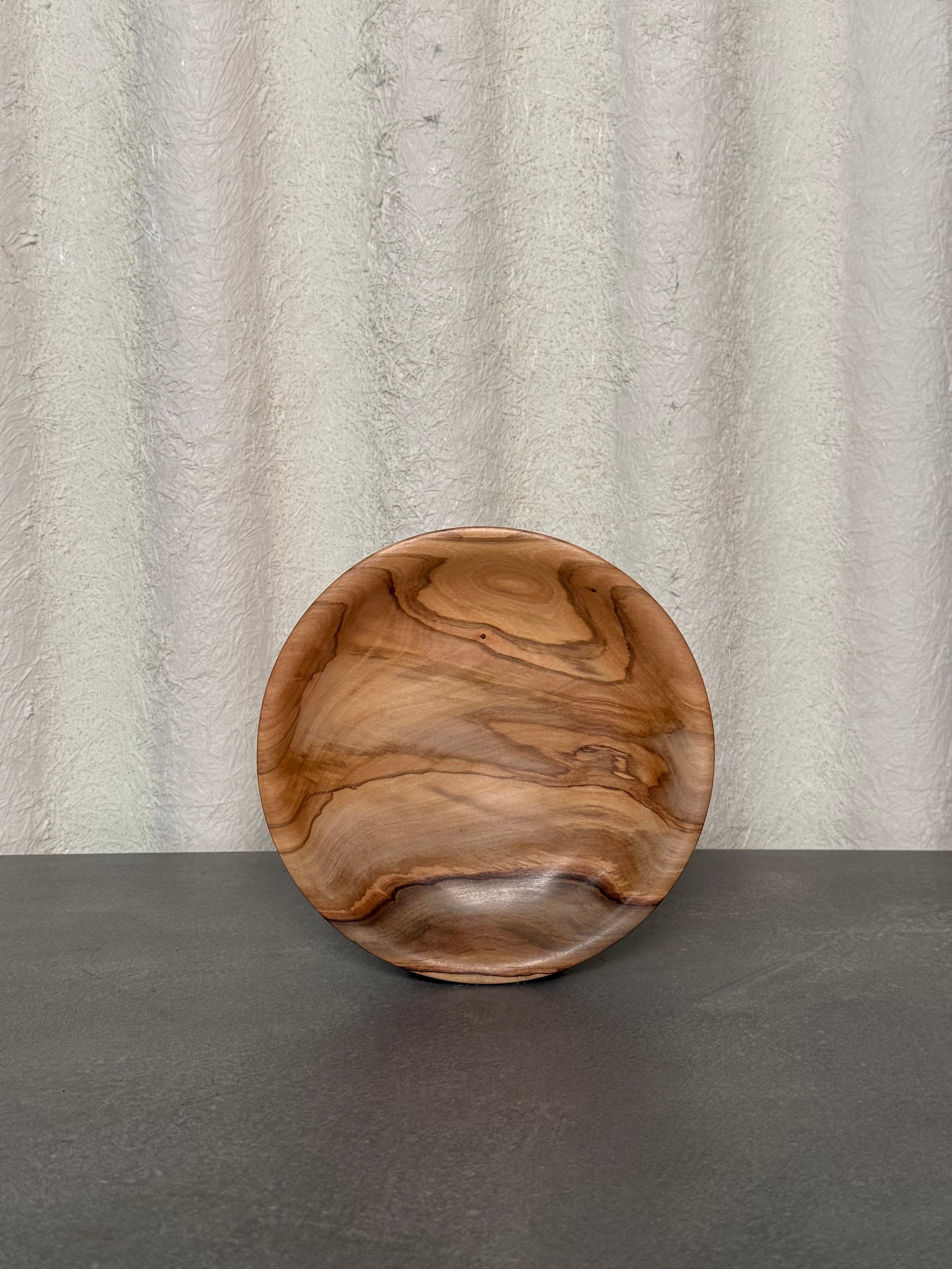 Elegant olive wood plate with naturally flowing grain patterns and a smooth hand-sanded finish. Perfect for serving fruit, displaying jewelry, or as a decorative accent, this timeless piece highlights the organic beauty and durability of Mediterranean olive wood.