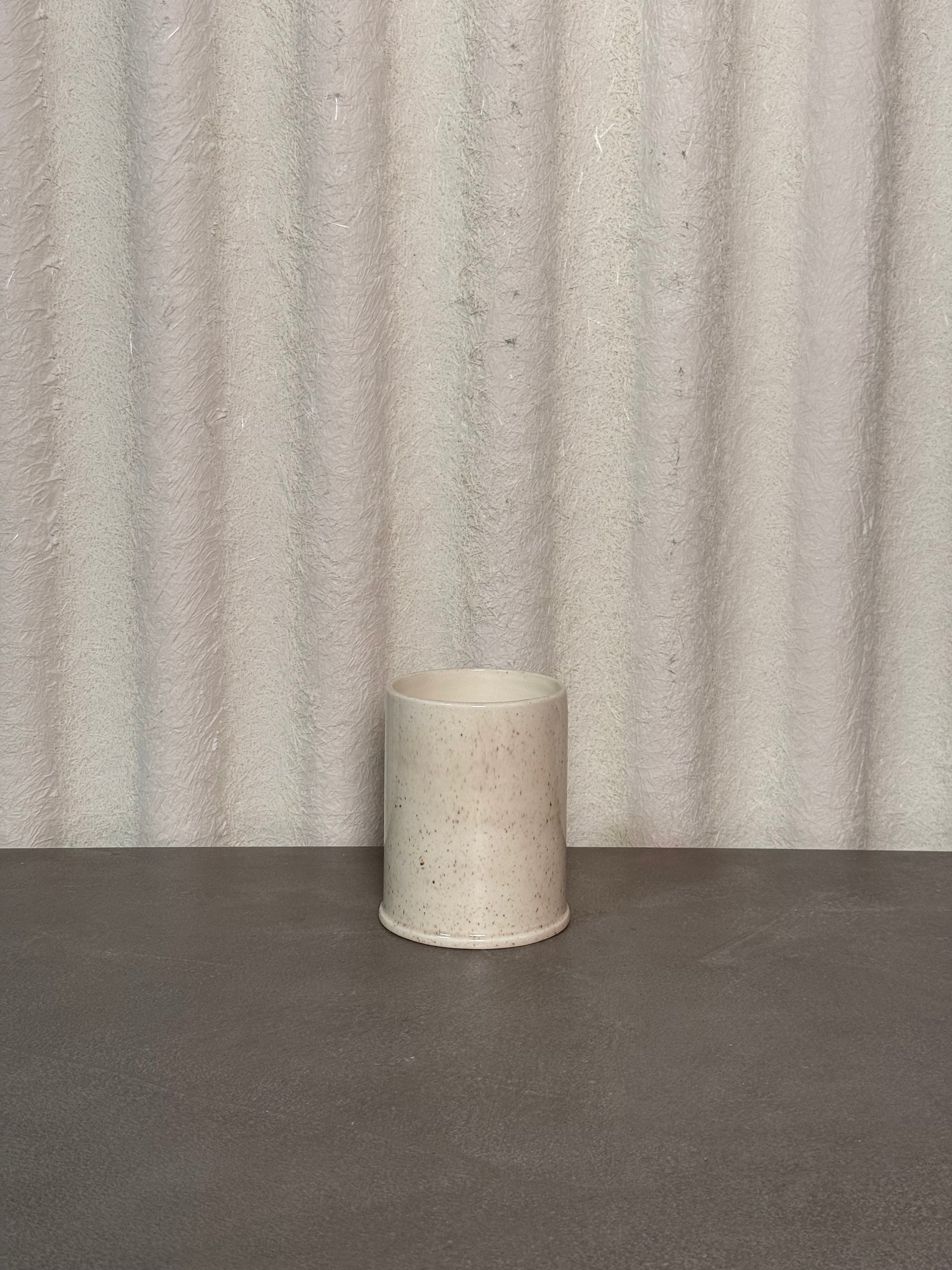 Minimalist stoneware vessel with a soft ivory glaze and natural speckling. The cylindrical form and subtle rim detail highlight handcrafted precision, ideal as a utensil holder, vase, or sculptural accent in modern interiors.