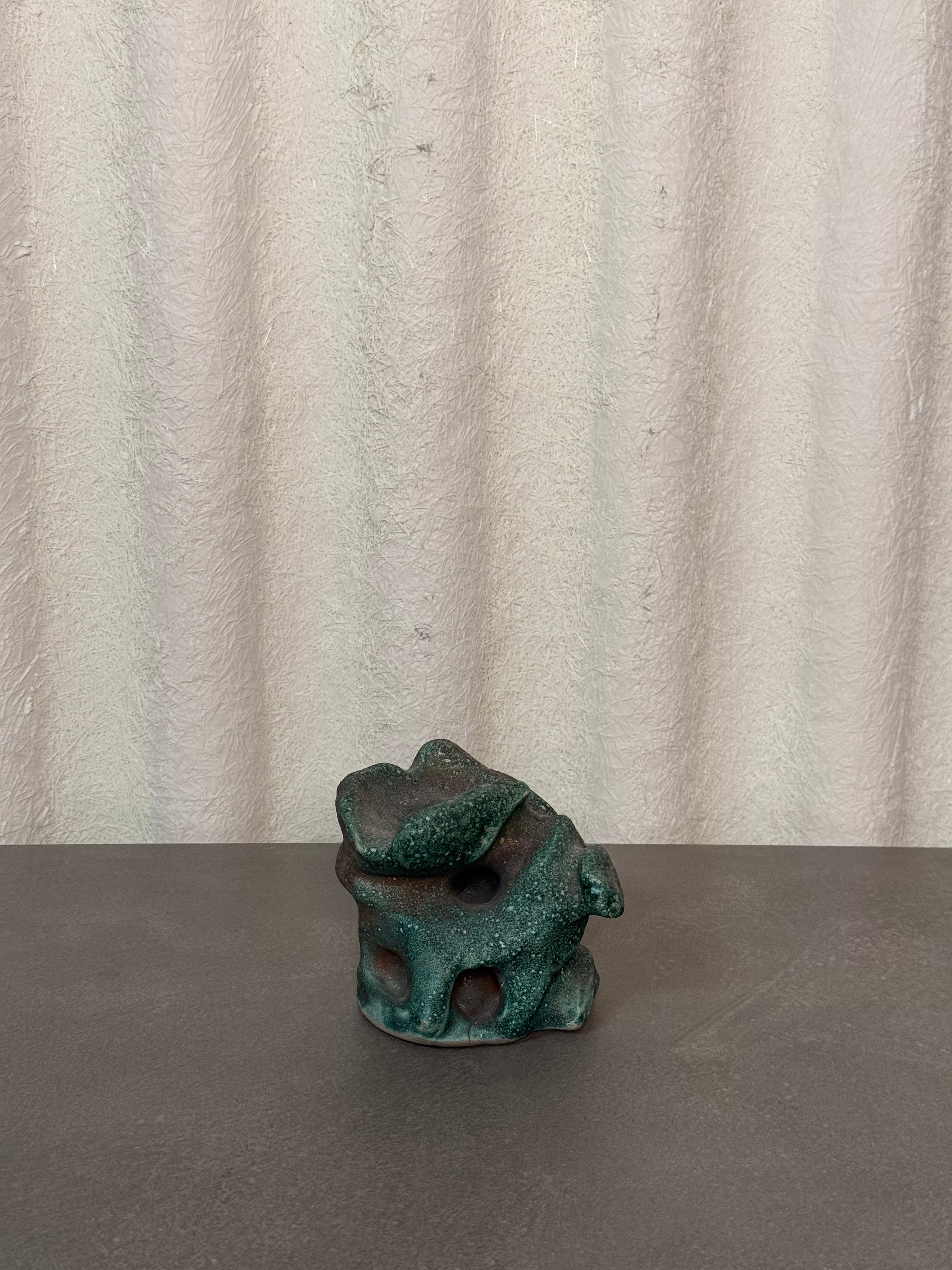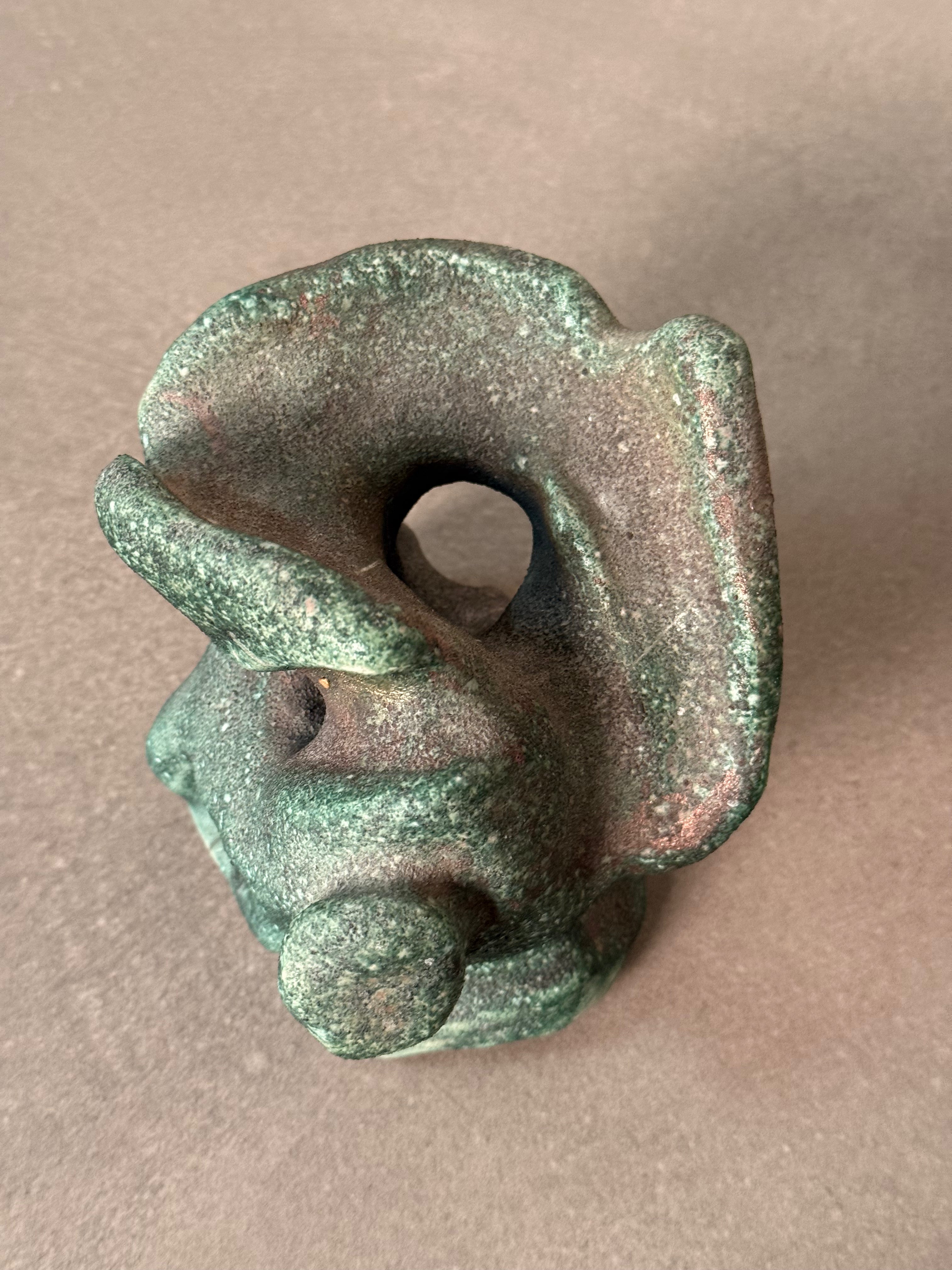 Unique abstract pottery sculpture with a textured green finish, showcasing organic curves and artistic form. Perfect as a decorative accent piece for shelves, desks, or modern art displays.