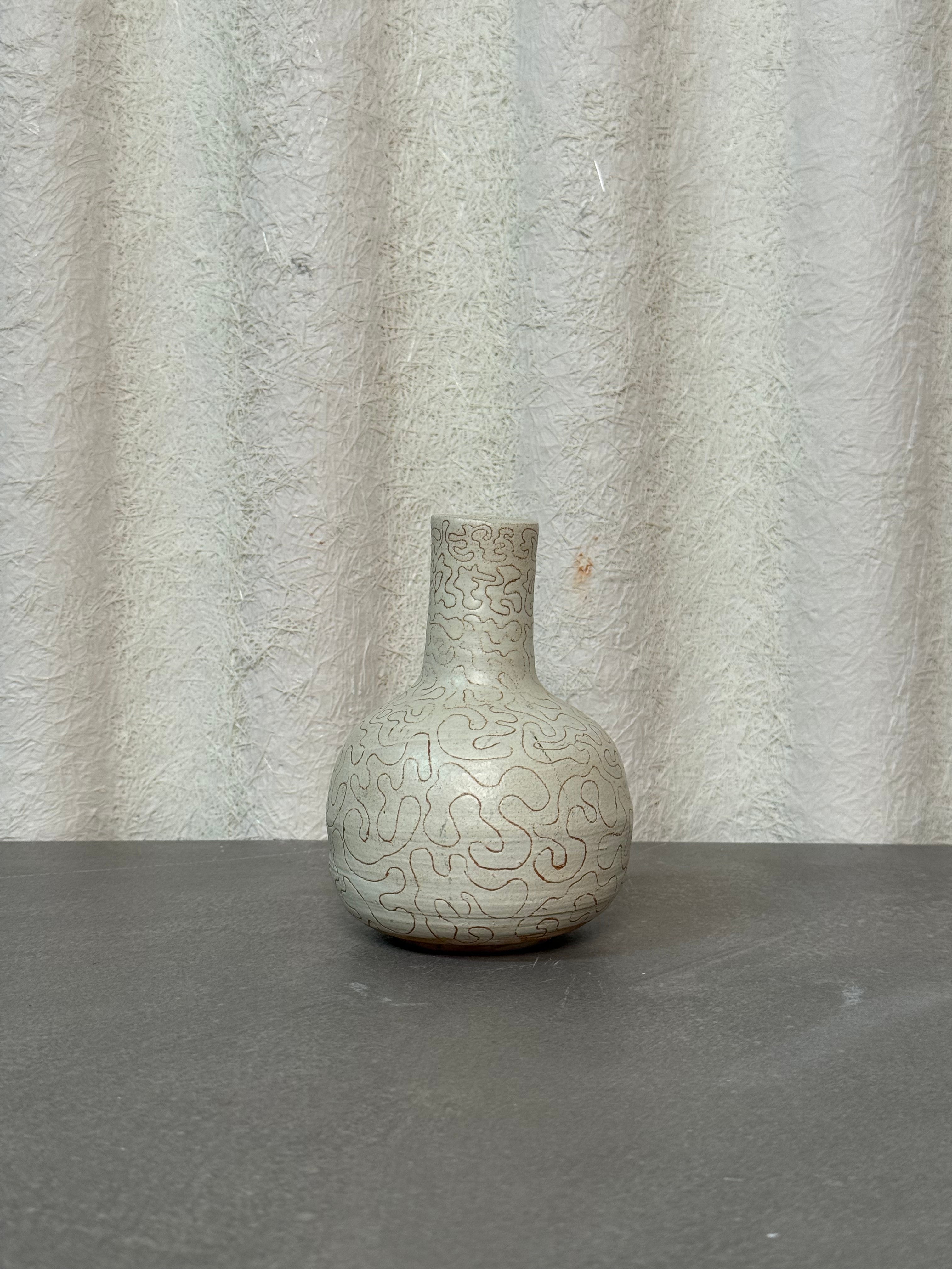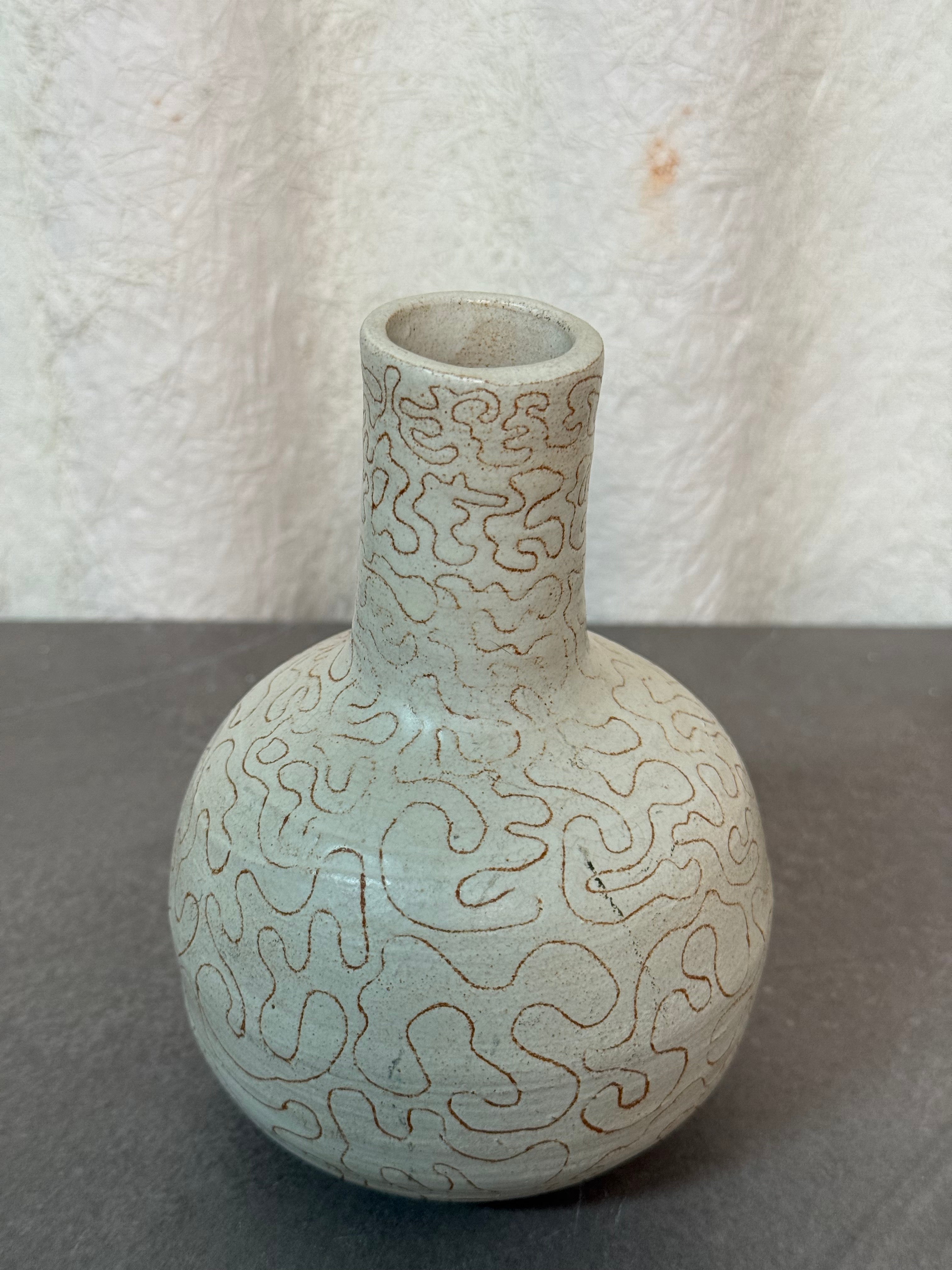 A unique vintage ceramic vase with hand-etched nomadic-style patterns and earthy glaze. A striking piece that blends texture, artistry, and timeless design.