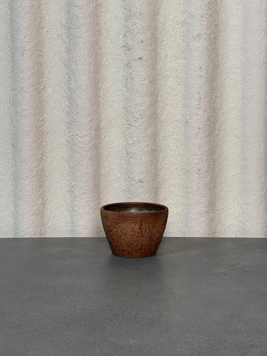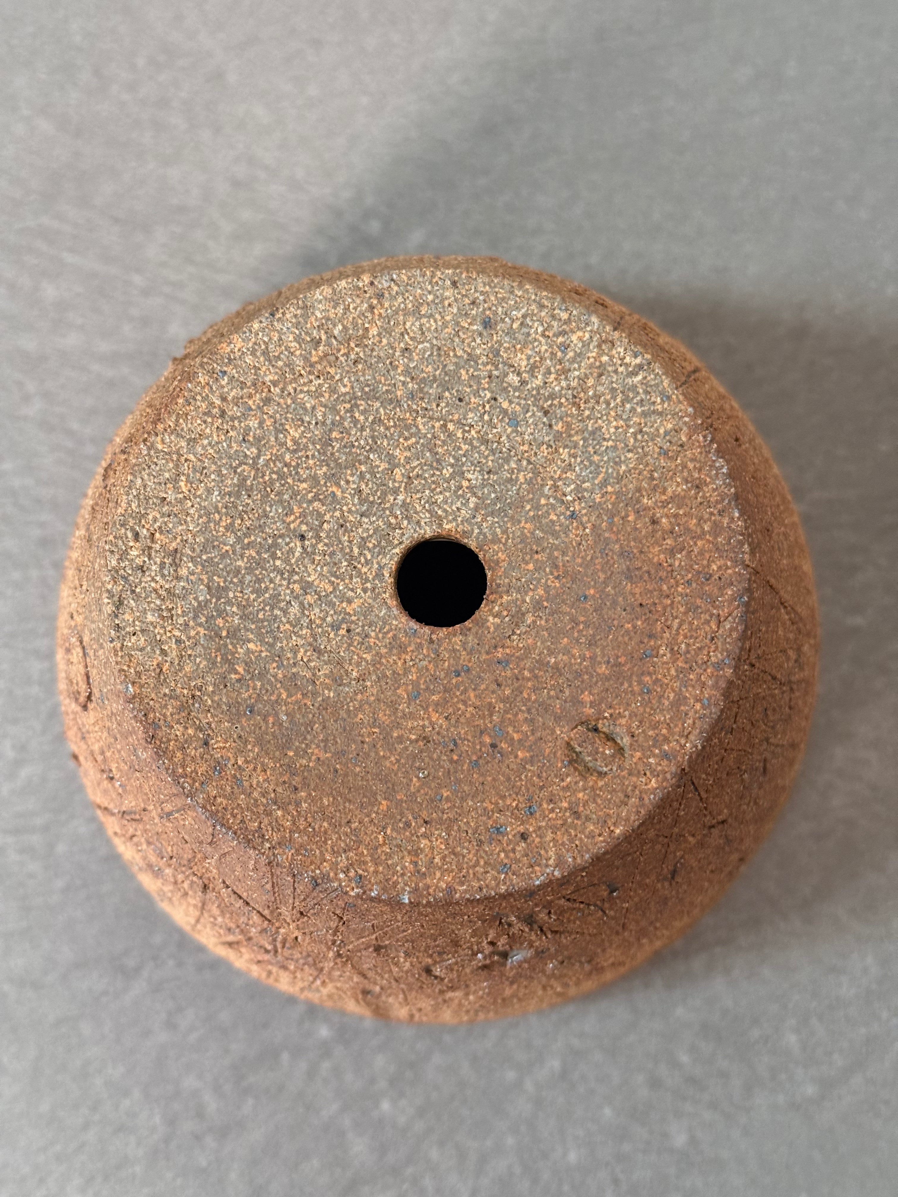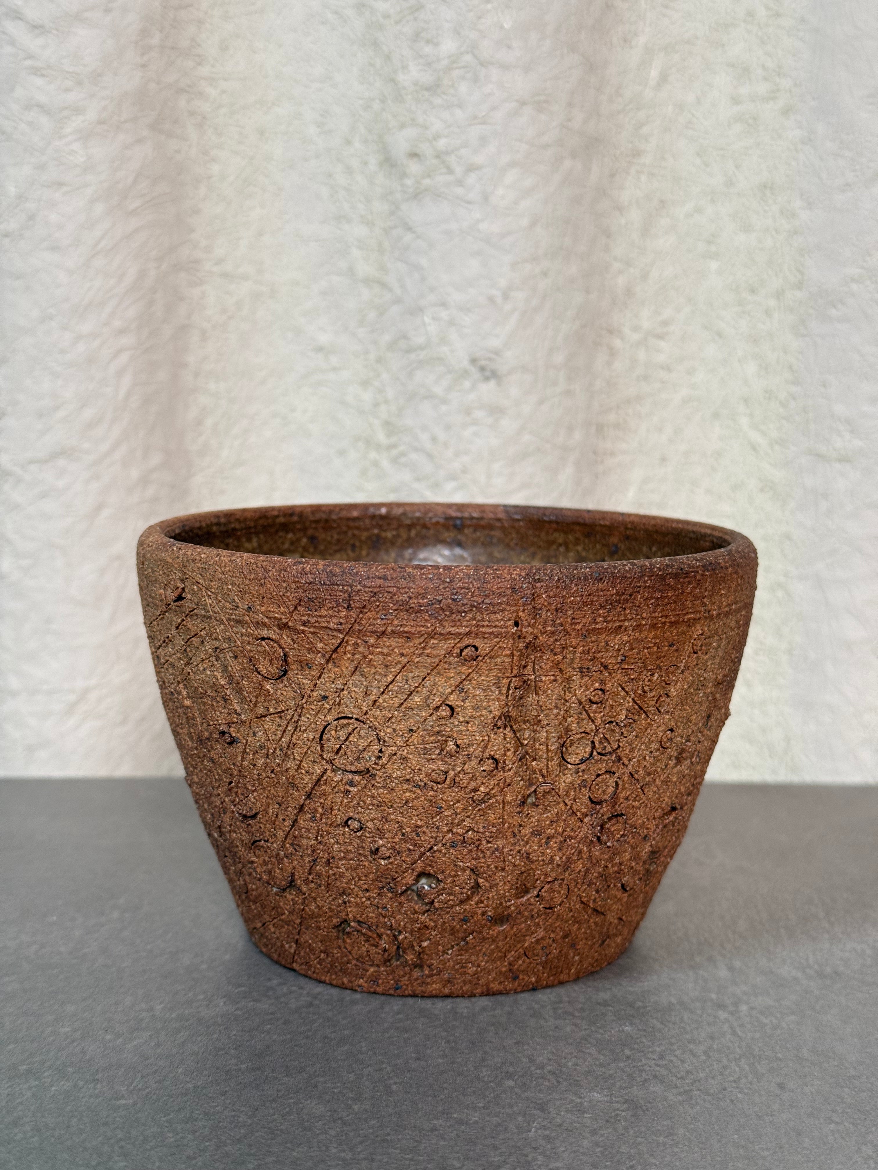 Rustic handmade clay planter with etched circle and line patterns. Earthy texture and organic charm, ideal for small plants or decor.
