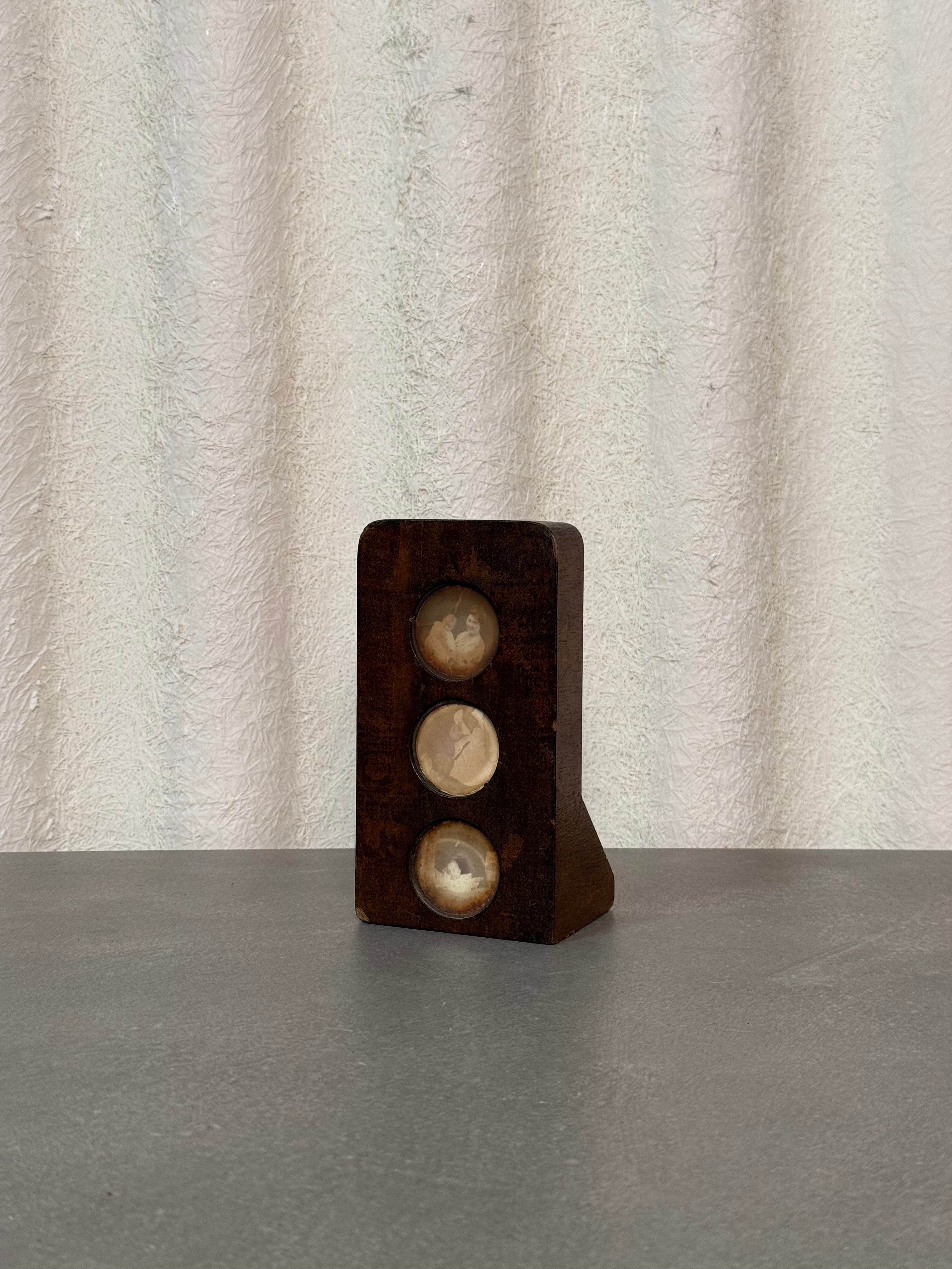 Unique angled wooden frame with three small round photo insets. Holds aged black-and-white portraits, adding charm and character. Perfect for display on a desk or shelf.