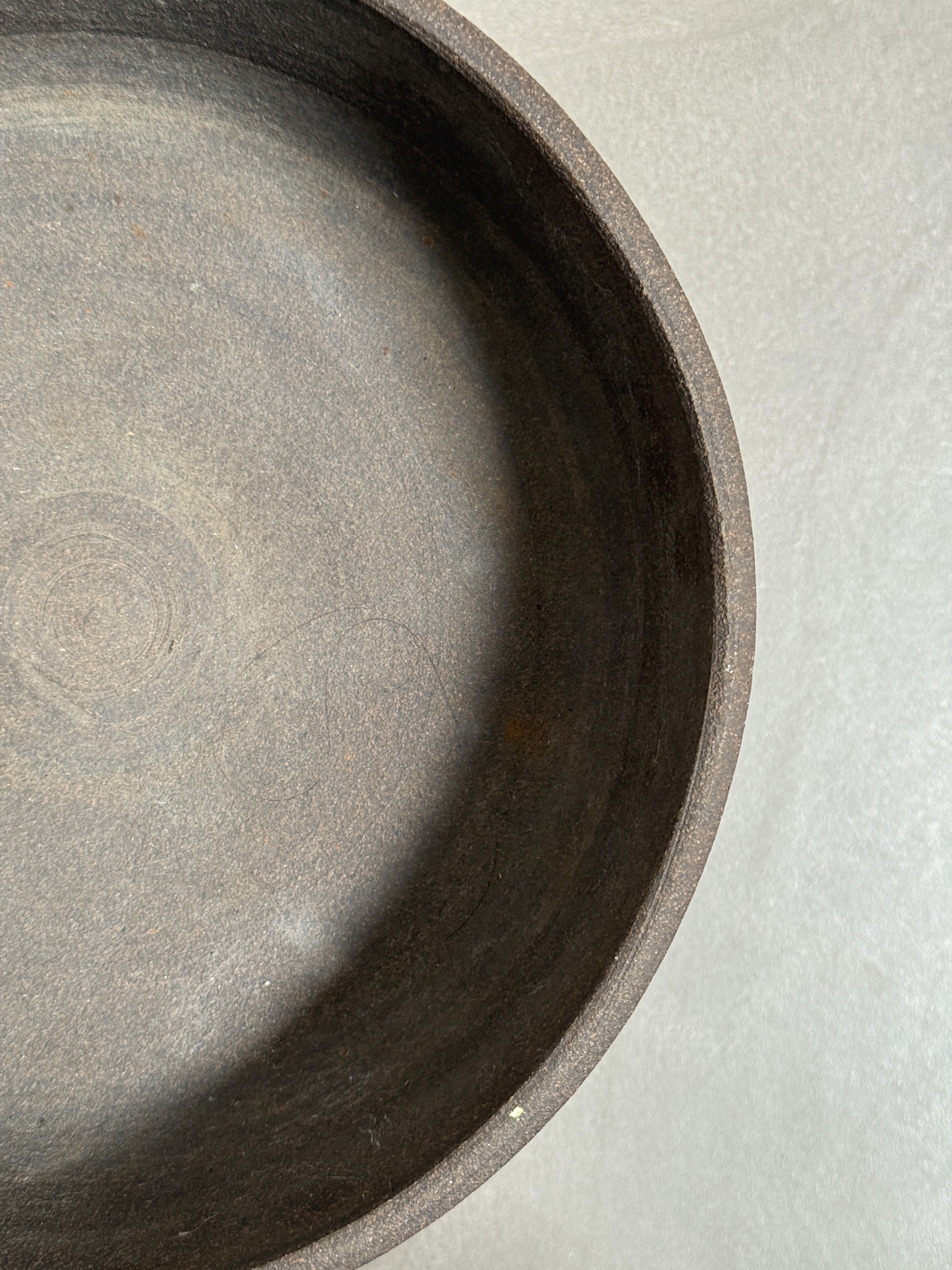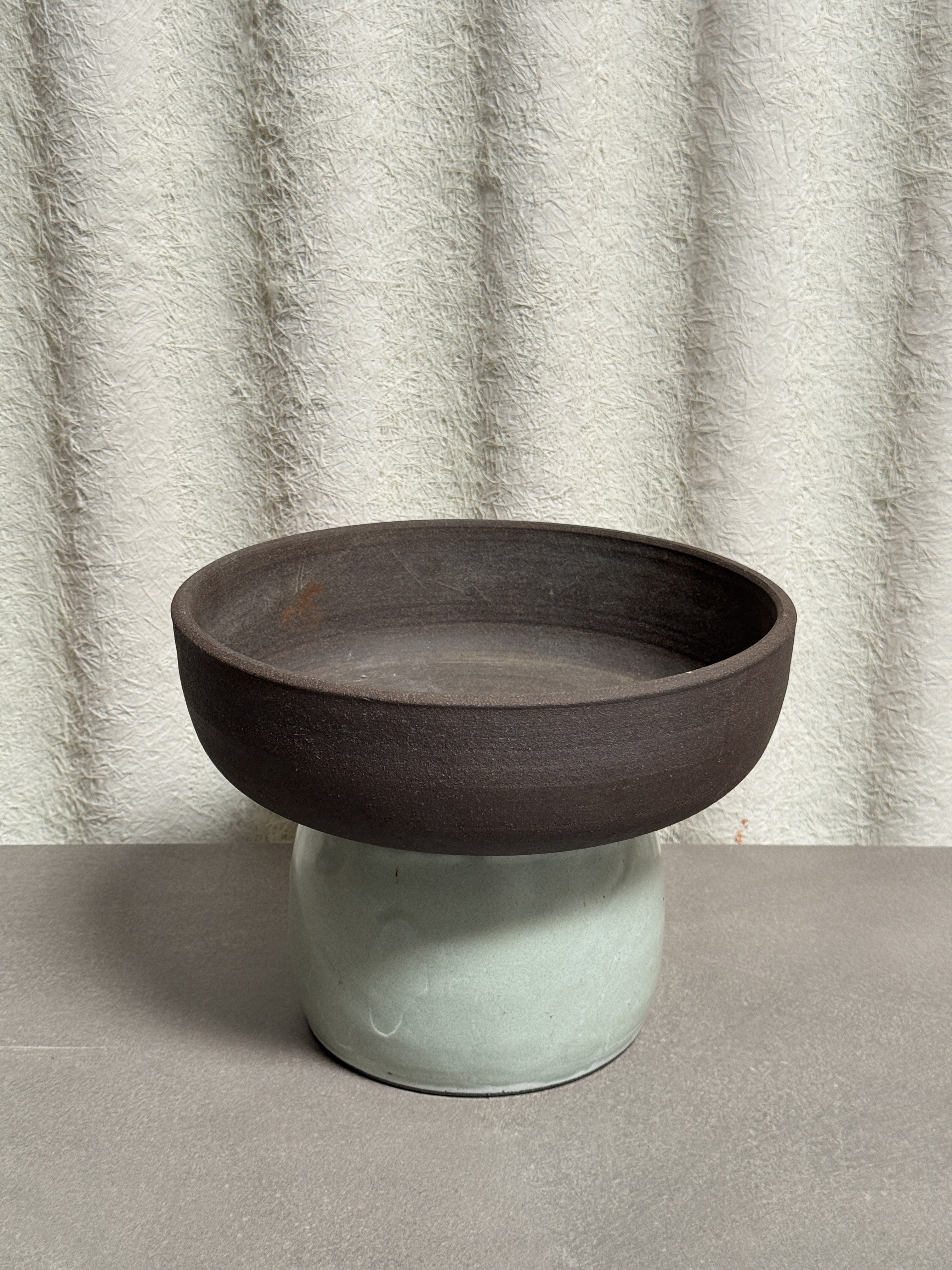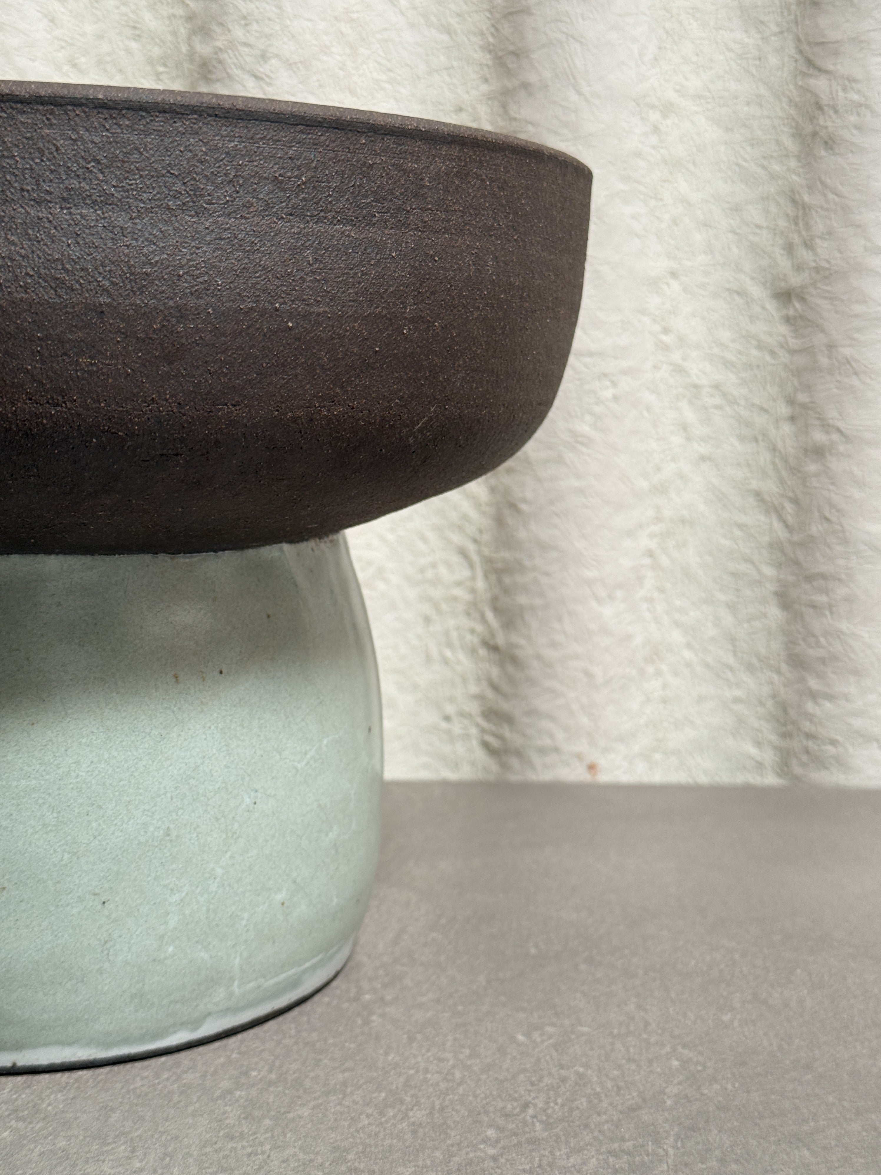 This contemporary pedestal bowl features a bold two-tone contrast, with a raw, dark chocolate stoneware upper form resting atop a glossy celadon-glazed base. Sculptural and functional, this piece blends architectural balance with earthy materiality.