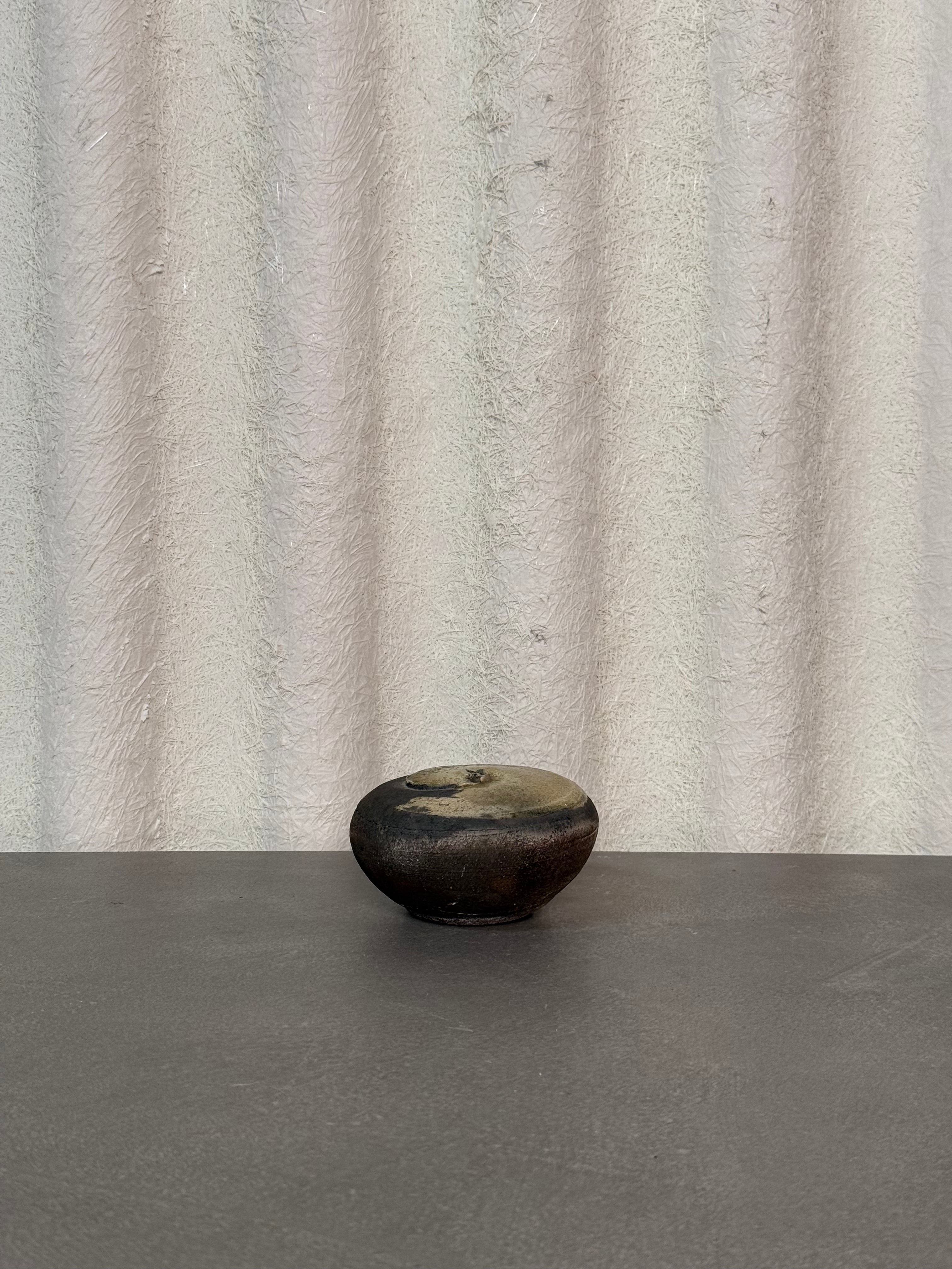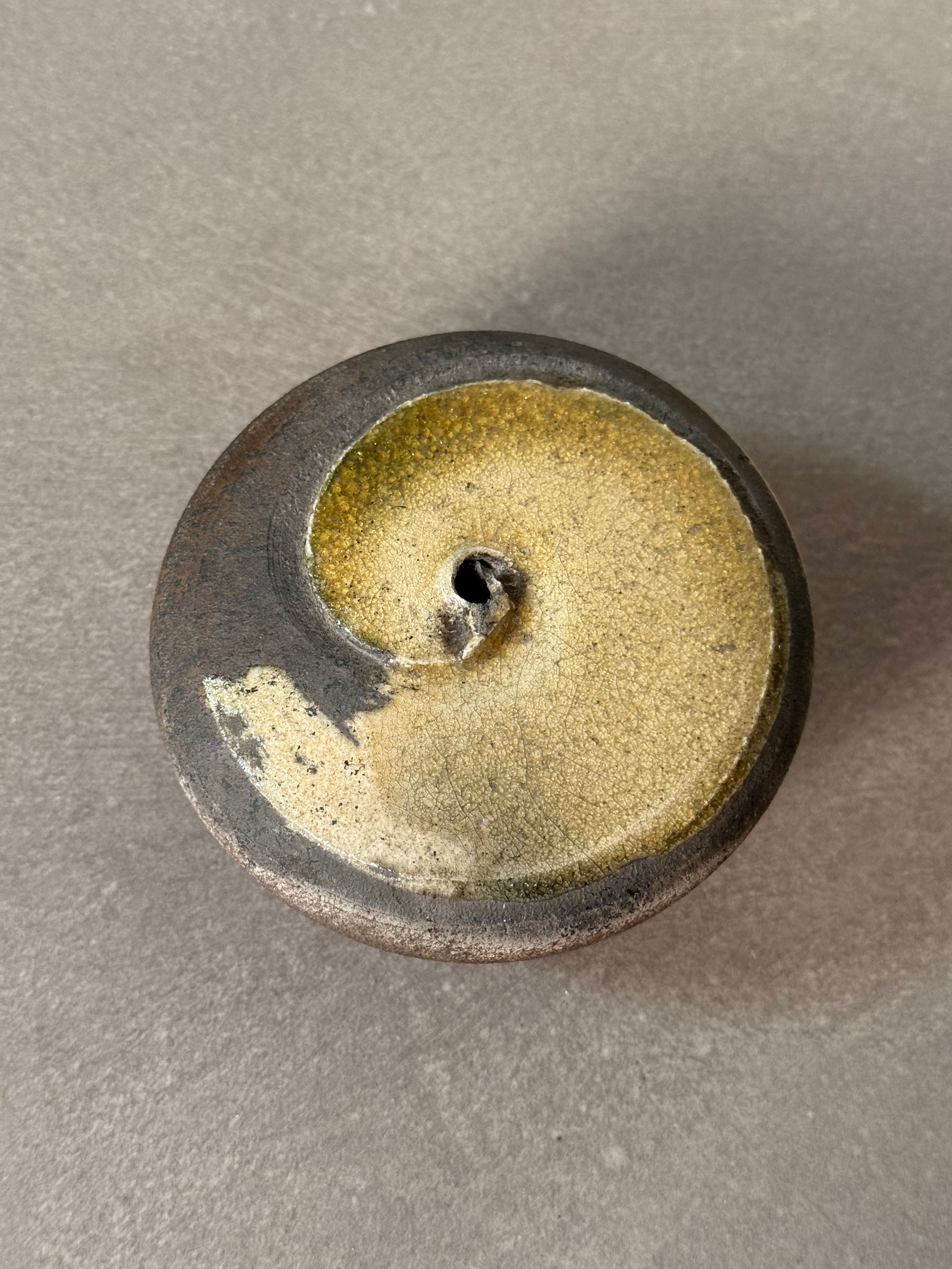 A handcrafted vintage studio pottery weed pot with earthy tones and a golden glazed top. Perfect for single stems or as a collectible decorative piece.