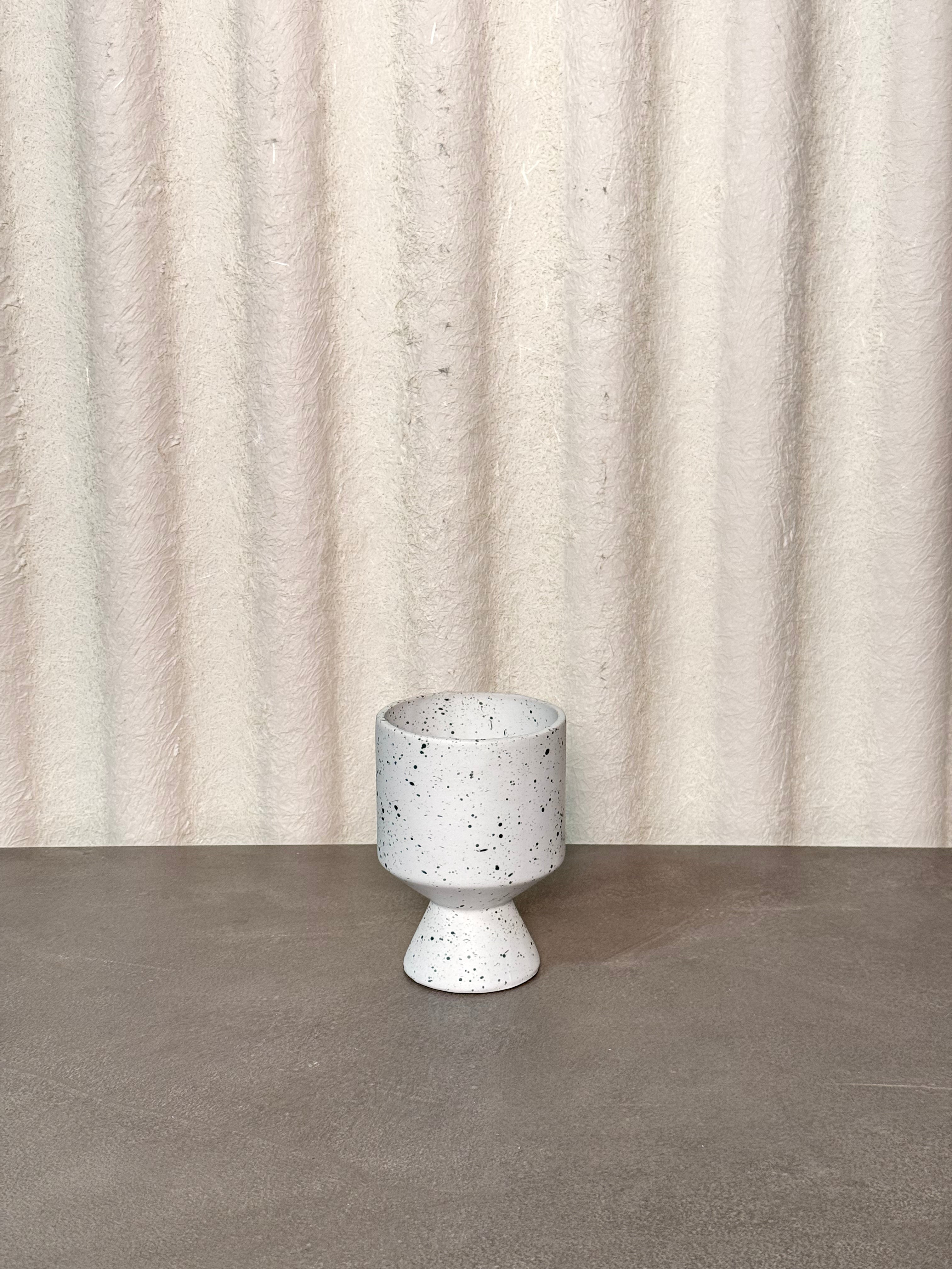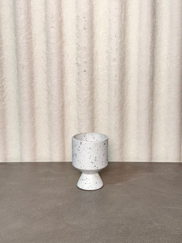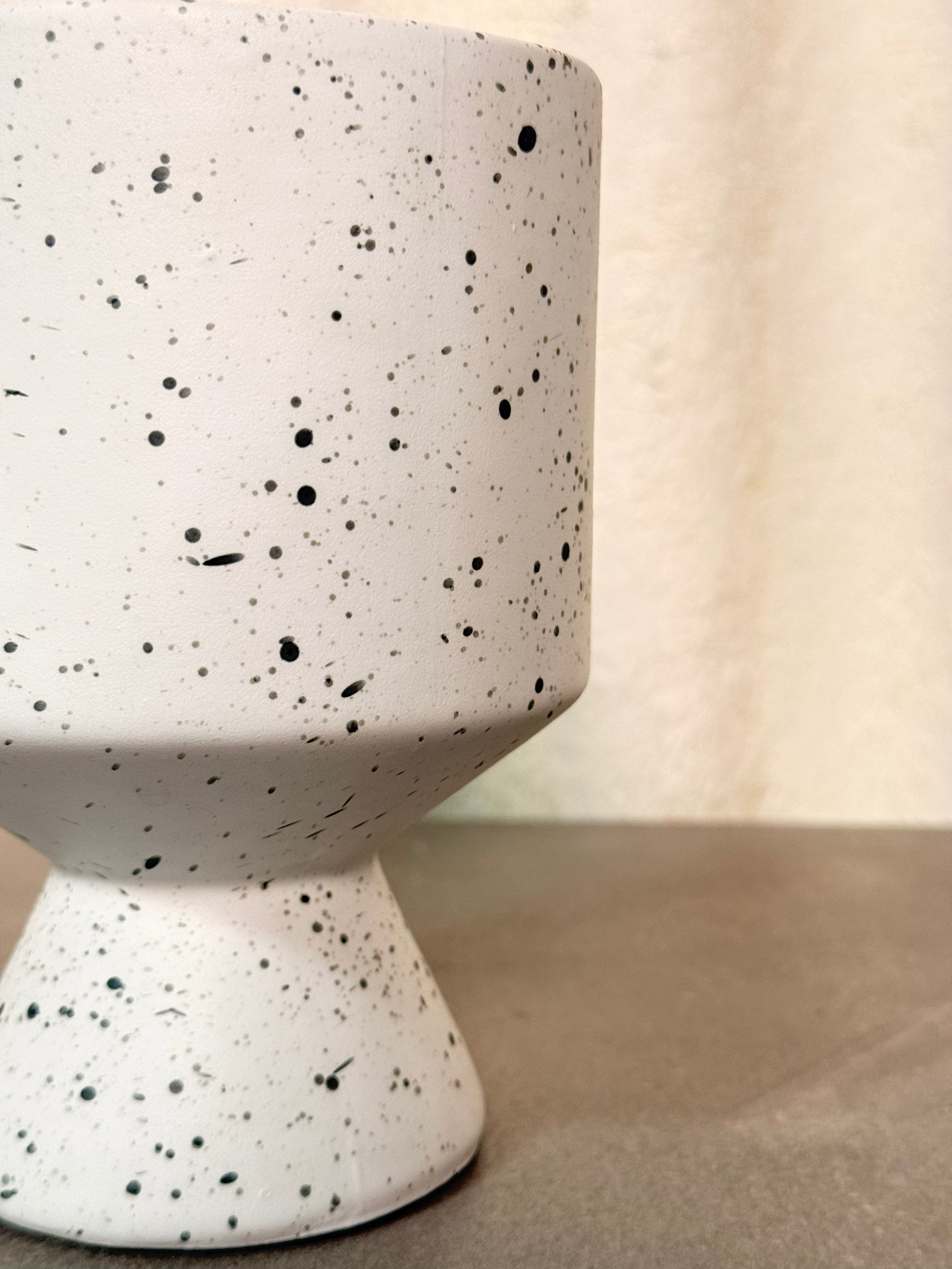 Ceramic pedestal vase/planter with a matte white glaze and black speckle finish. Its sculptural silhouette and clean lines make it ideal for showcasing small plants or as a minimalist decorative accent.