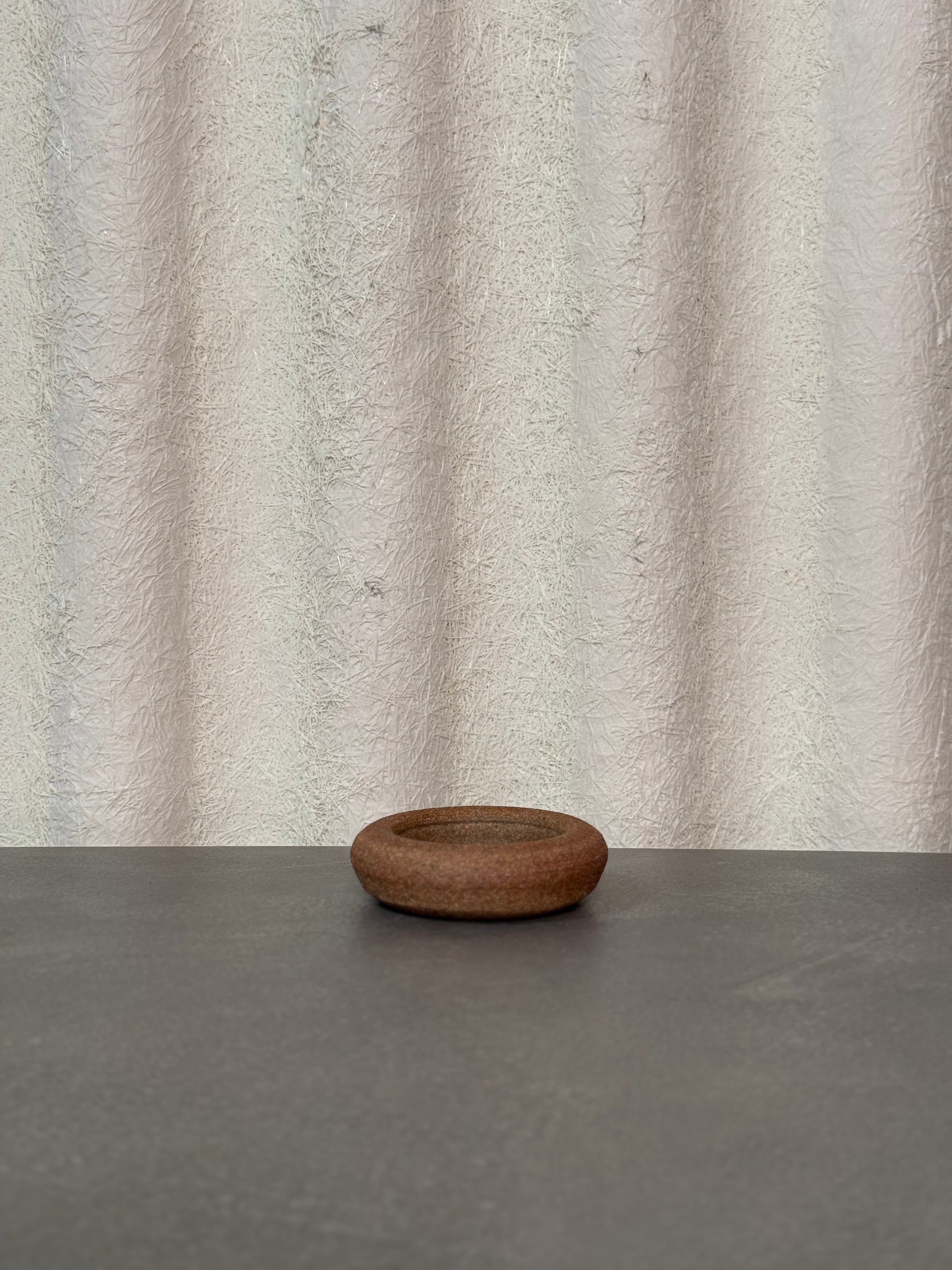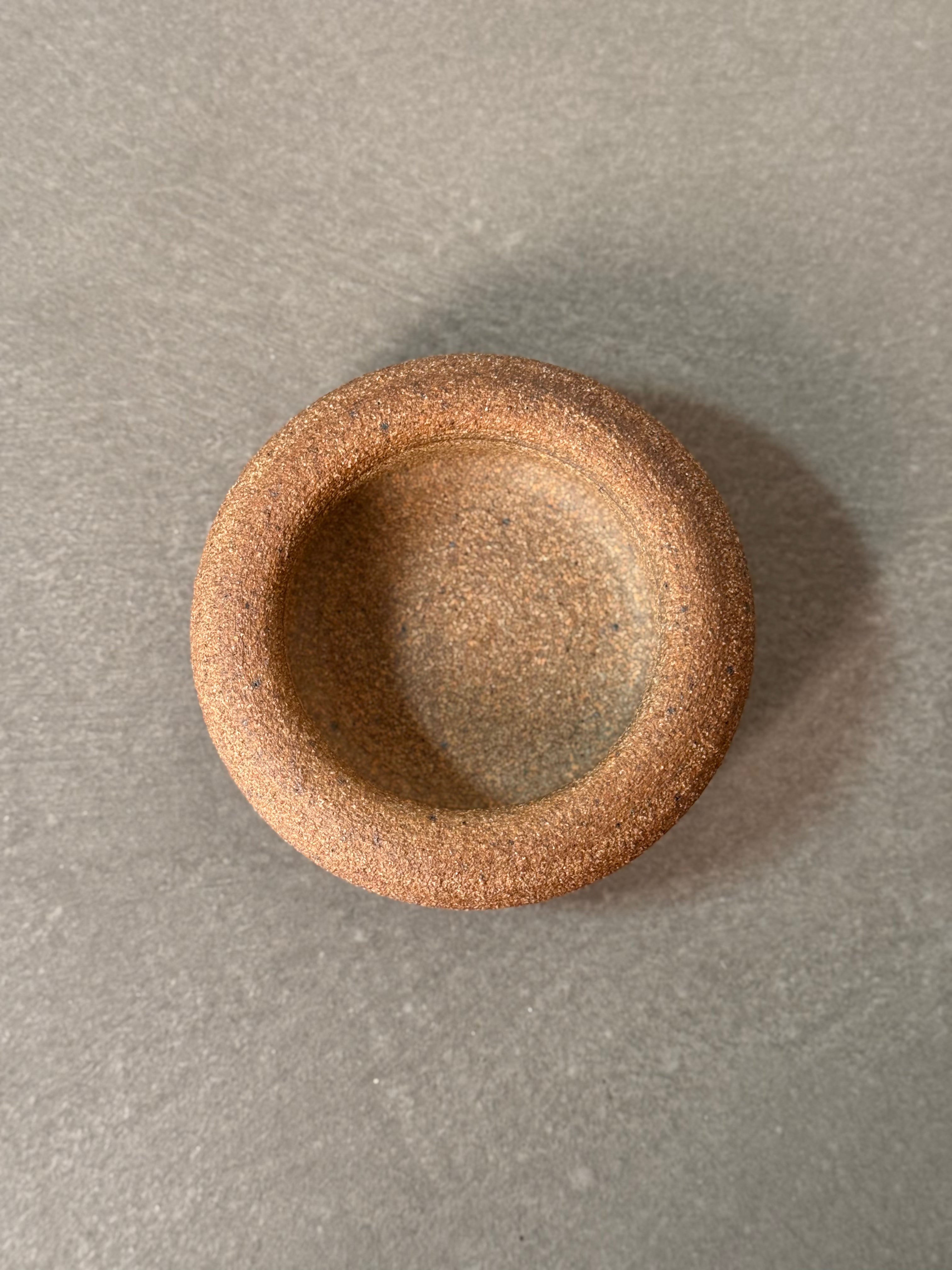 A handcrafted vintage pottery bowl with earthy textured finish and low, rounded form.