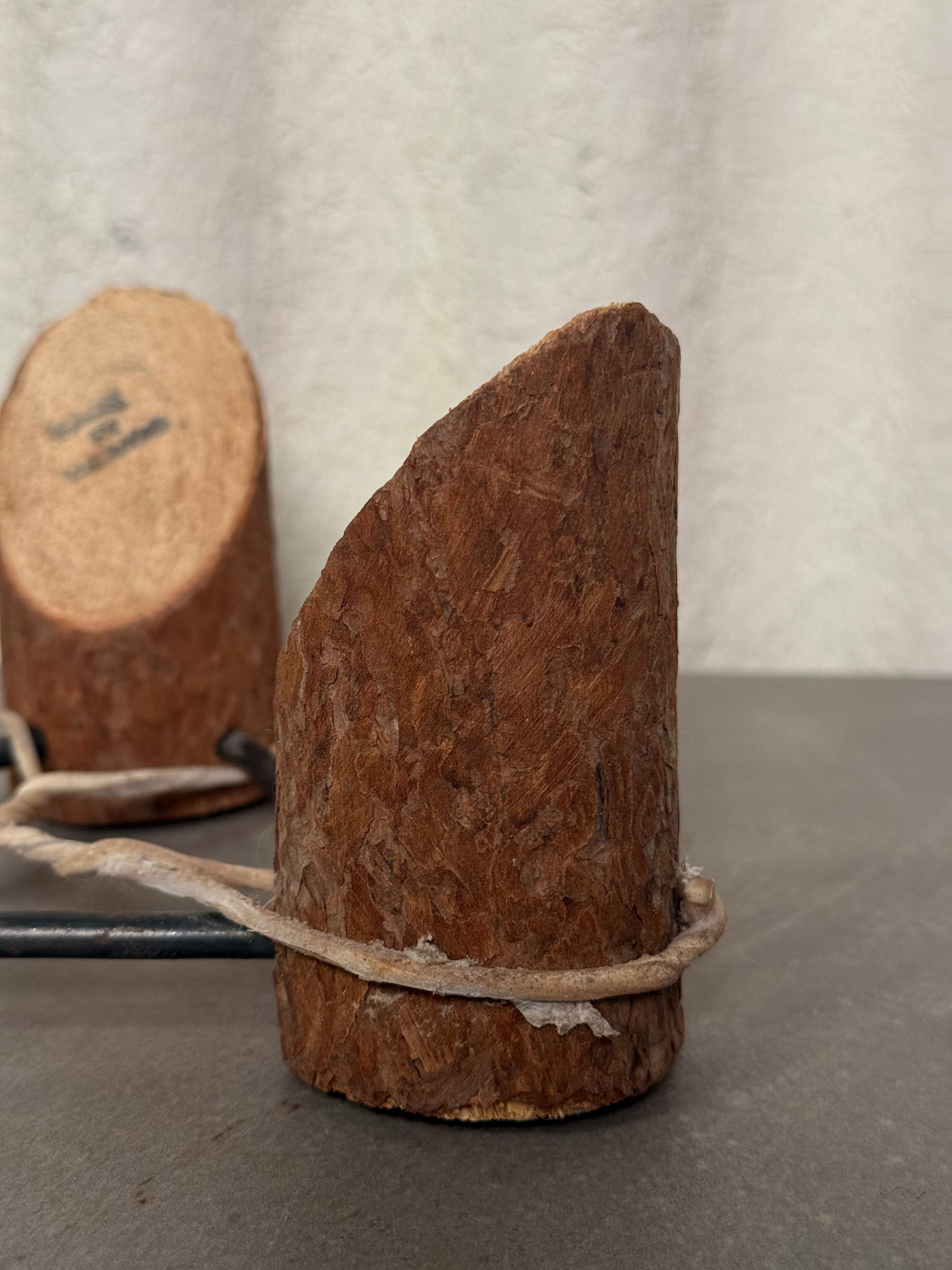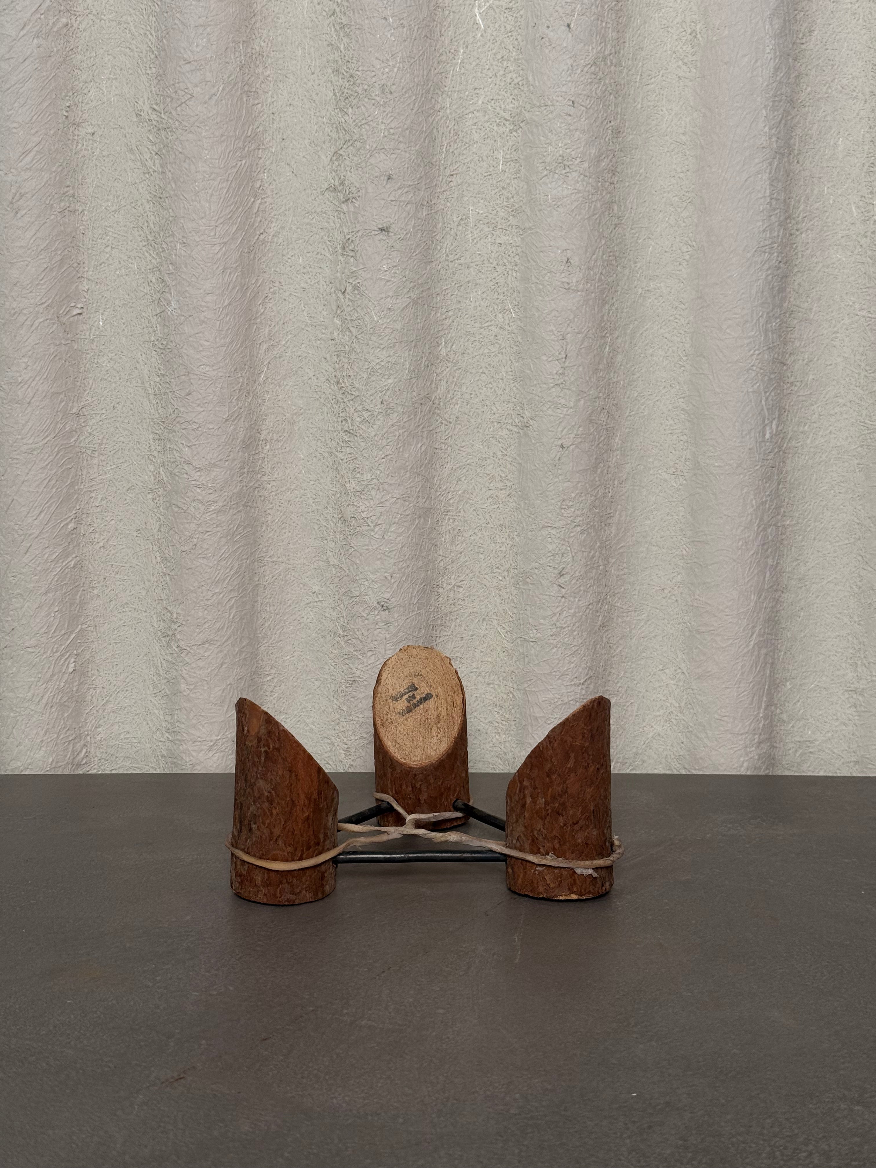 Set of three wooden stump plant stands arranged in a triangle formation with metal piping and an intertwined rope centerpiece, creating a rustic, artistic display perfect for showcasing plants in any indoor or outdoor space.