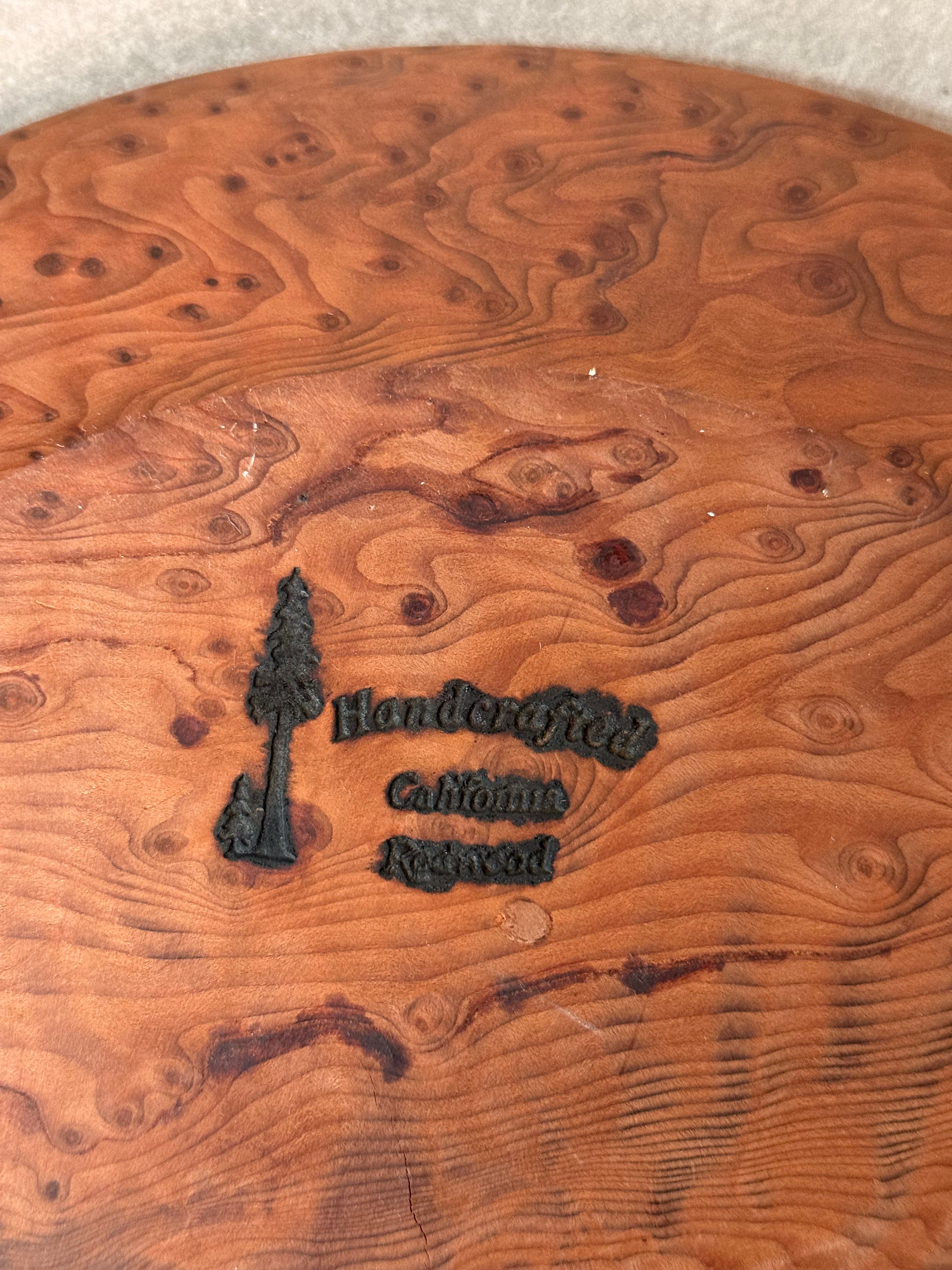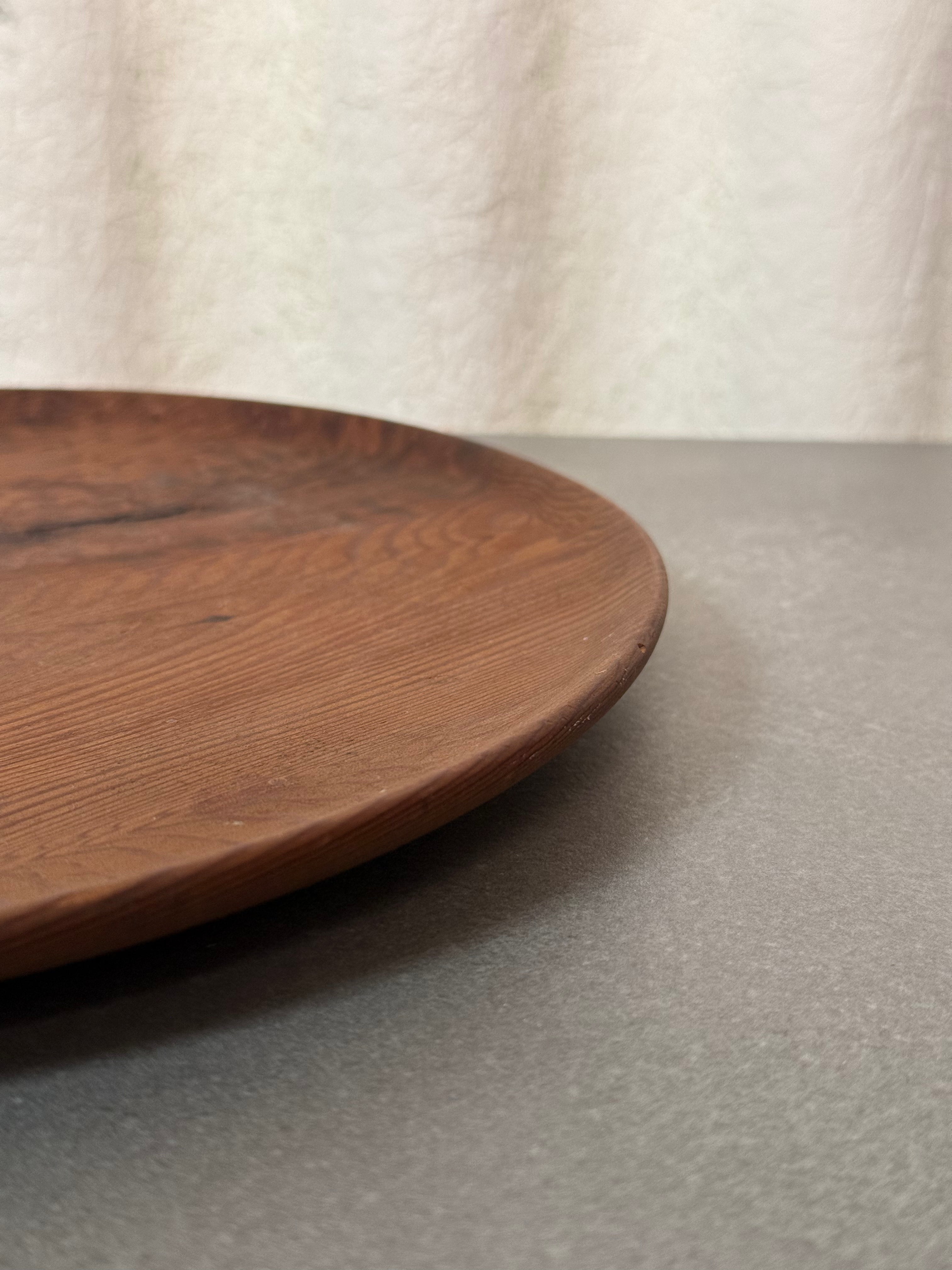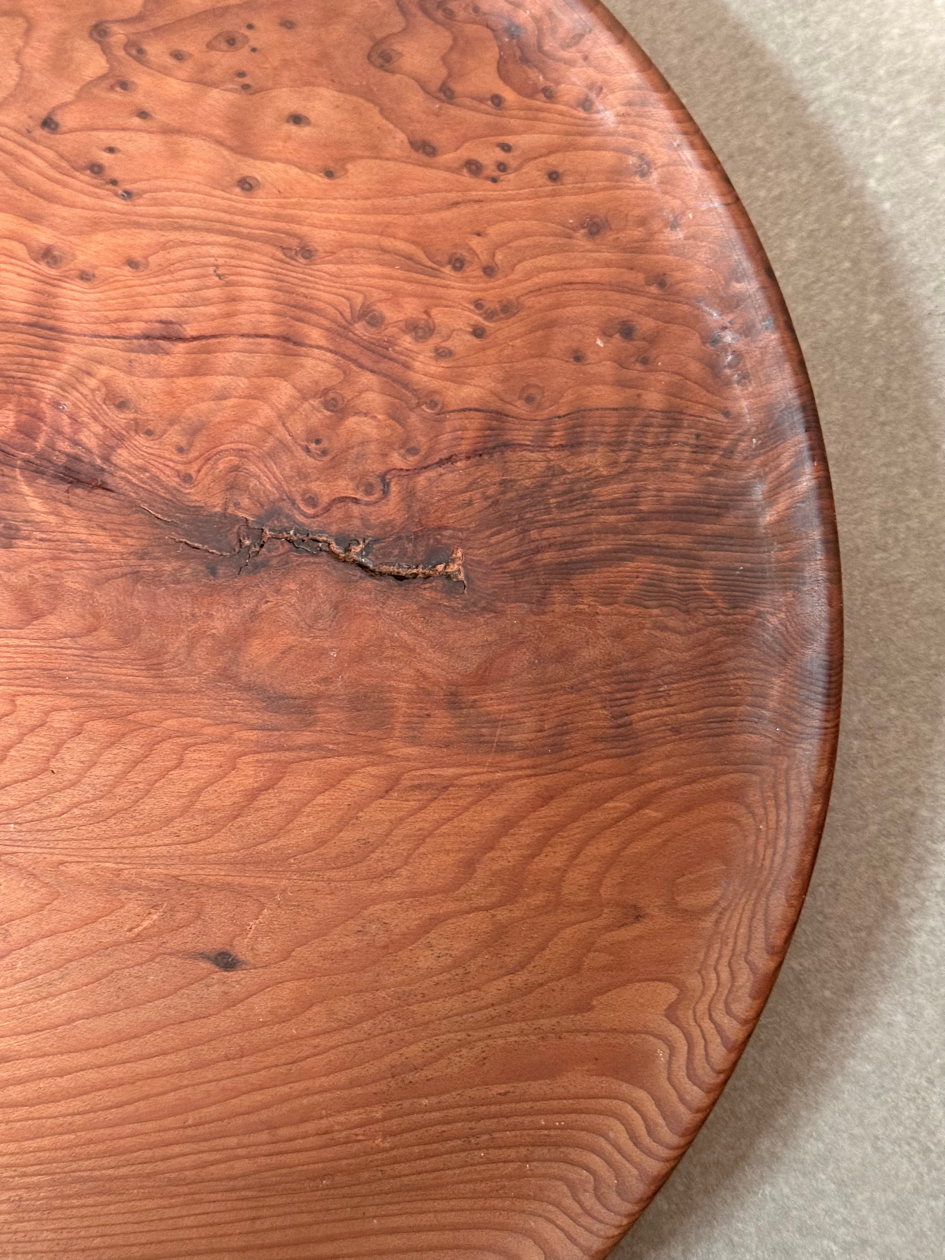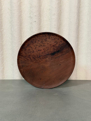 This is a large hand-turned wooden tray. The grain patterns are quite striking, showing both swirls and linear striations, giving it a natural sculptural quality.