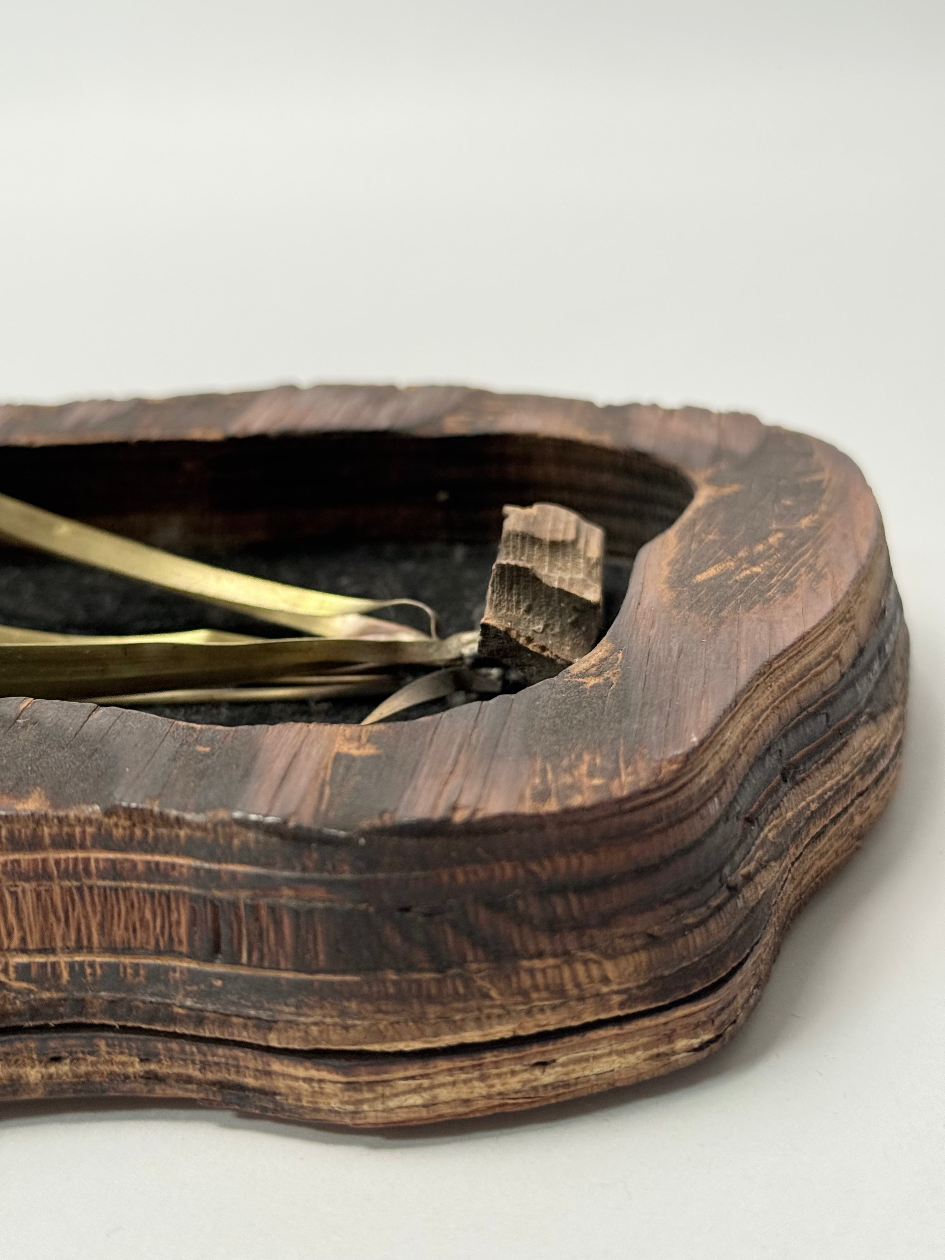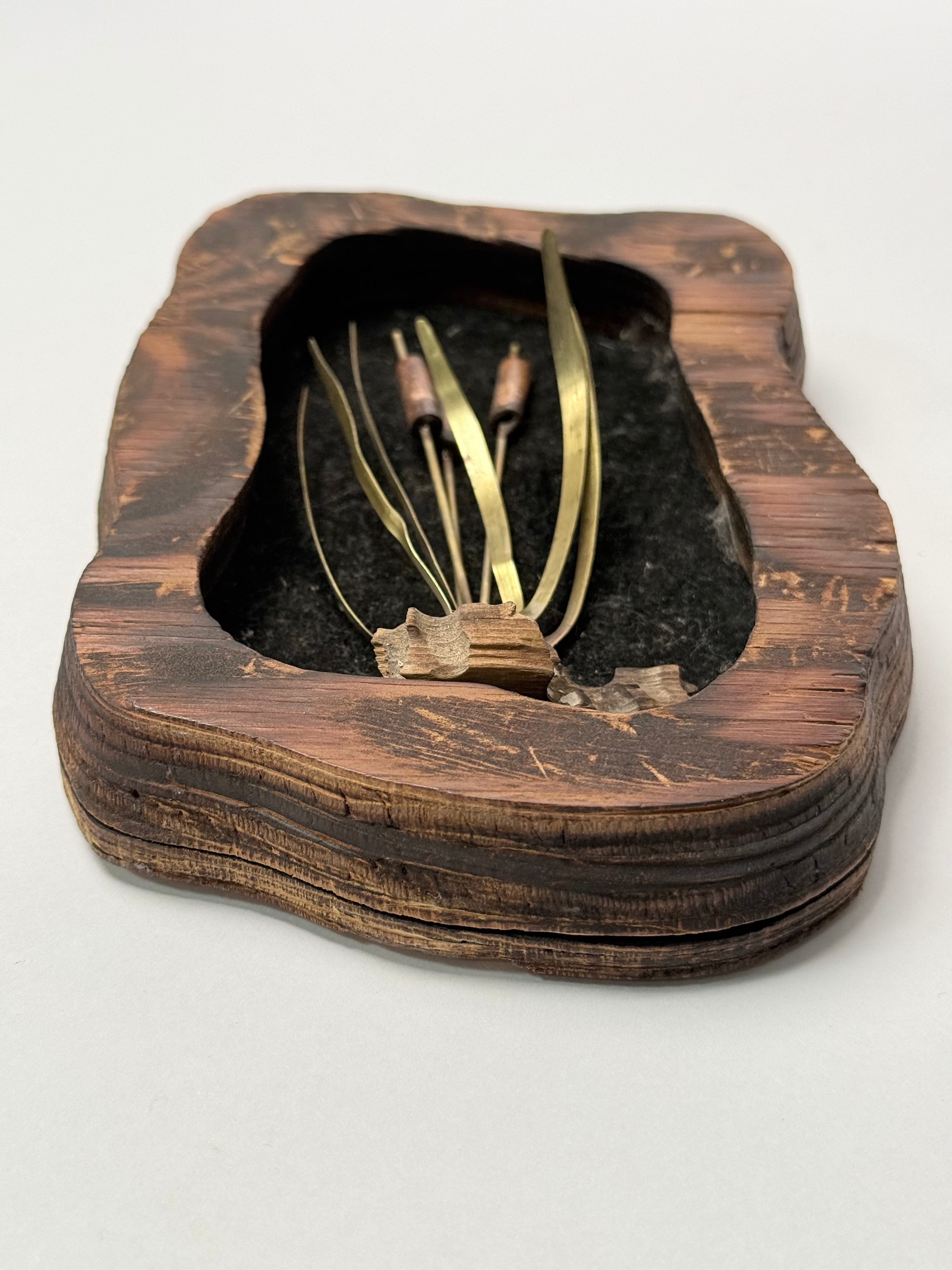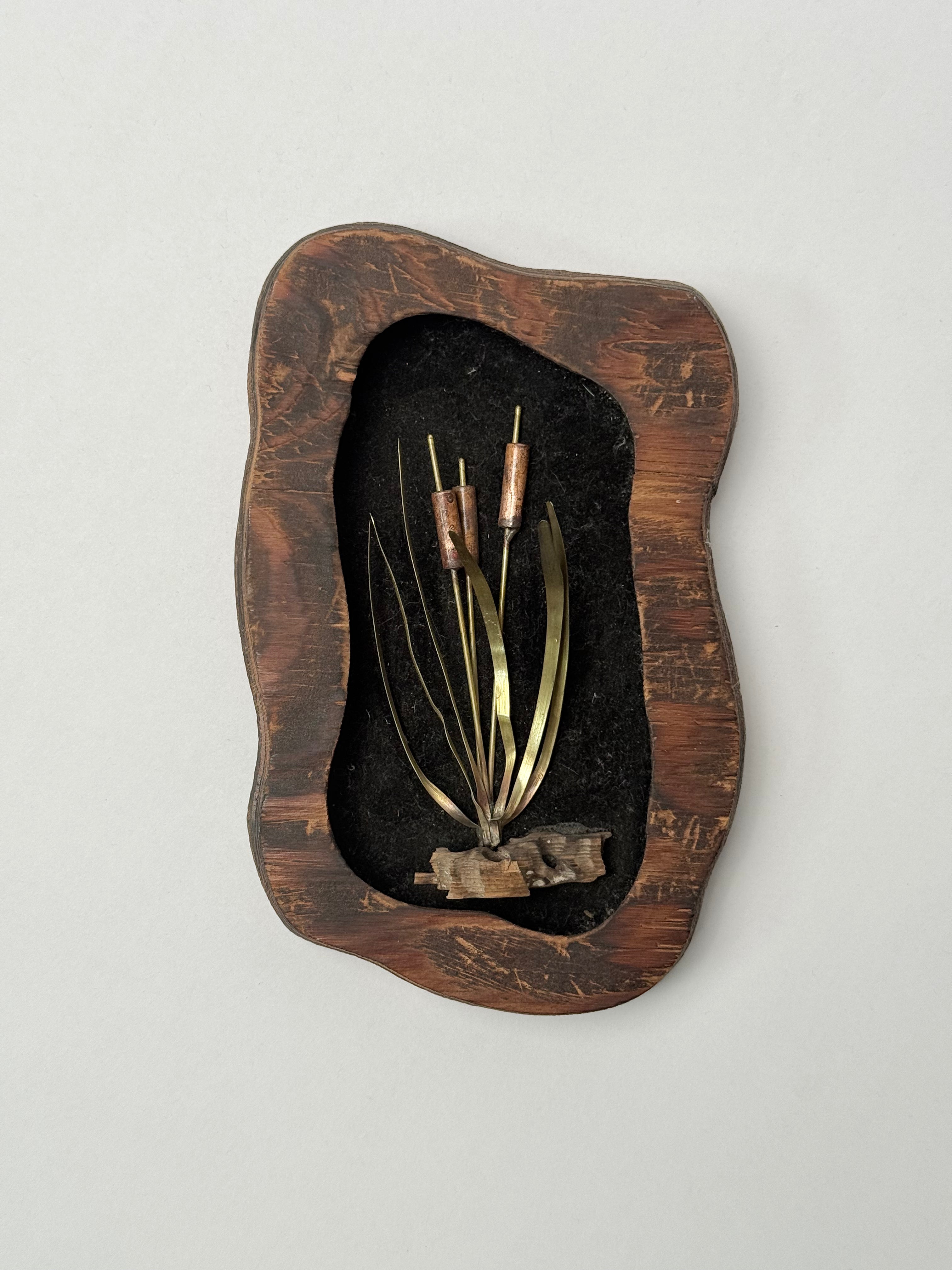 Handcrafted from warm brass, this sculptural piece captures delicate cattail forms with authentic mid-century artistry. The metal reeds and foliage are expertly mounted against a rich dark velvet background, creating dimensional depth and visual interest.