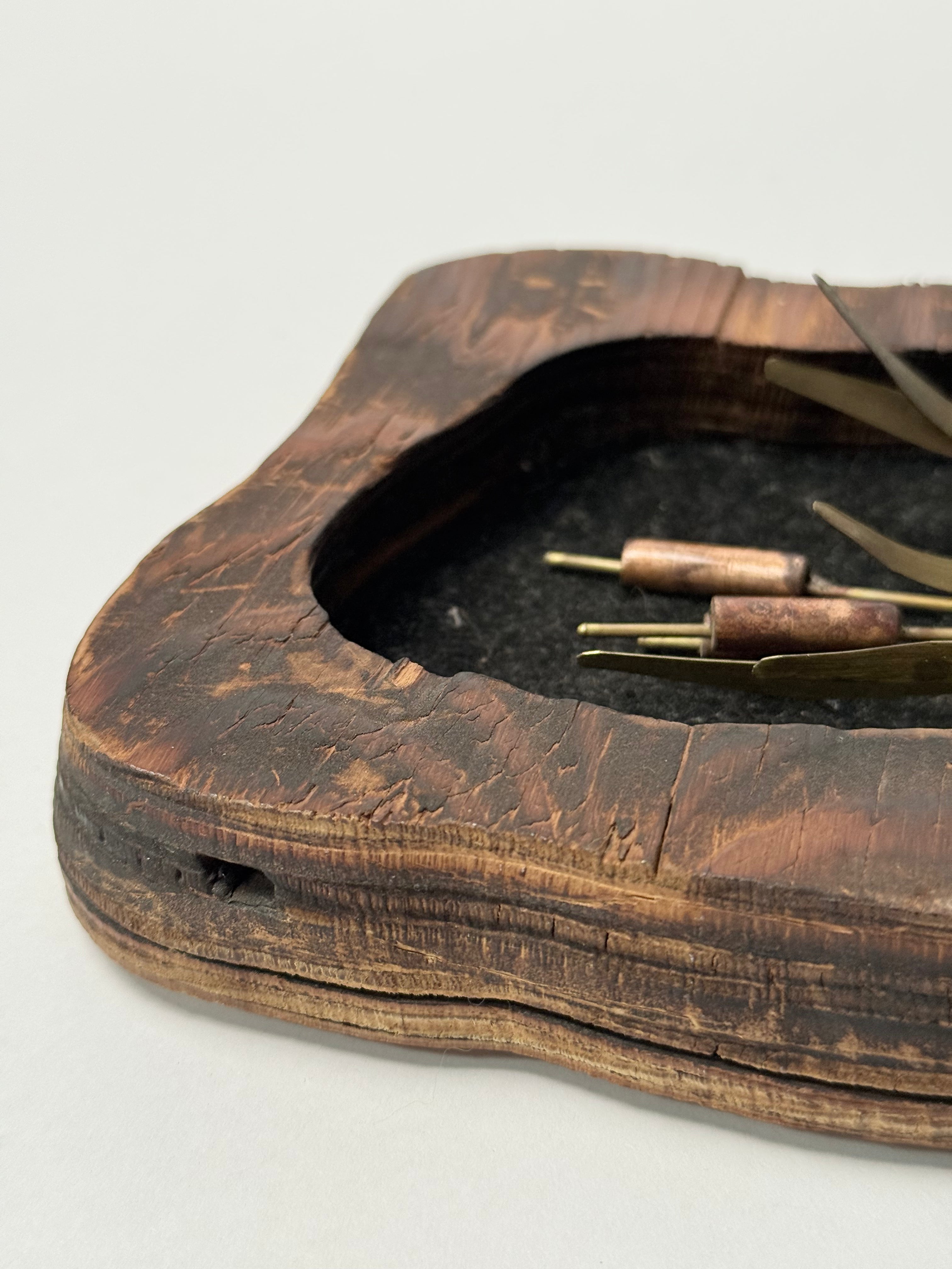 Good vintage condition, showing a natural, aged patina on the brass cattails and characteristic wear on the wooden frame consistent with its age.