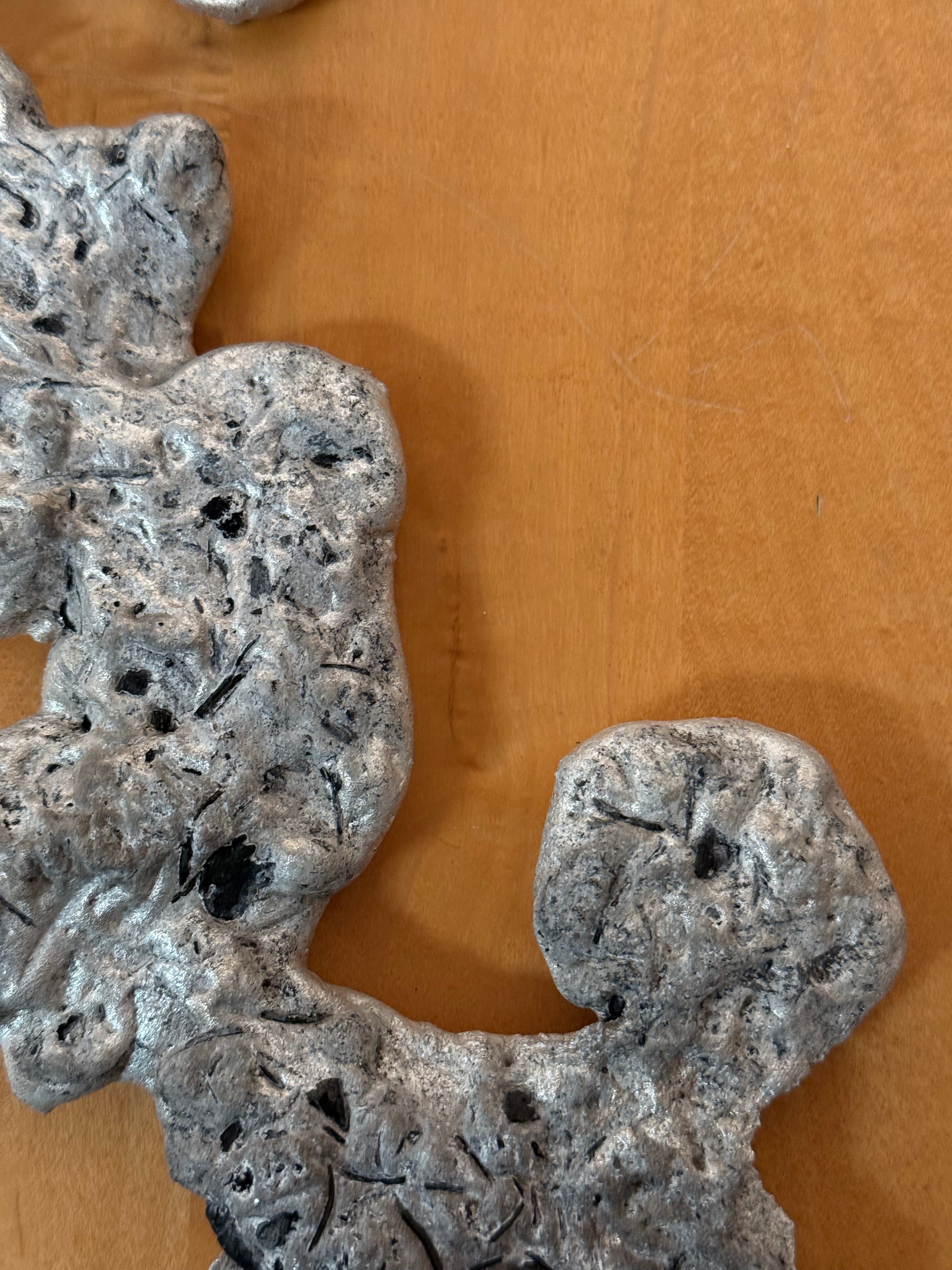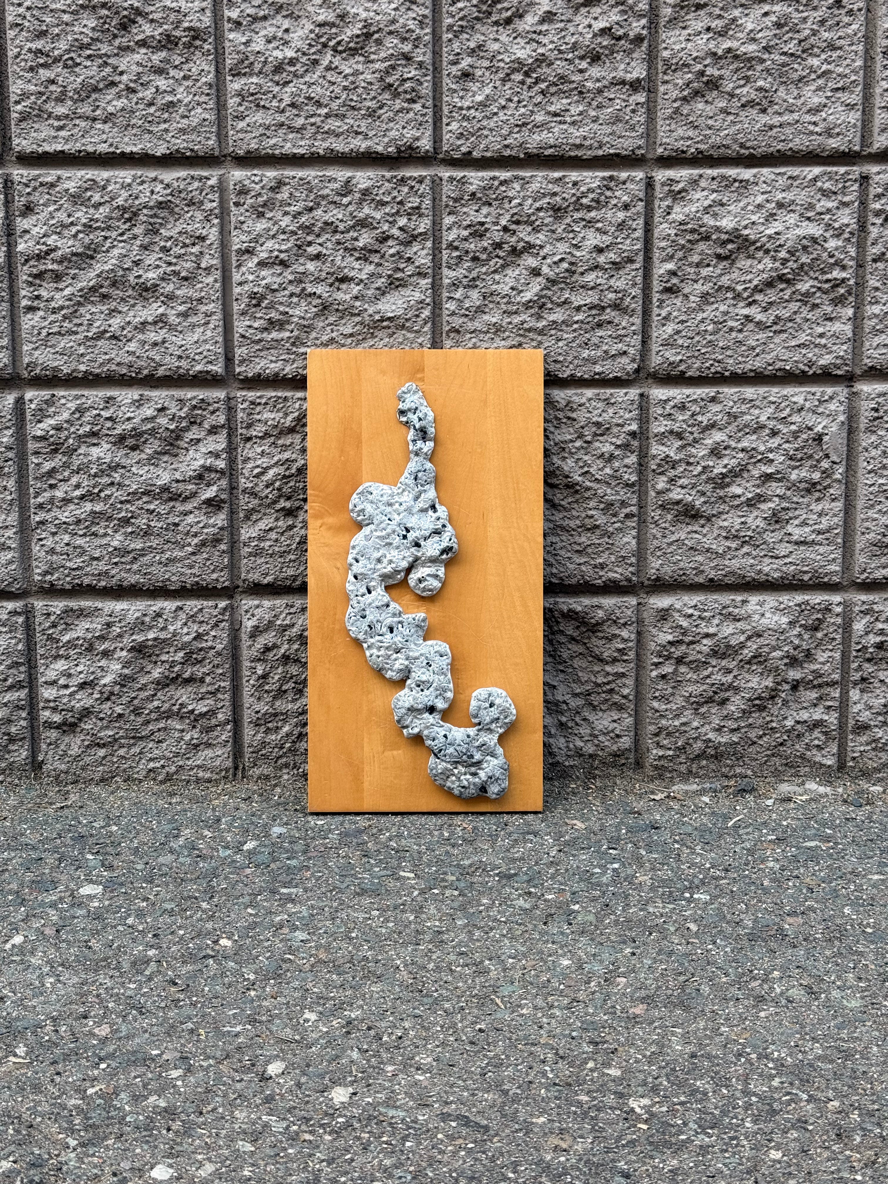 Abstract wall-mounted sculpture composed of an organic, textured aluminum form mounted on a warm-toned wooden panel. The irregular, porous surface creates strong visual contrast against the smooth wood ground, emphasizing material tension, relief, and sculptural depth. A distinctive statement piece suited for modern or brutalist interiors.