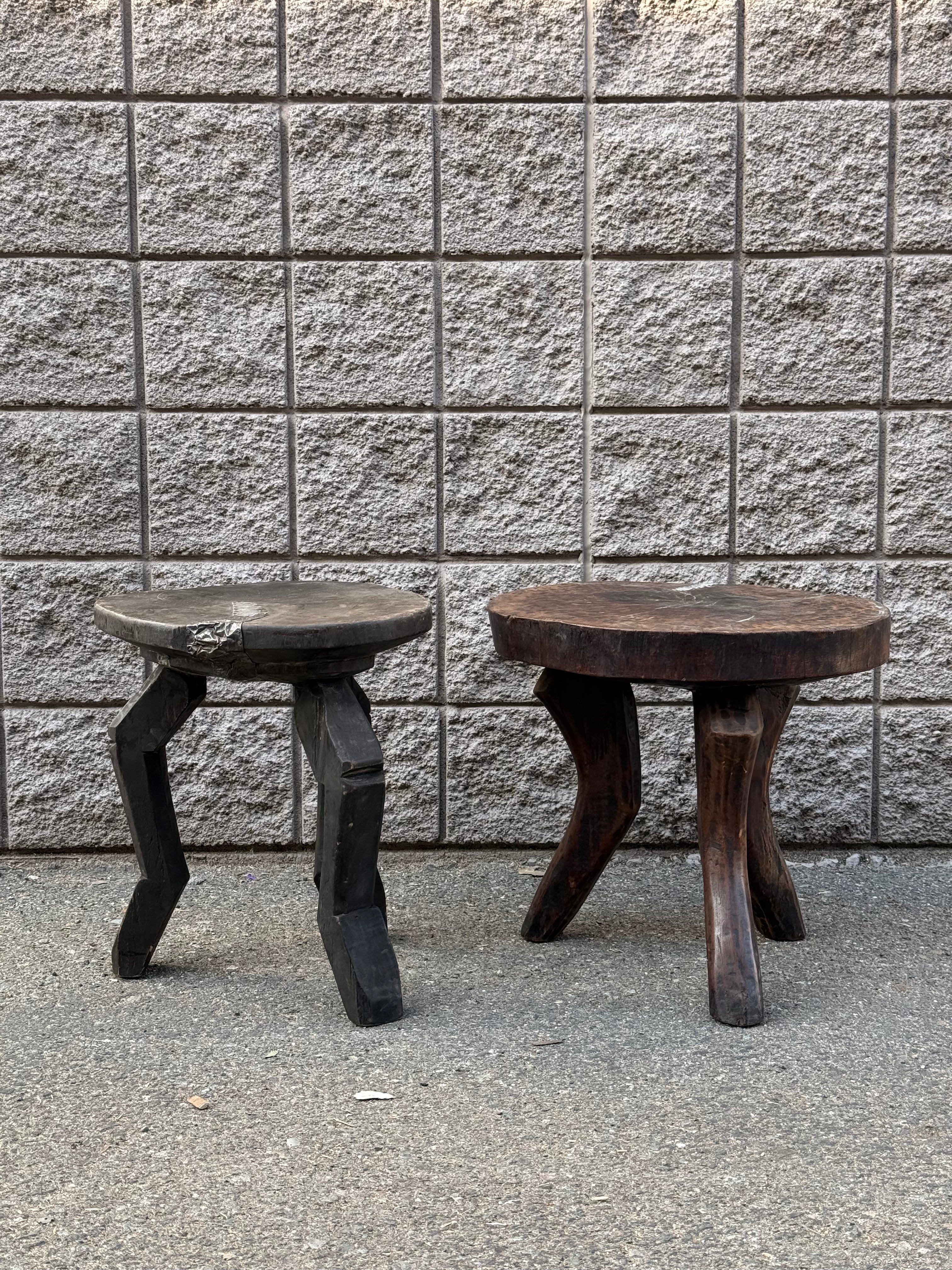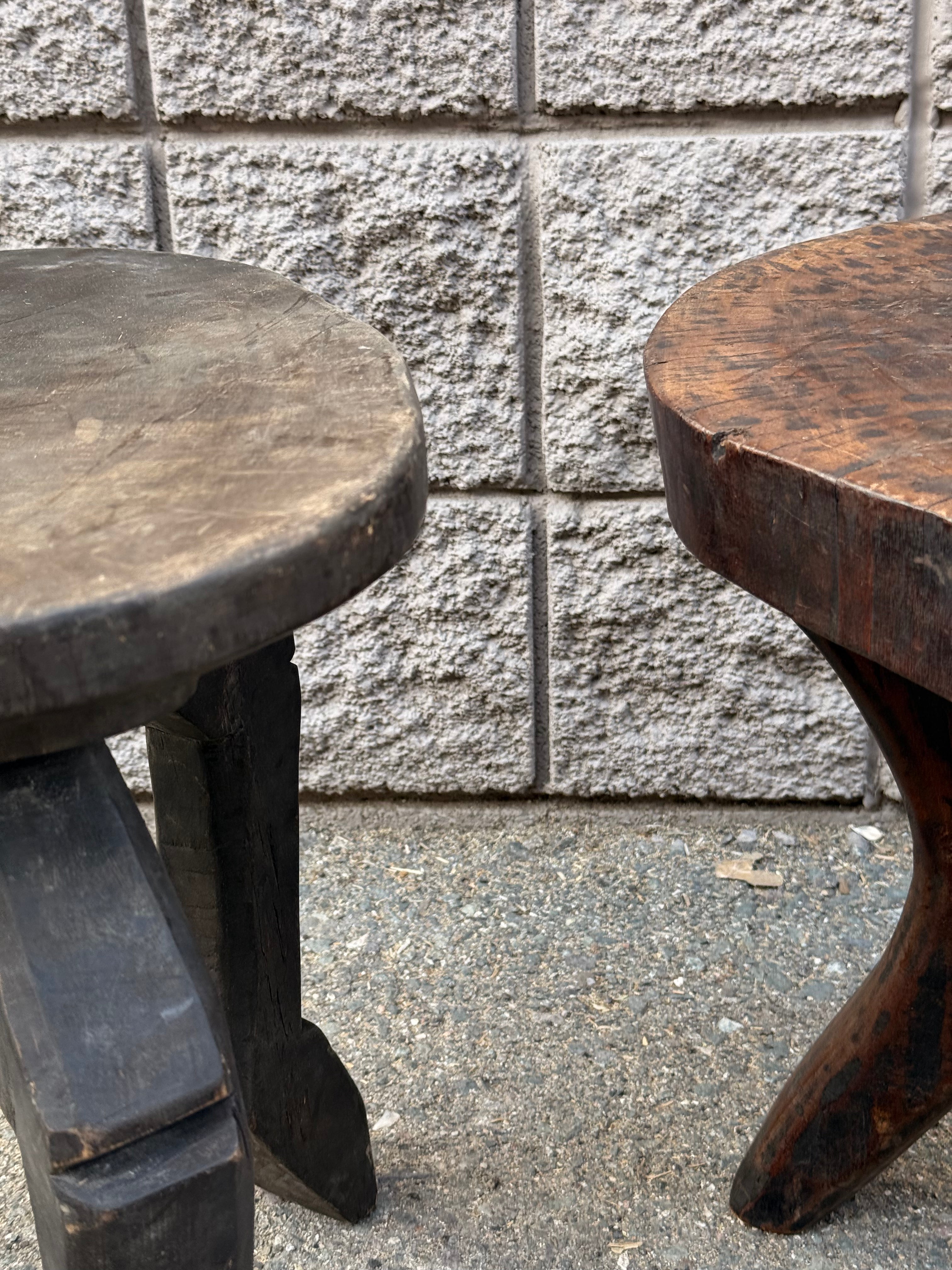 Vintage hand-carved wooden stools featuring solid round seats and sculptural tripod bases. Each stool displays distinctive craftsmanship, with one showcasing angular, faceted legs in a dark stained finish, and the other featuring organically shaped legs with a rich, warm patina. The visible tool marks, natural wood grain, and surface wear highlight their handmade character.