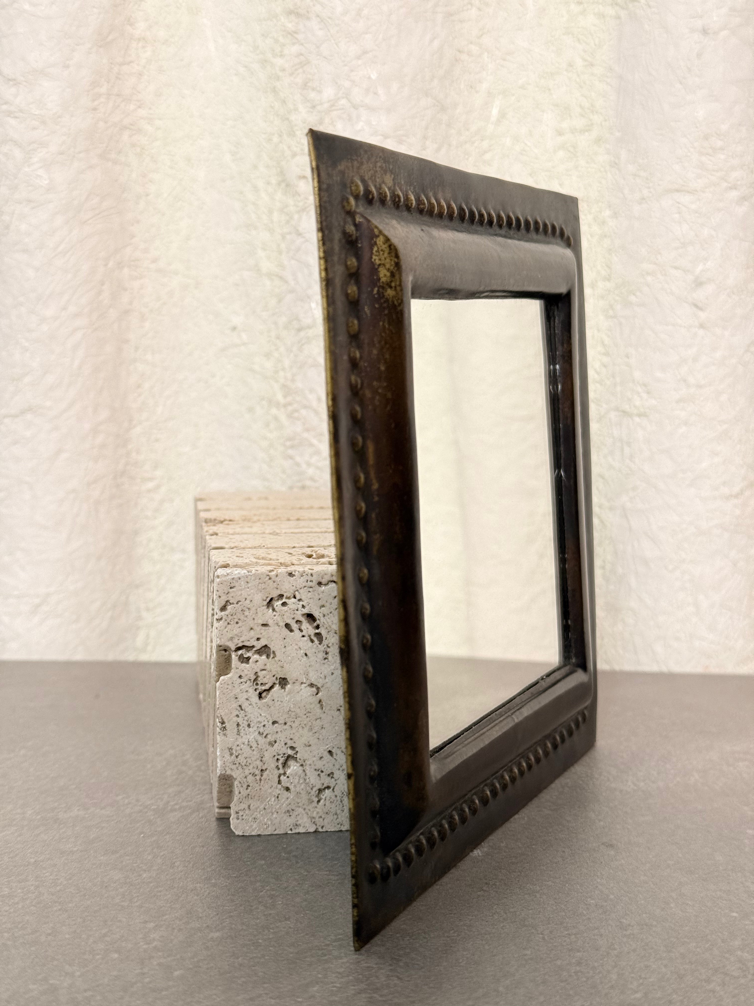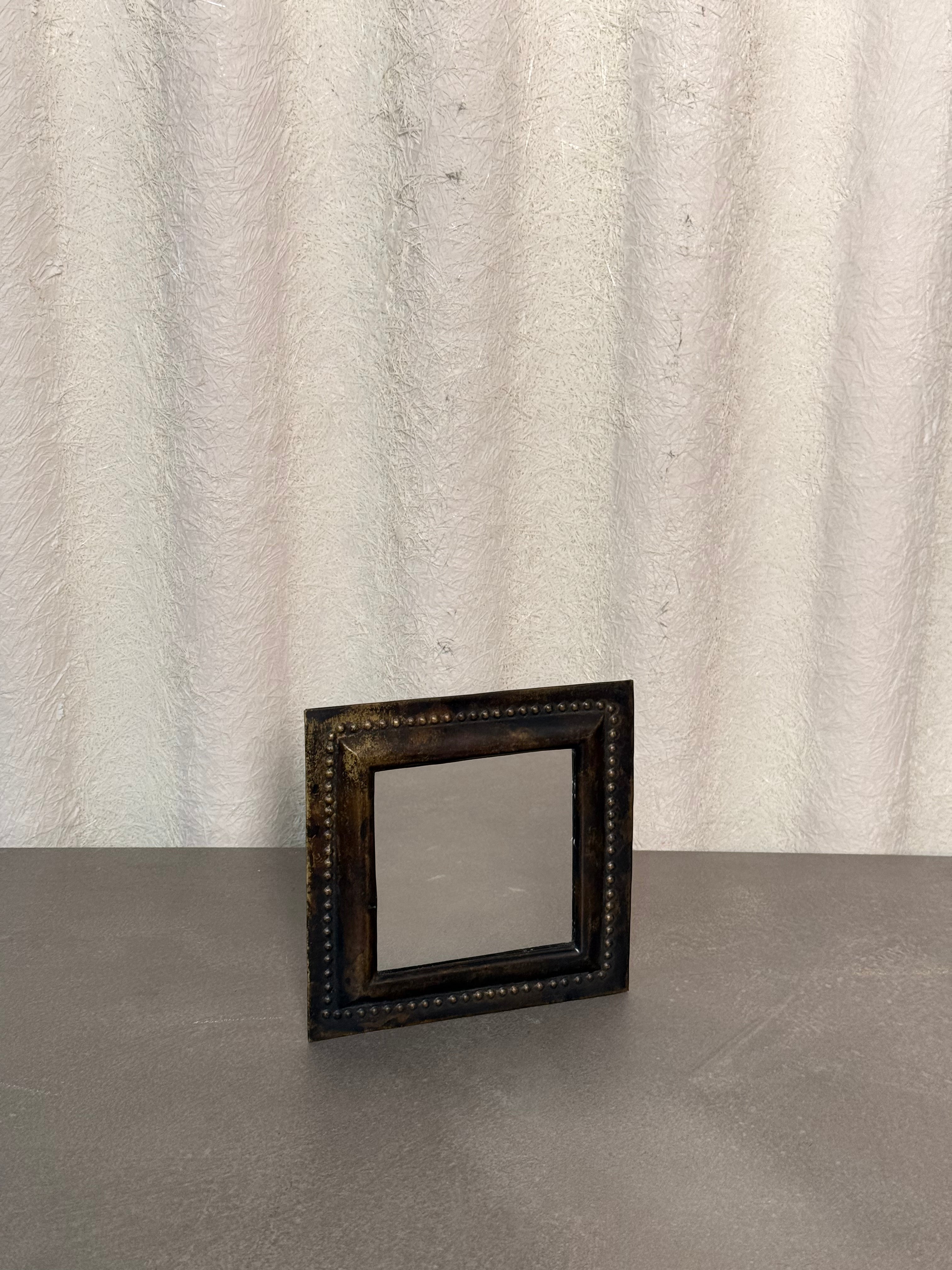 A small square mirror framed in embossed brass adds the perfect vintage touch to any gallery wall or shelf display.