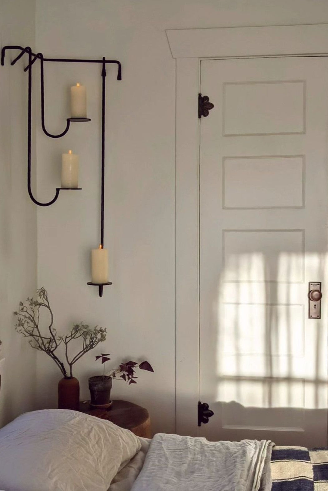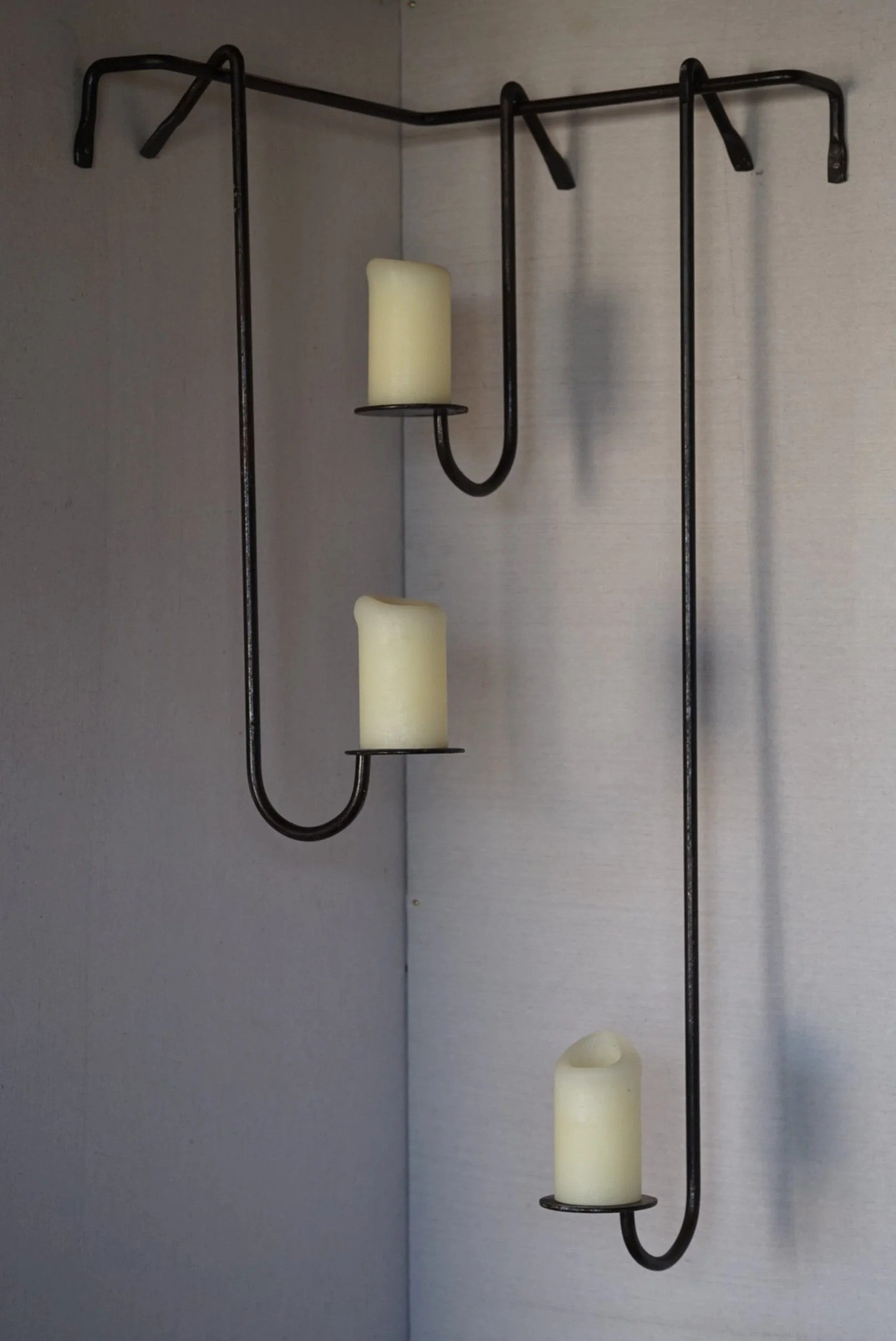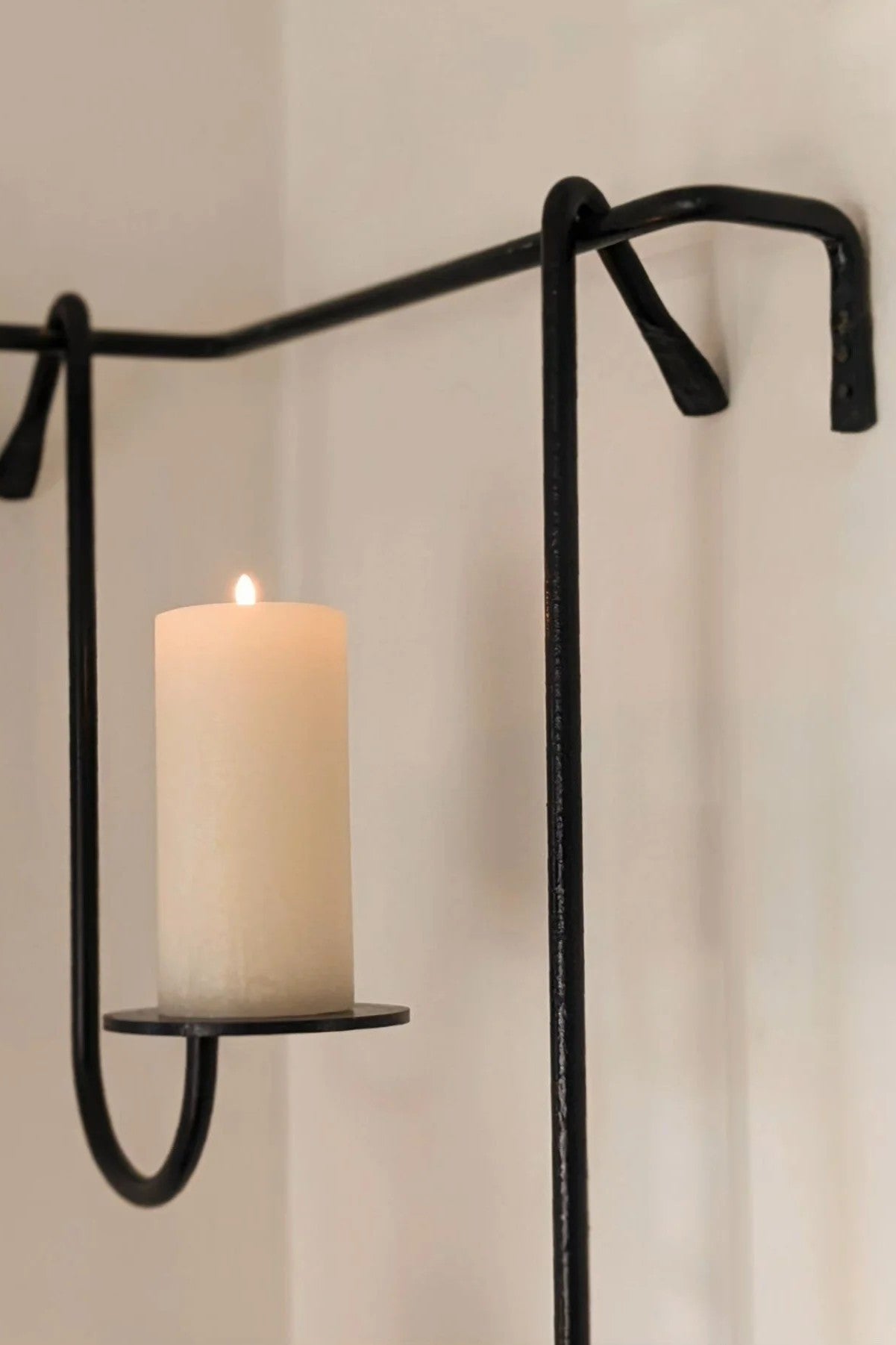 Wrought iron wall-mounted candle holder featuring a sculptural, linear design with three staggered arms. Finished in a matte black tone, this piece adds architectural interest while remaining minimal and understated. Designed to hold pillar candles, it creates soft ambient light and visual rhythm on the wall.