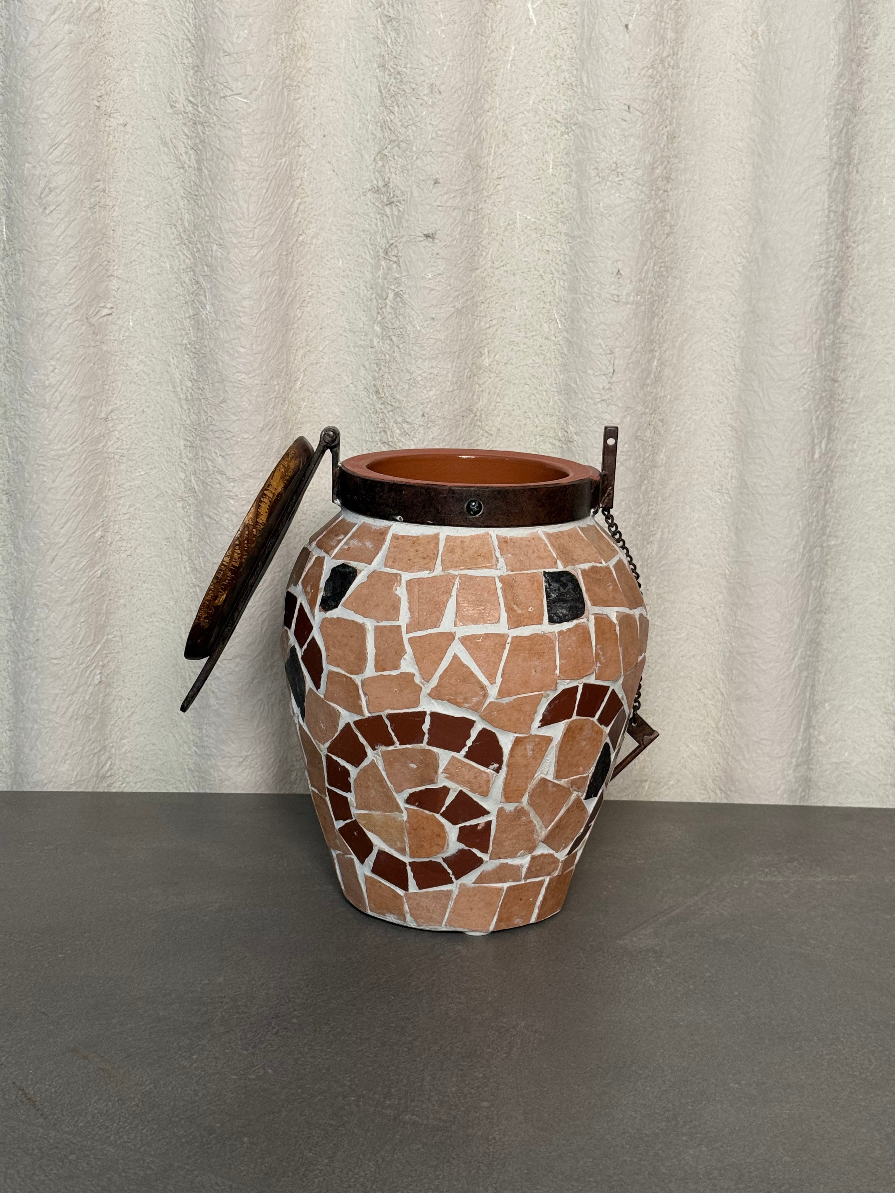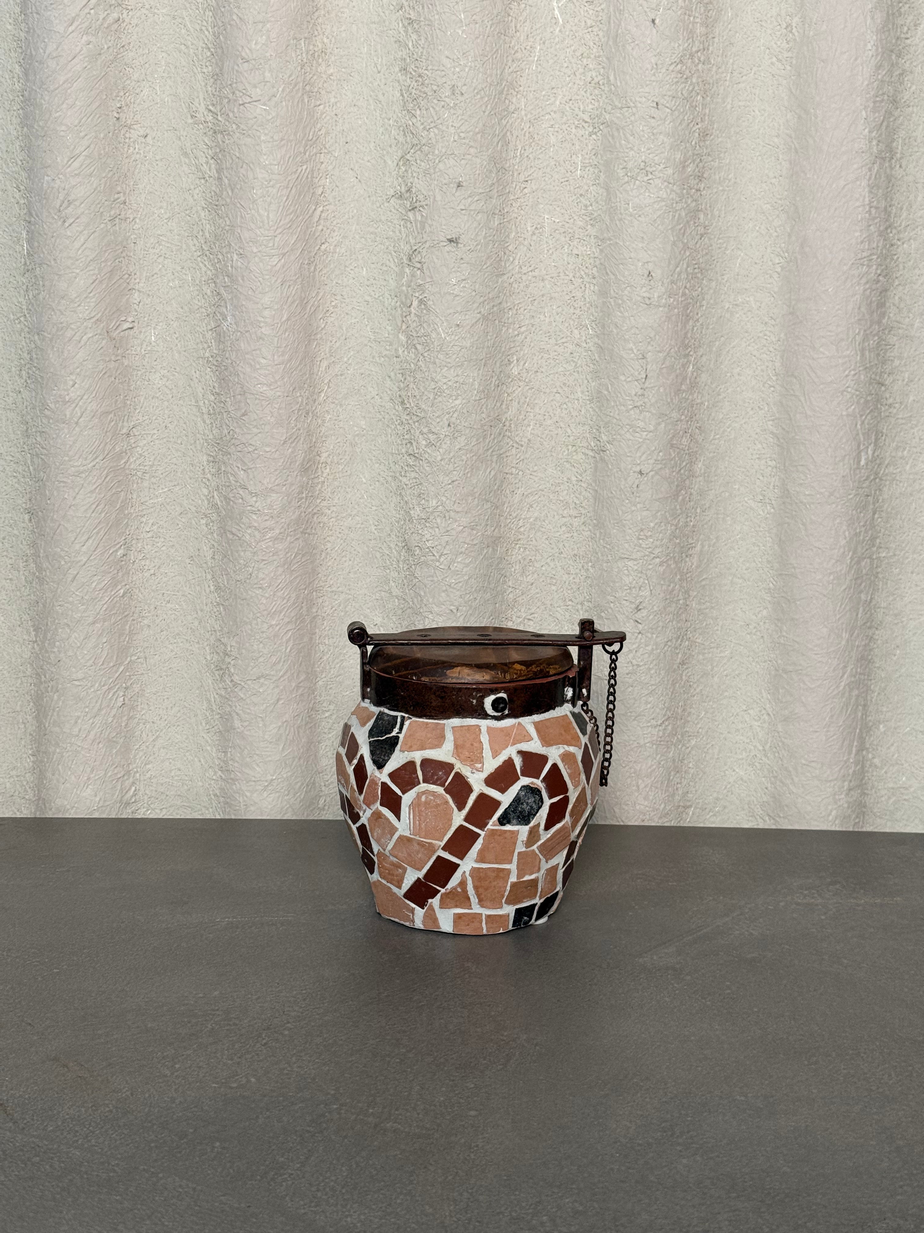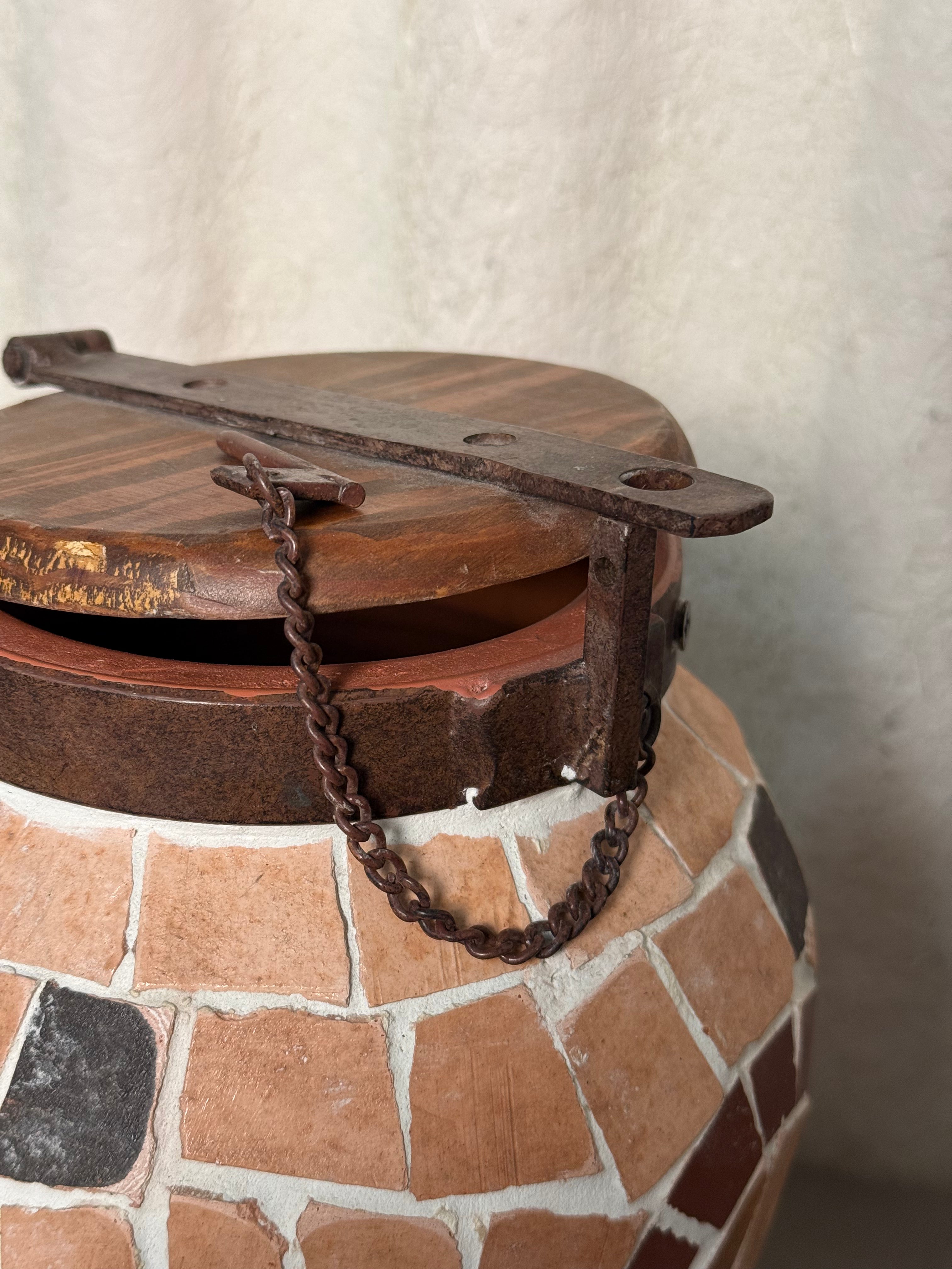 Handcrafted lidded jars featuring a unique mosaic pattern made of terracotta and stone tiles. Complete with original wood and metal lid and locking system.