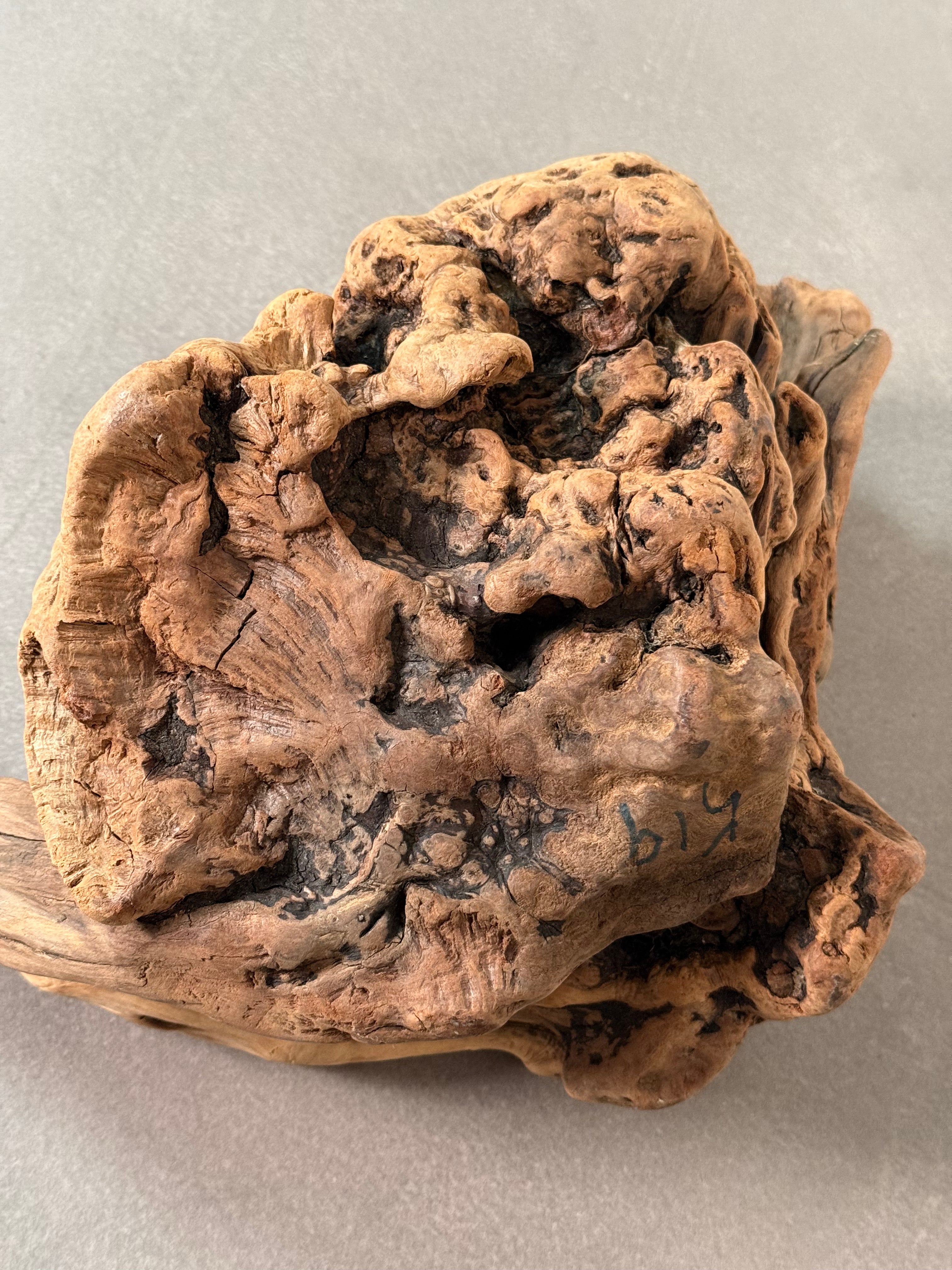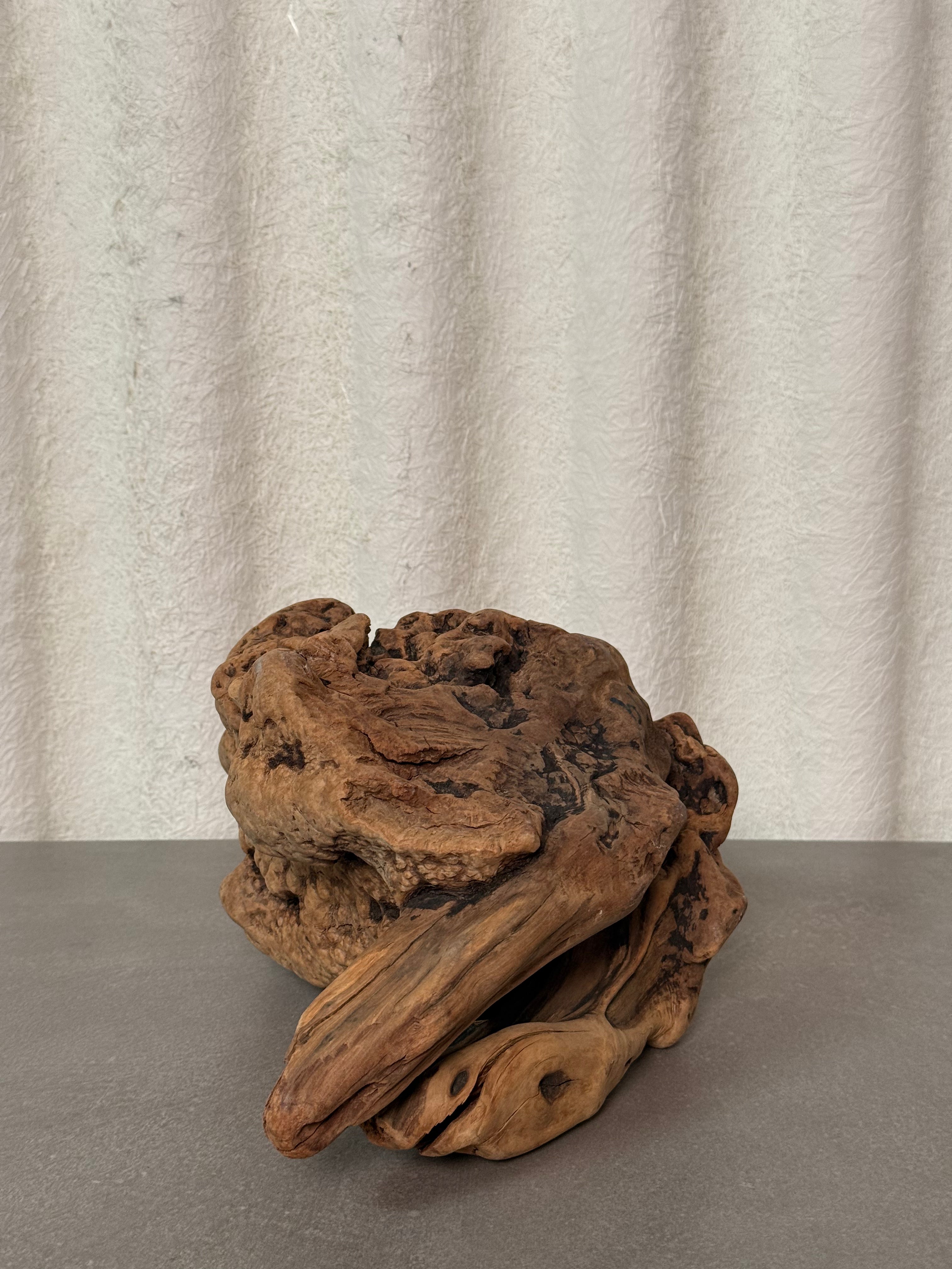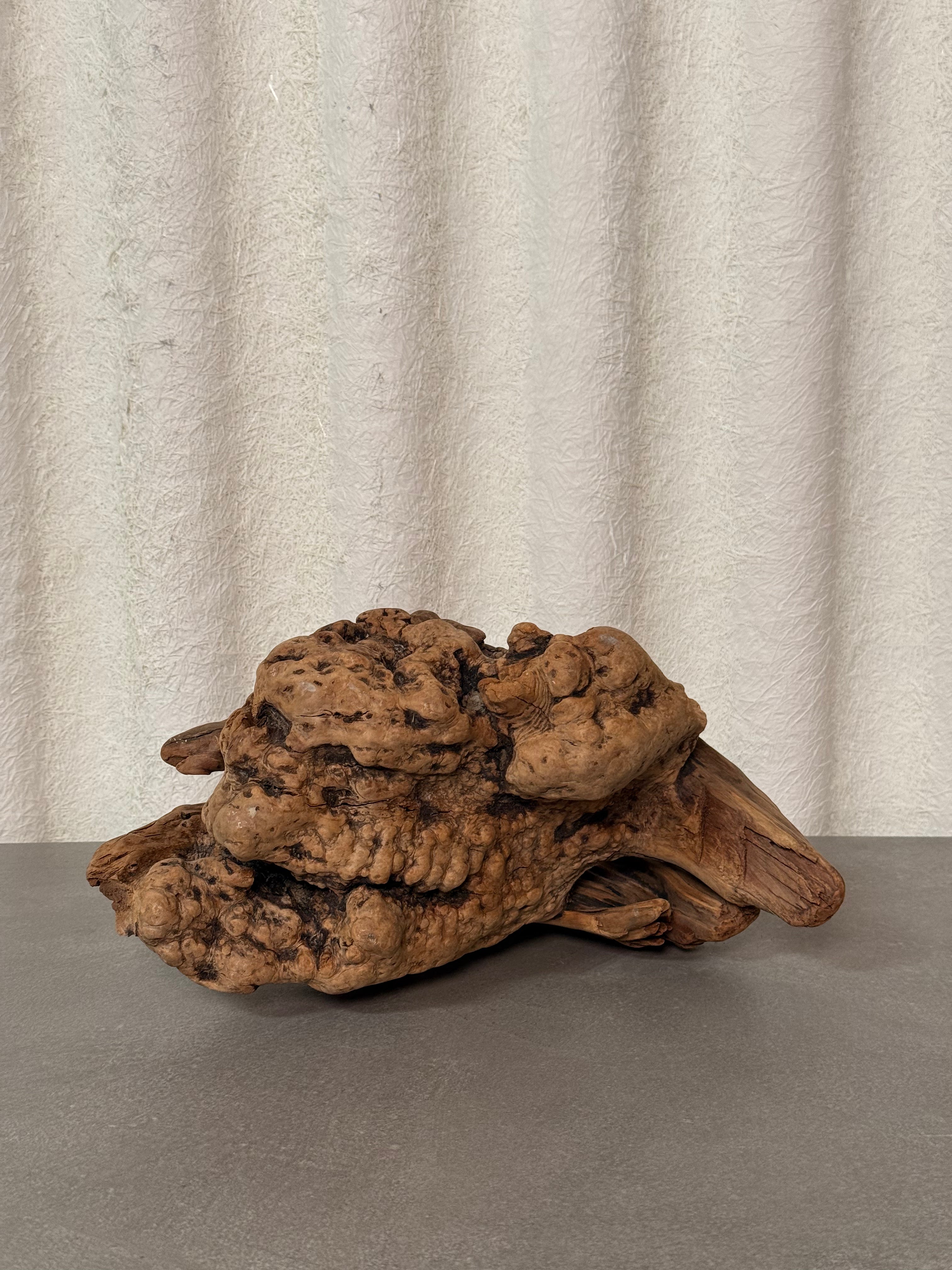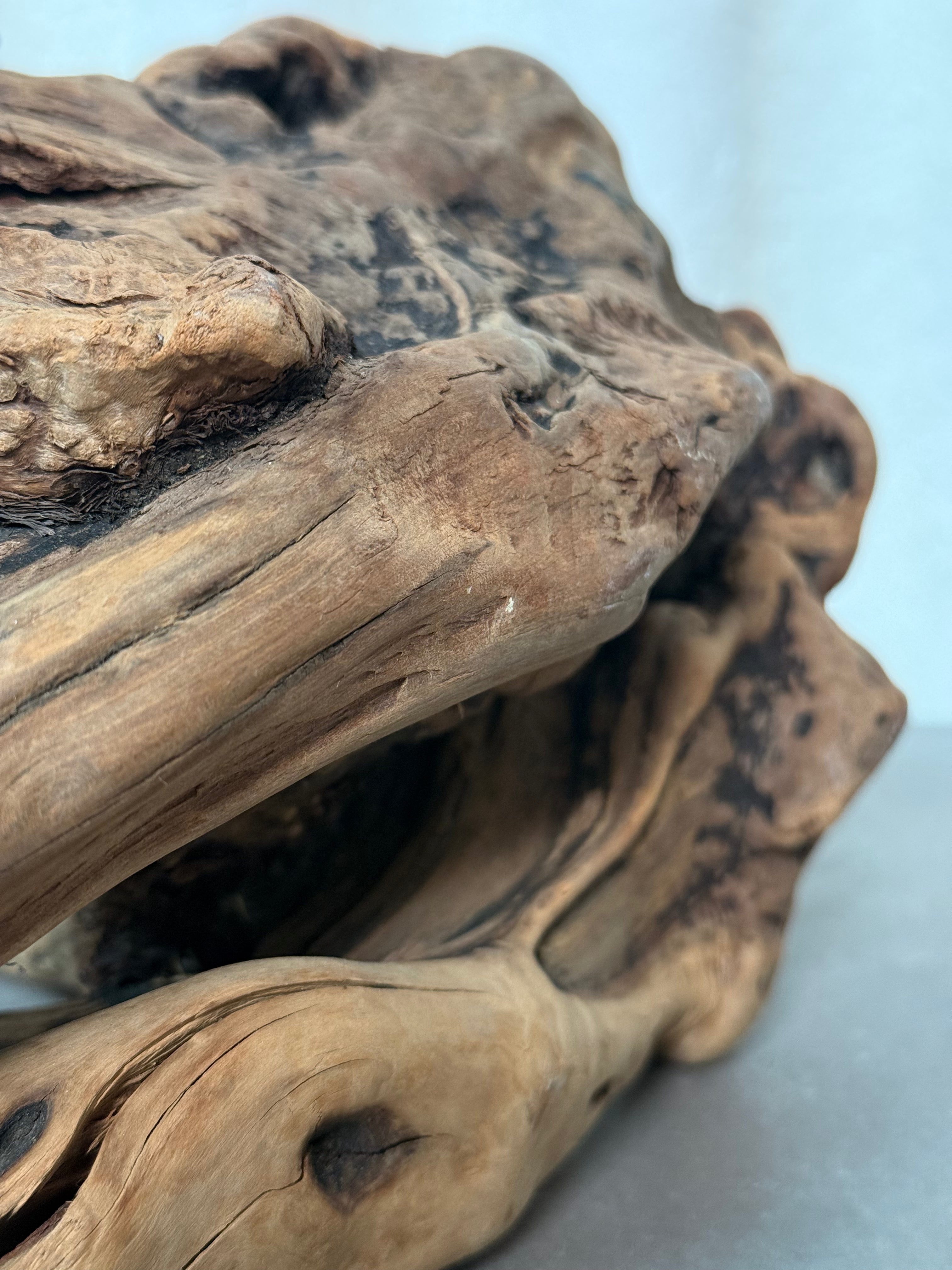 Organic burl wood sculpture featuring dense, highly figured grain and natural knot formations. The piece displays complex growth patterns, deep fissures, and sculptural protrusions formed by the tree’s natural development.