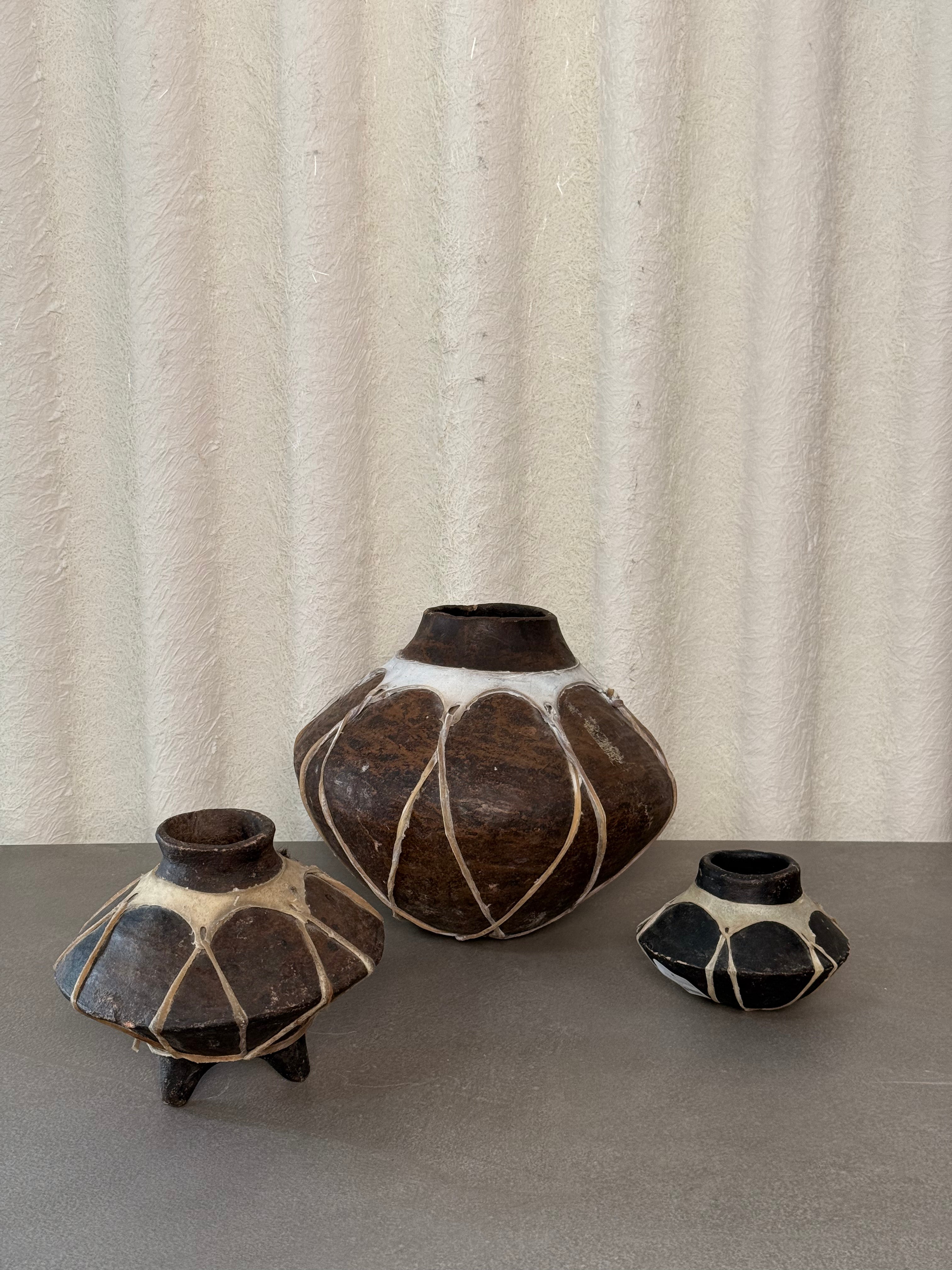 Traditional Tarahumara (Rarámuri) olla pots, hand-formed with natural clay and accented with rawhide ties. These rustic vessels reflect the enduring pottery traditions of the Rarámuri people of northern Mexico. Each pot carries unique variations in texture, finish, and form, showcasing their handmade character.