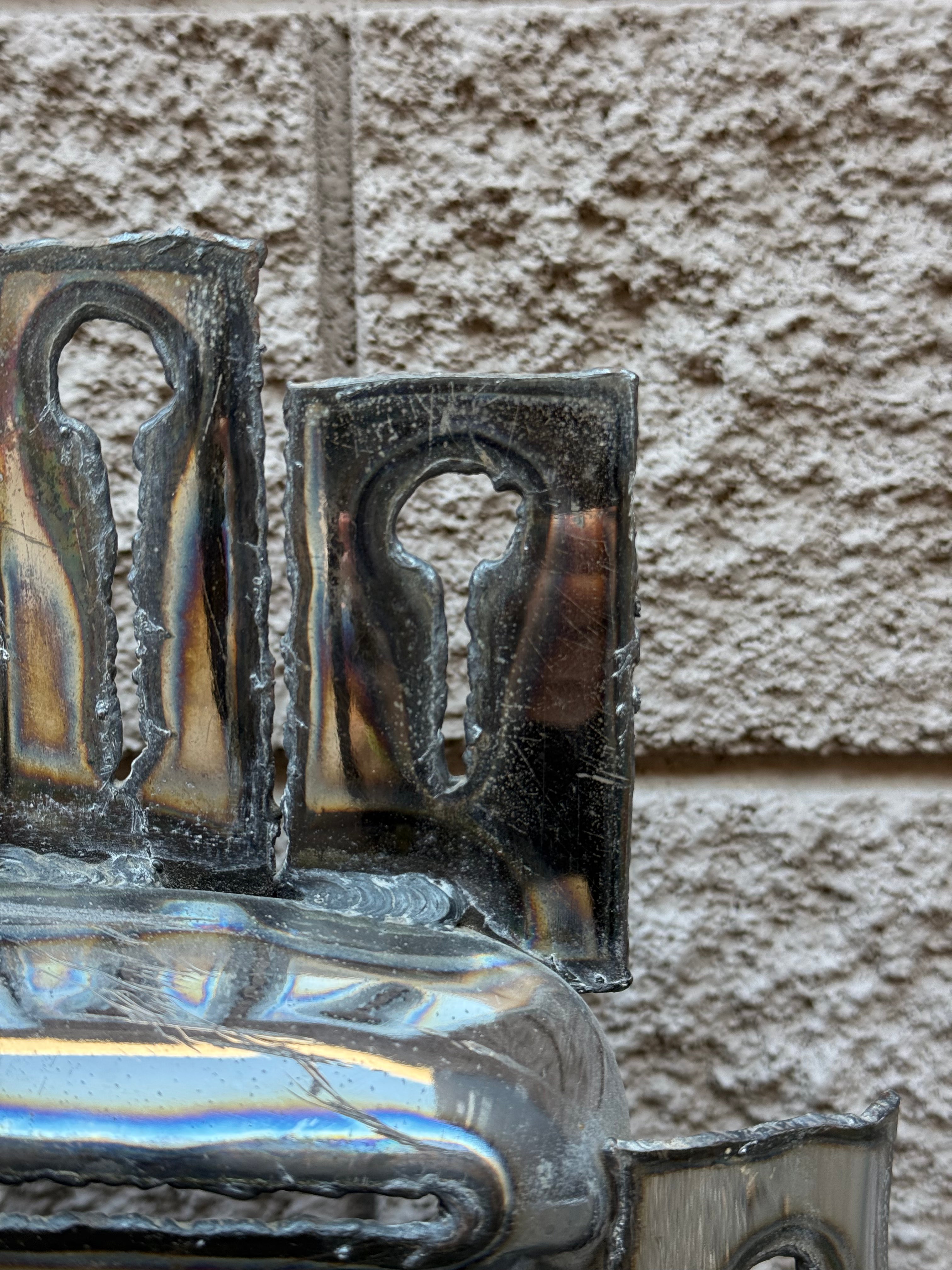 Sculptural ceramic artwork by Todd Pendleton, dated 1972. Gloss-glazed ceramic with bold architectural geometry, pierced openings, and layered abstract forms. The high-gloss surface and complex construction reflect experimental studio ceramics of the early 1970s. A striking one-of-a-kind sculptural piece with strong visual presence.